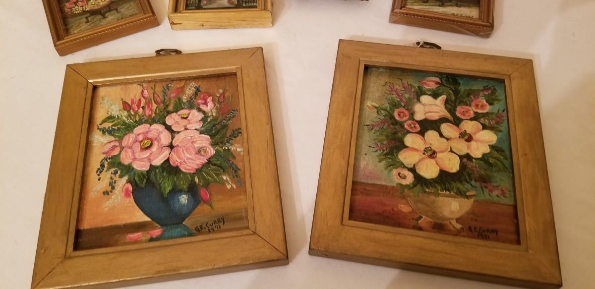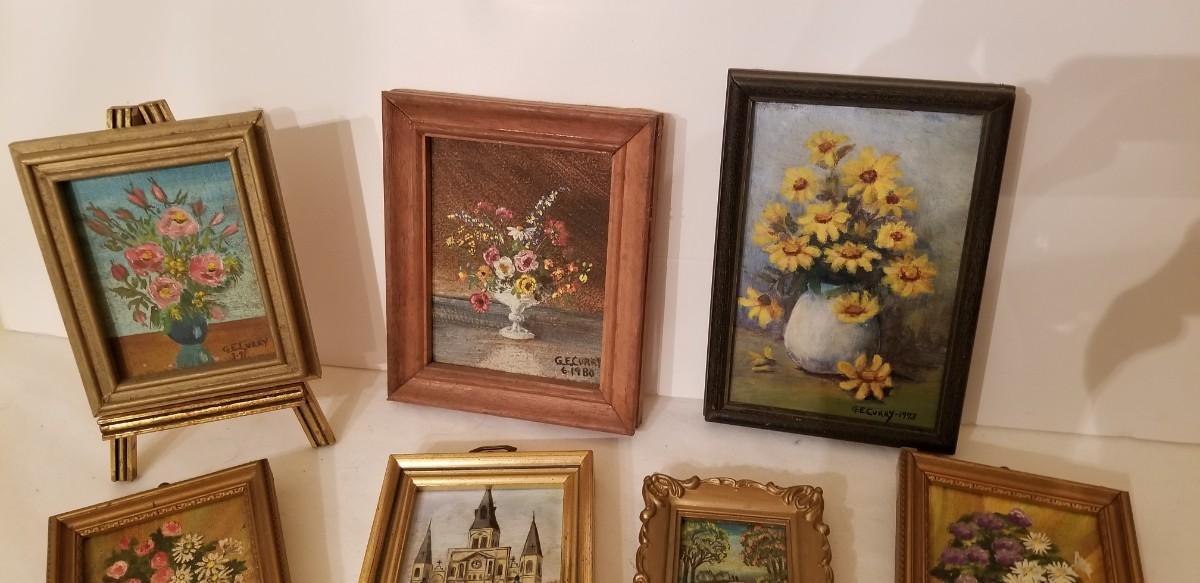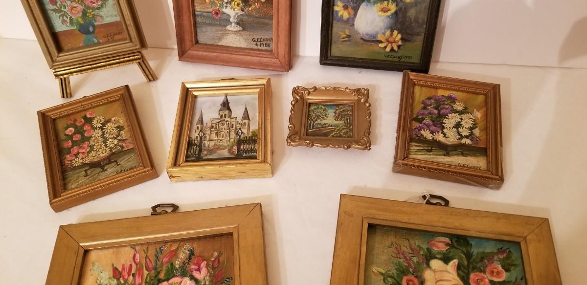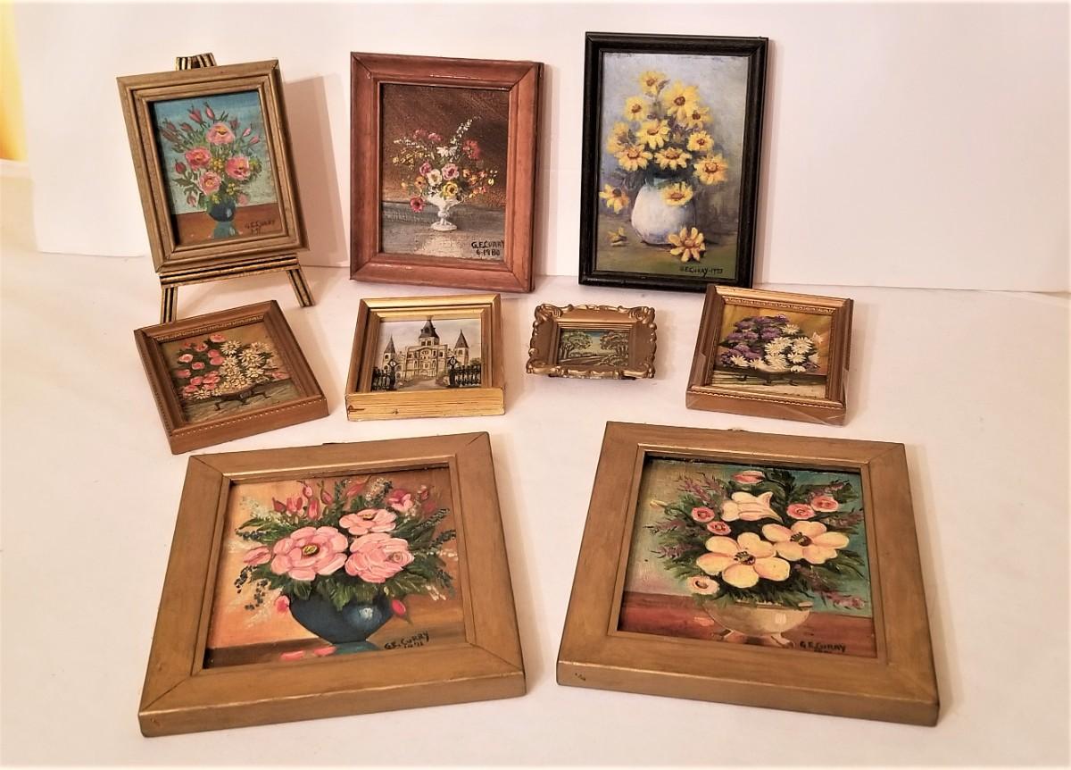Lot of 9 original small oil paintings - mostly floral, one very well-executed painting of the St. Louis Cathedral. All fremaed. The larger ones are 7.5" x 6.5". The smaller ones average 3.25" x 3.25". Good dealer lot here.