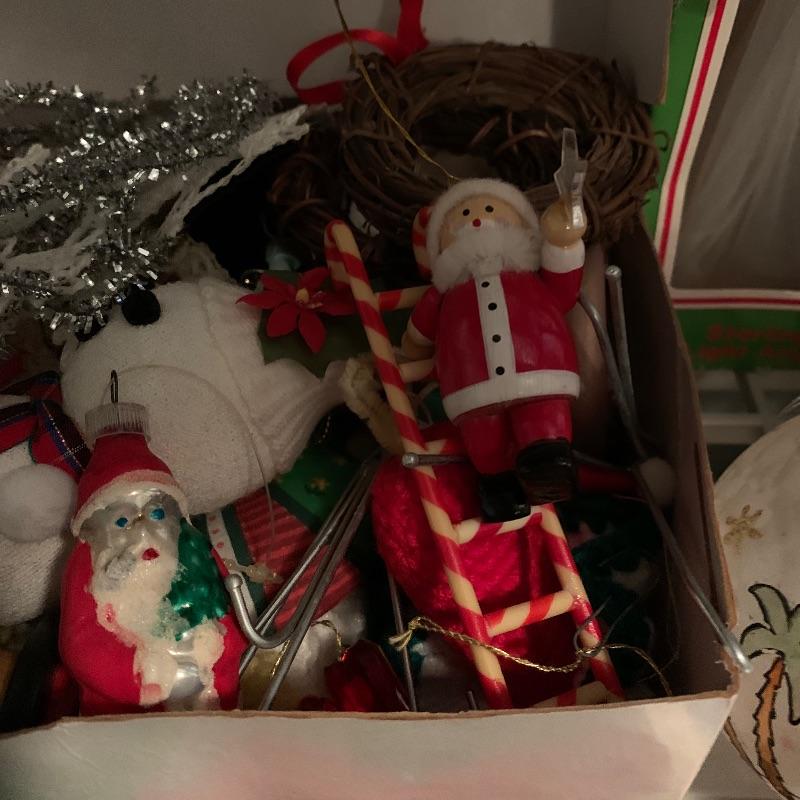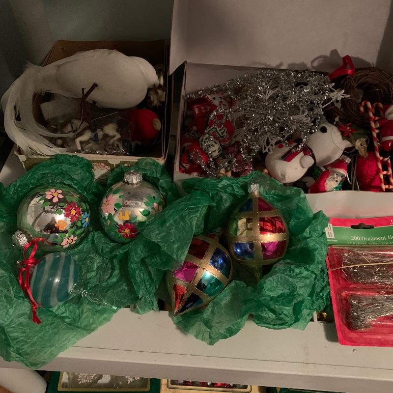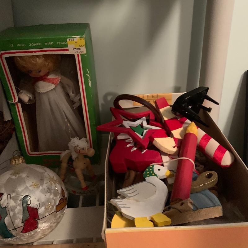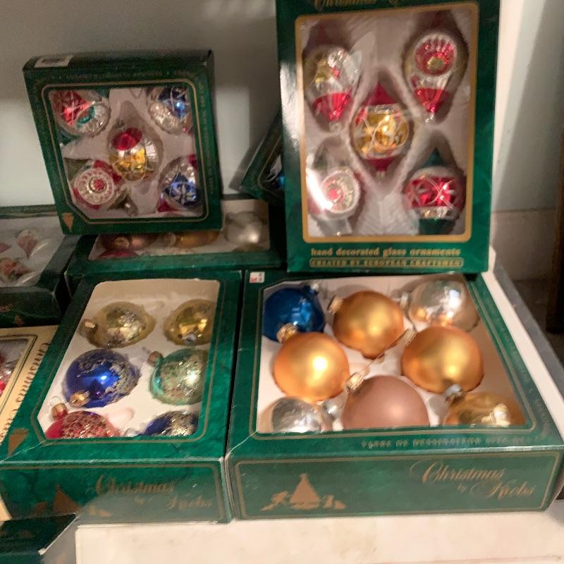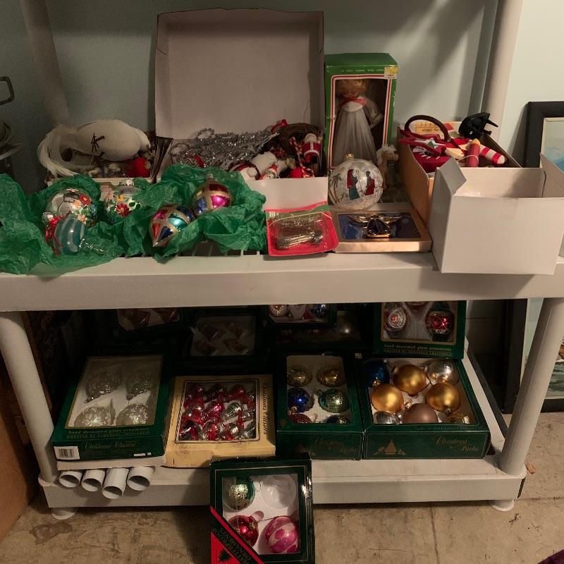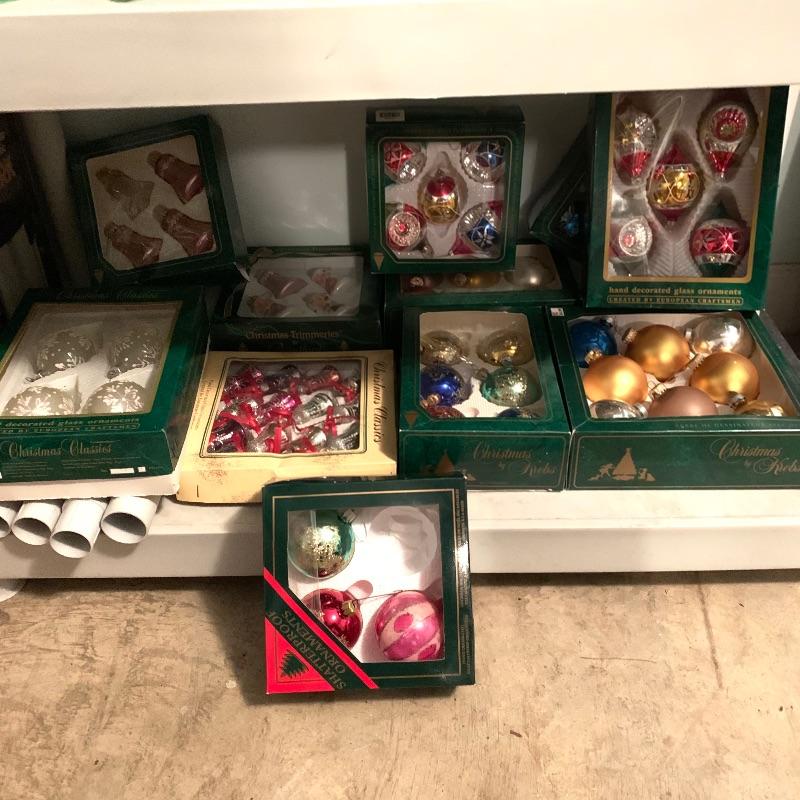 Two shelves of ornaments to include, wood, fabric, metal and ball ornaments. Nine box sets along with hand blown glass ornament and stained glass angel ornament. Some are potentially vintage but all are sweet seasonal treasures. Shipping available.