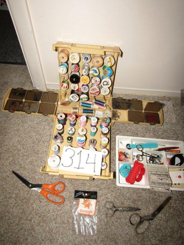 LOT 314 FOLDING SEWING BOX WITH NOTIONS