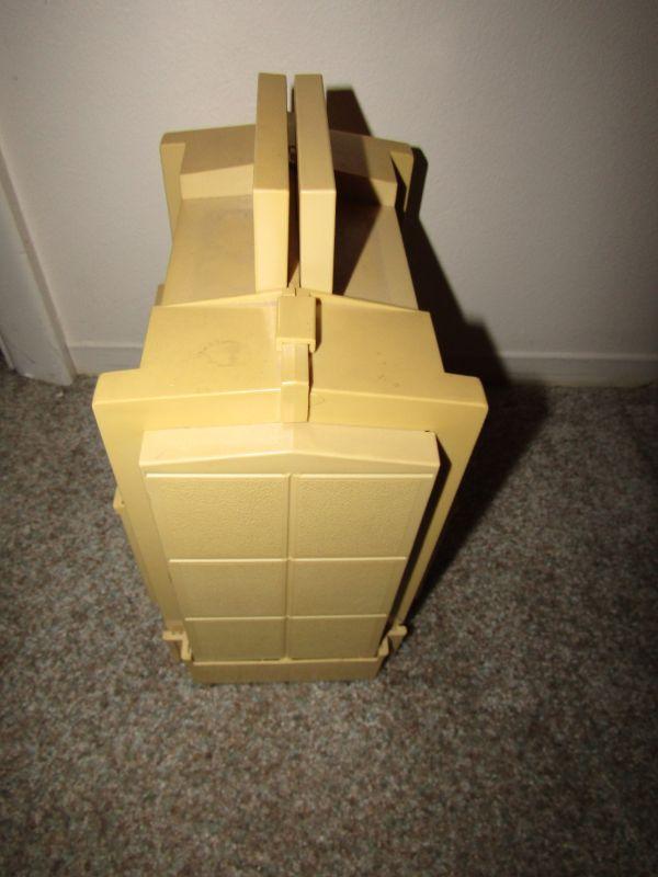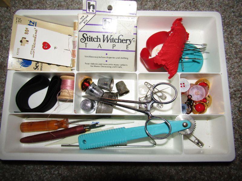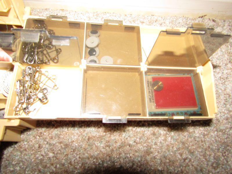 THIS IS PRETTY NEAT! IT HOLDS MANY SPOOLS OF THREAD AND HAS 12 FLIP-UP LIDDED COMPARTMENTS FOR NOTIONS. IT FOLDS UP INTO A NEAT CARRY CASE