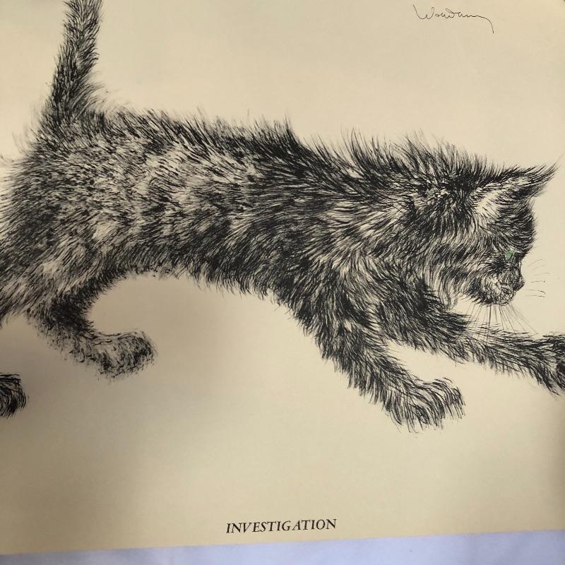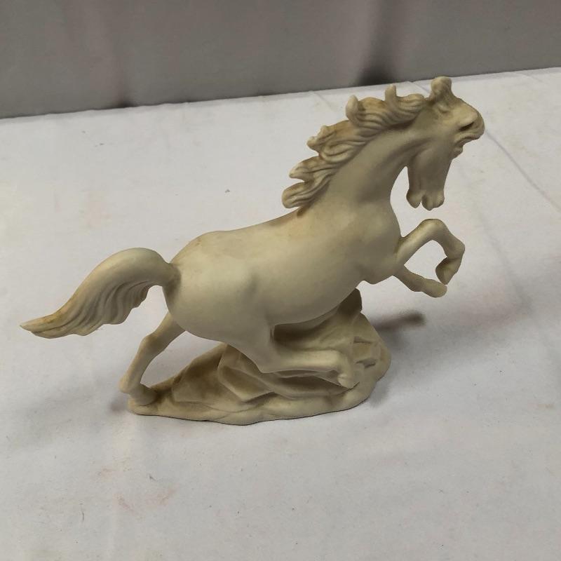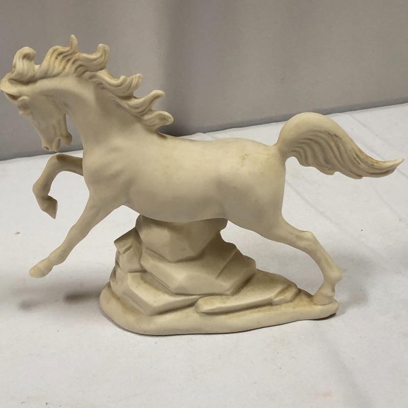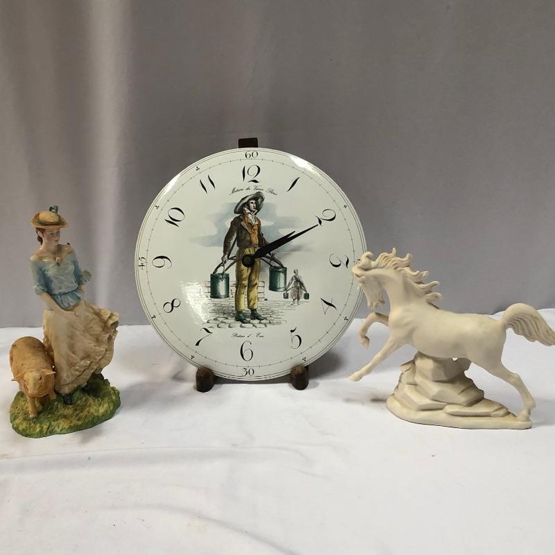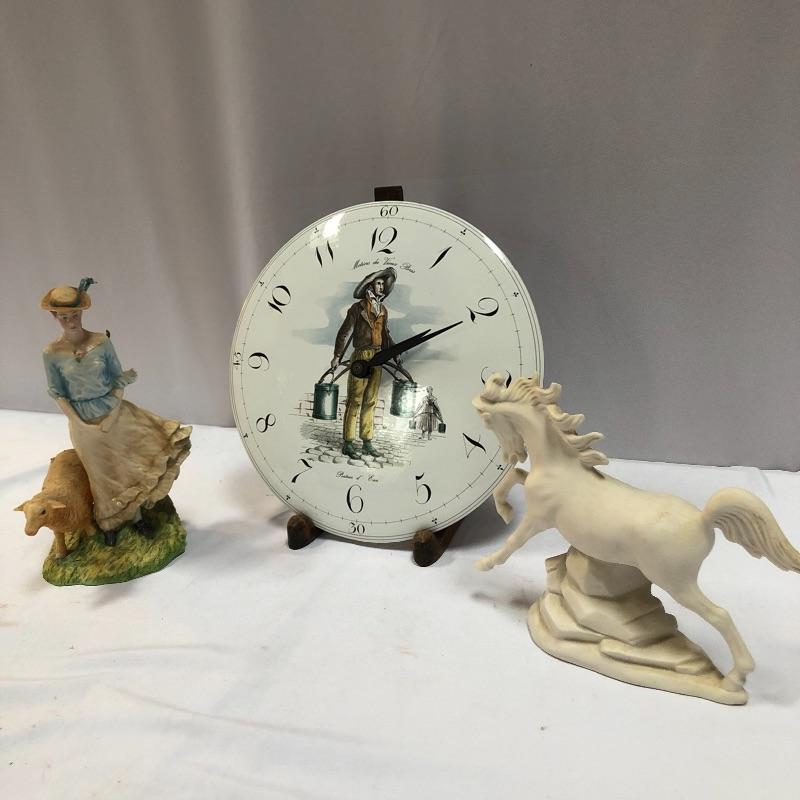 This lot includes a Clock, a woman and sheep figurine, a horse figurine, and two cat prints. Prints are 17“ x 14“. Shipping available.