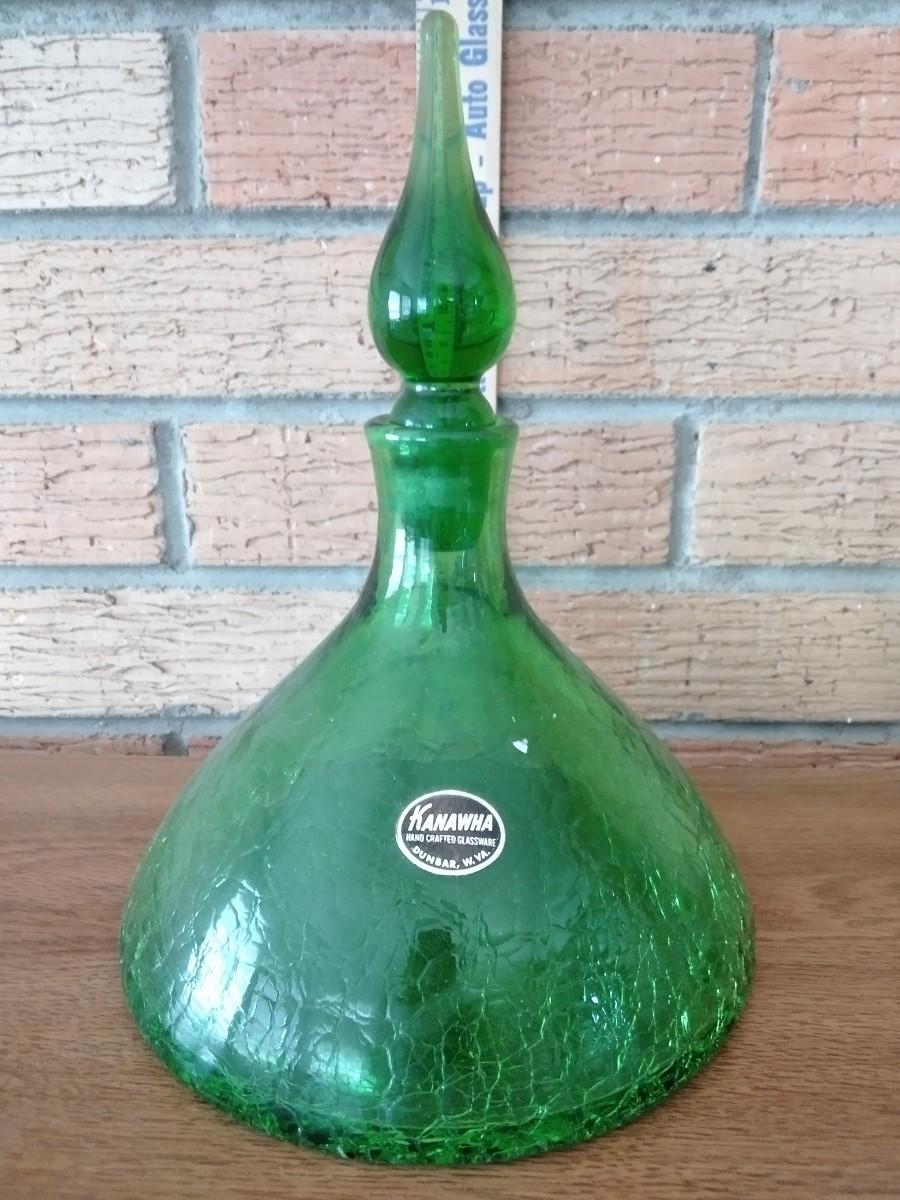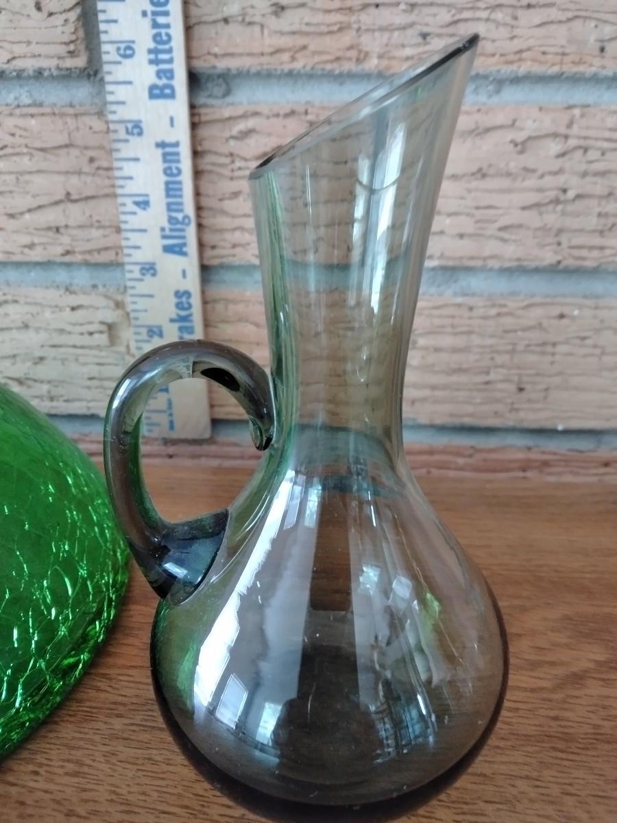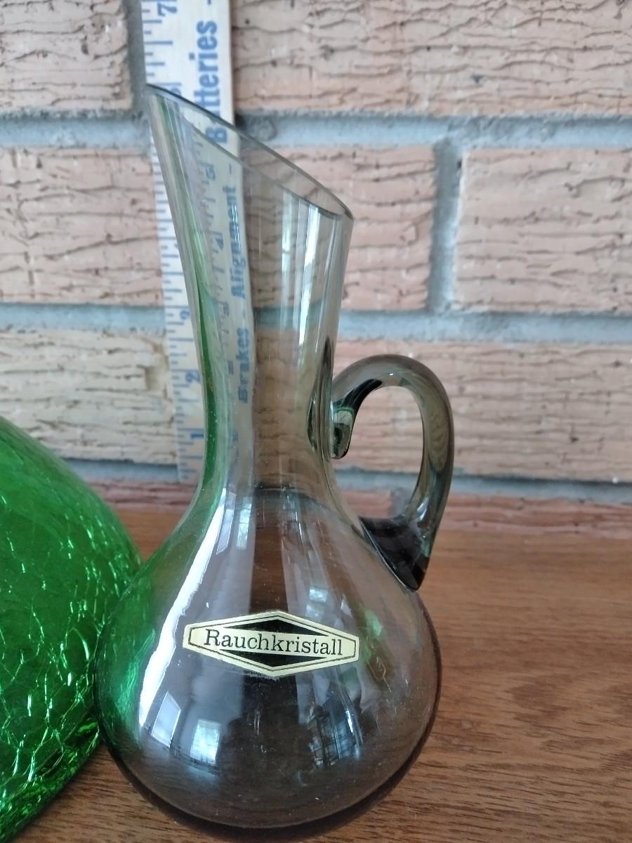 GREEN FLAT BOTTOMED CRACKLE GLASS KANAWHA DECANTER AND A SMALL RAUCHKRISTALL SMOKED GLASS PITCHER.