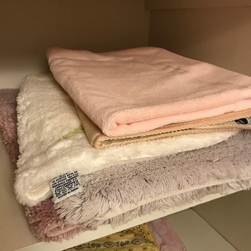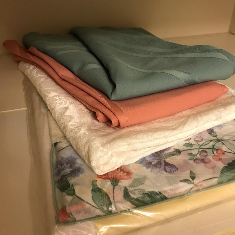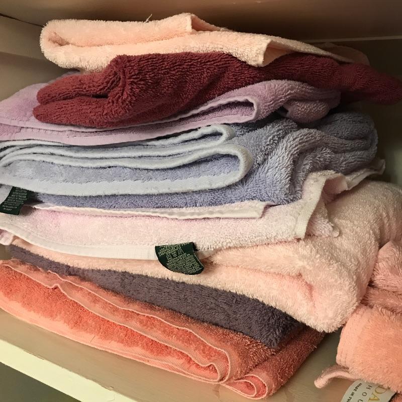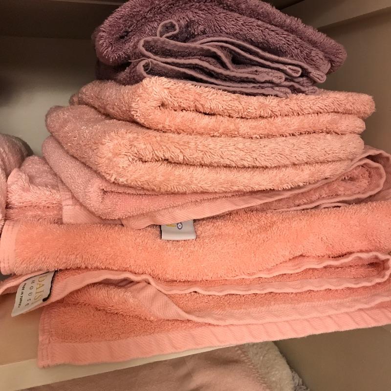 Here you have tablecloths, place-mats, and microfiber cleaning cloths for the kitchen. Then we’ve included bath towels, most of which are Ralph Lauren and Daisy House, hand towels and rugs for the bathroom. If you like every shade of pink then this is your lot. No shipping.