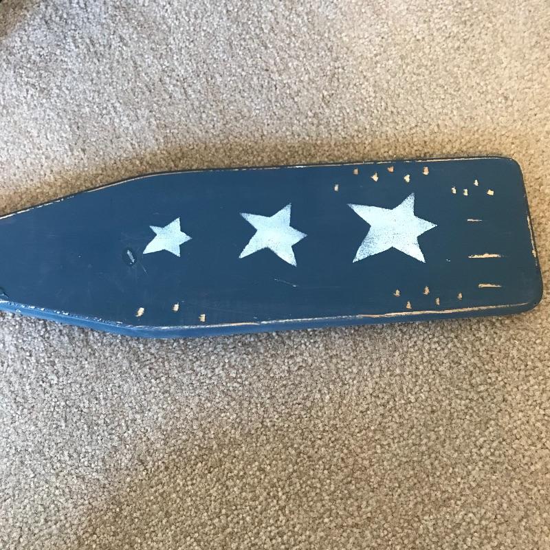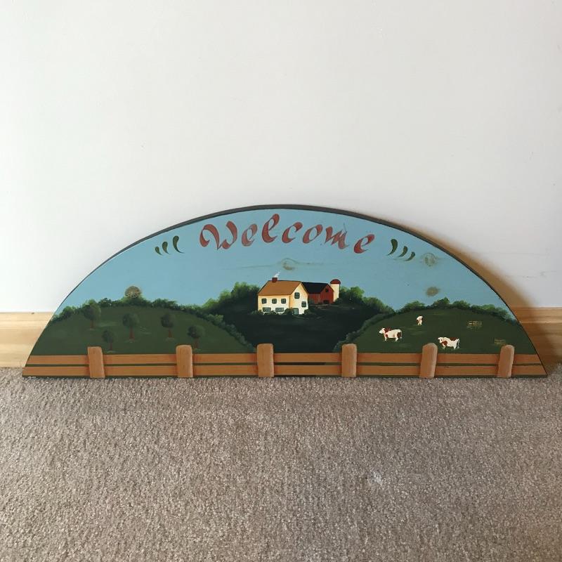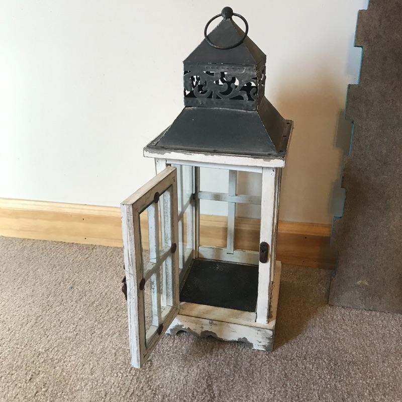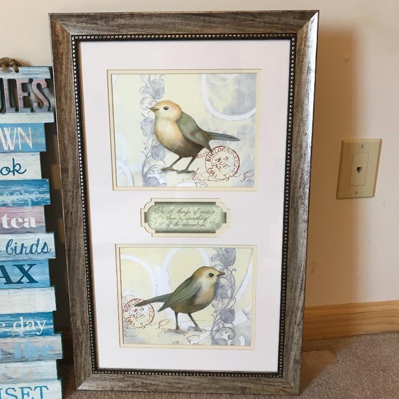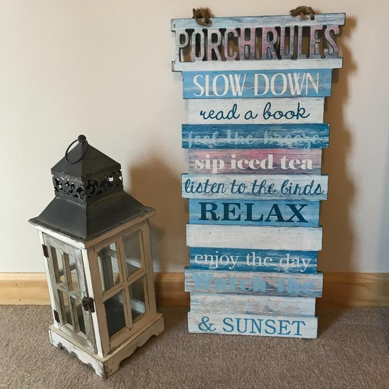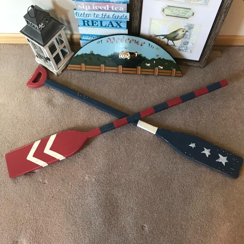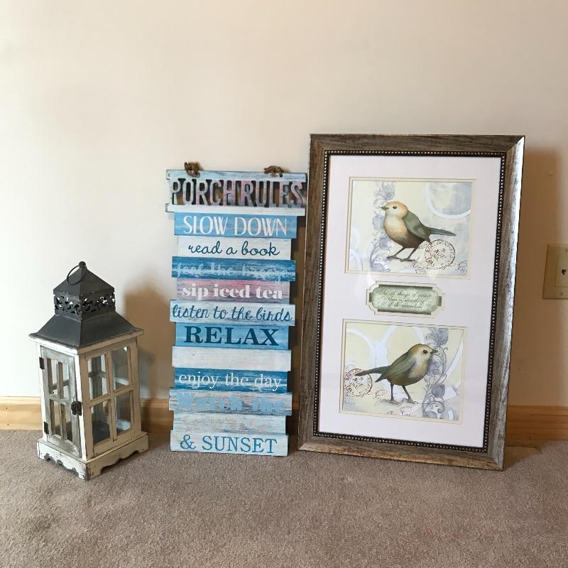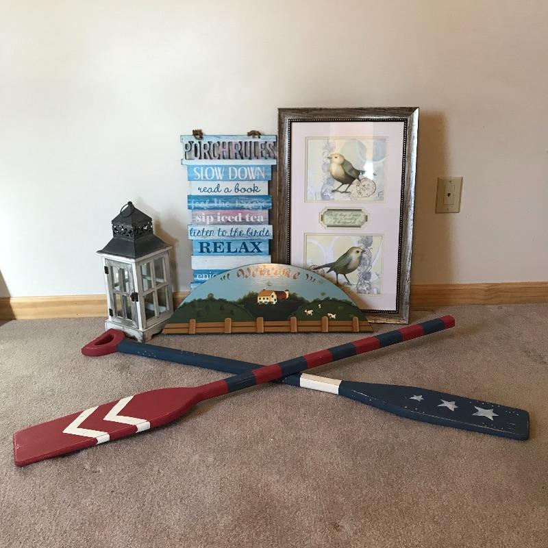 Add this lot to make your home sweet home complete! Two separate 4’ long painted wooden paddles with a red, white & blue theme, the perfect porch sign and framed bird art. The framed bird art is behind glass in a metallic painted 17” x 27” frame, material of frame is unclear, quite possibly a high quality plastic. Lot also features a country scene wooden “Welcome” sign and a distressed white wooden lantern with glass windows and a metal roof. Local pick up only.