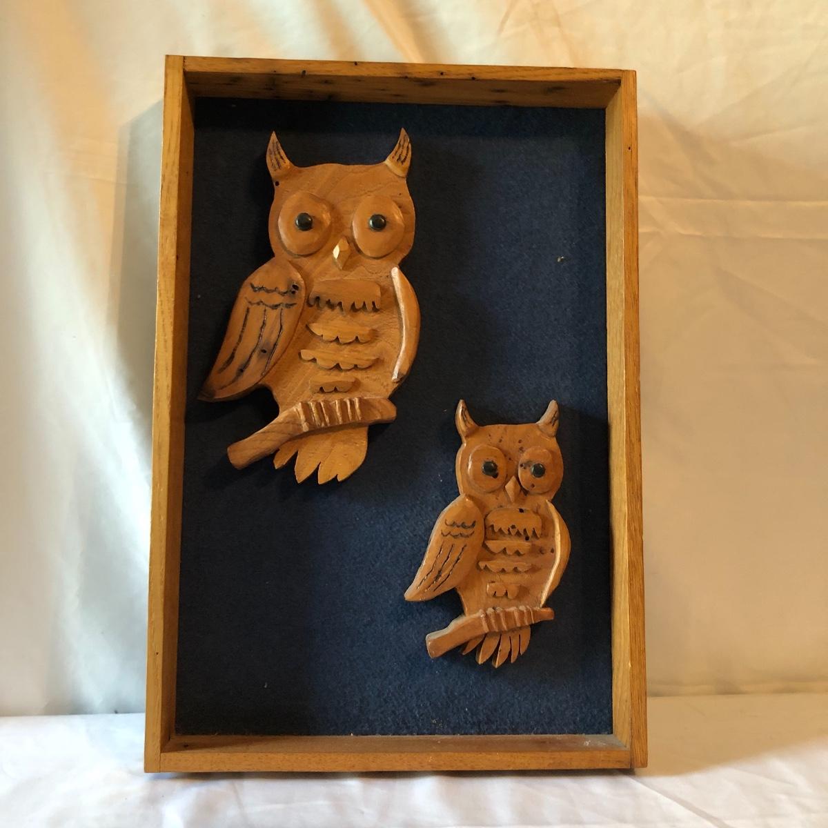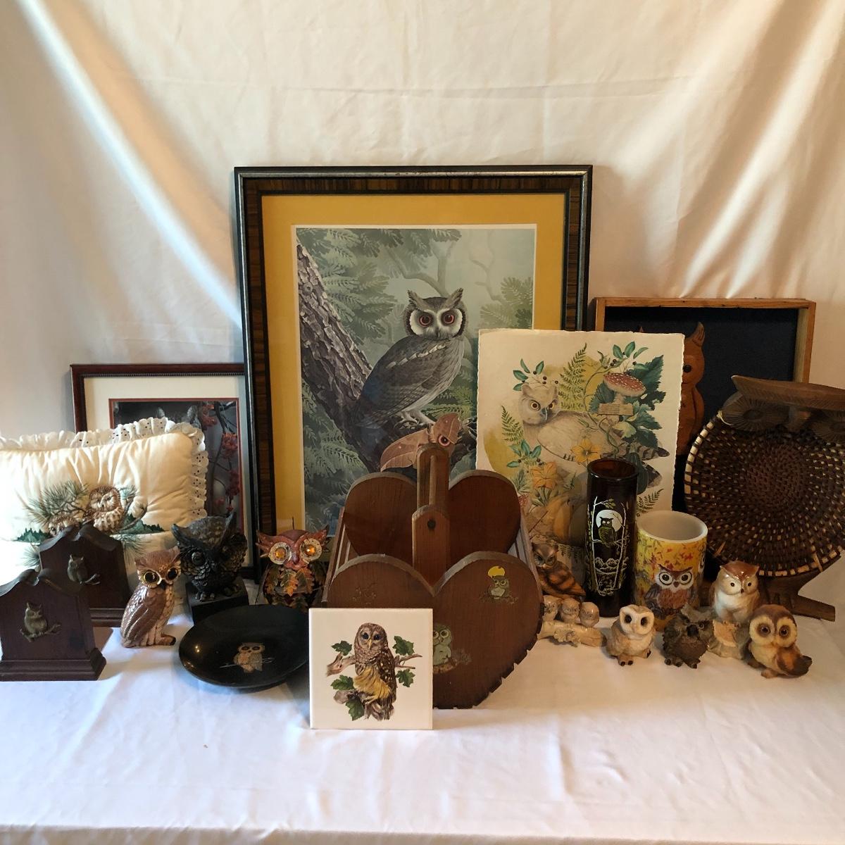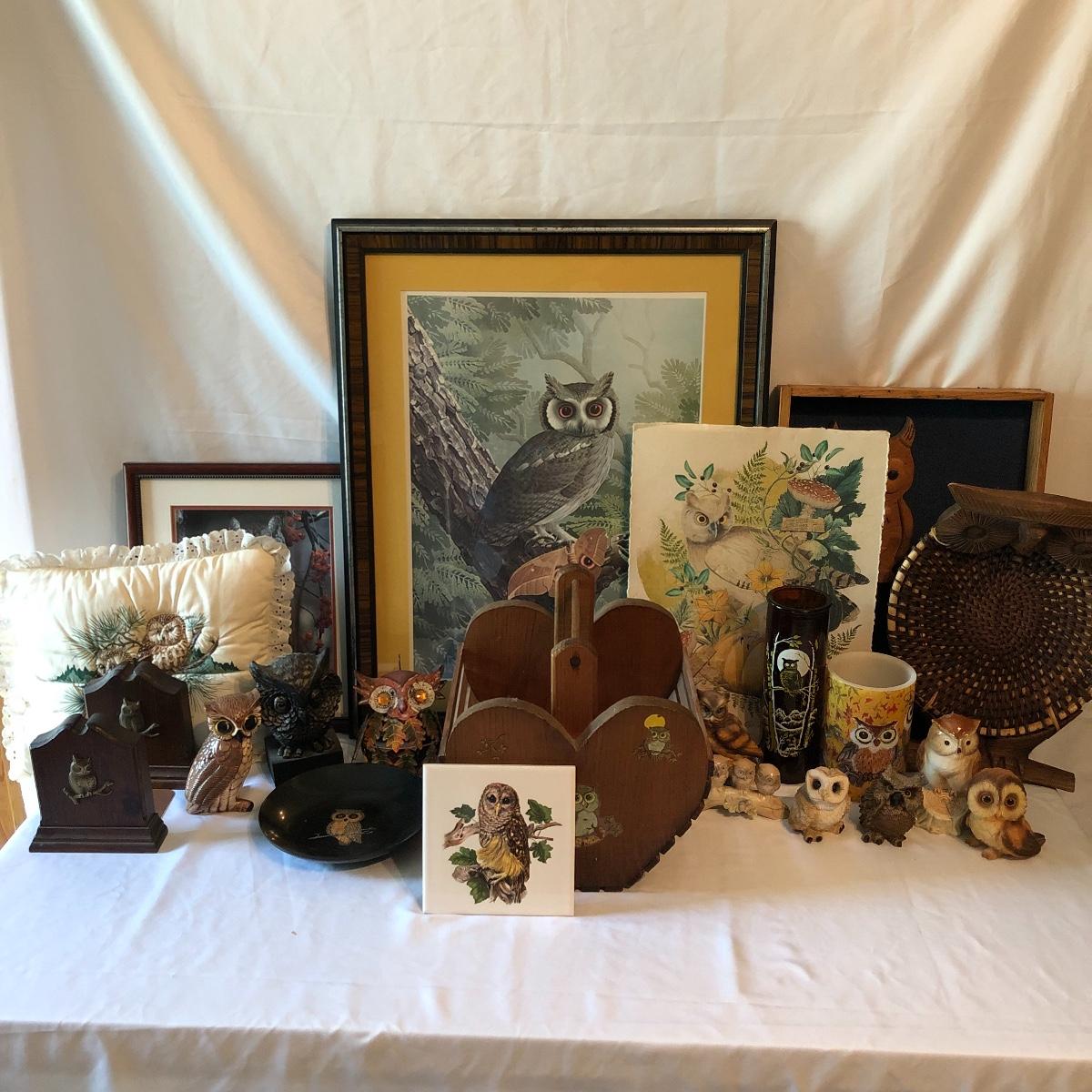 You will give a hoot with this large collection of owl decor. This lot includes two pieces of framed art, wooden box art, wooden and woven owls, wooden bookends, three pillows, wooden basket, three resin and five ceramic figurines, tea light holder, inlaid Courac bowl and more. Largest frame measures 20” x 26”.