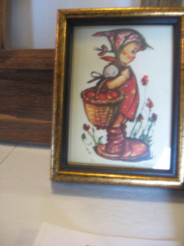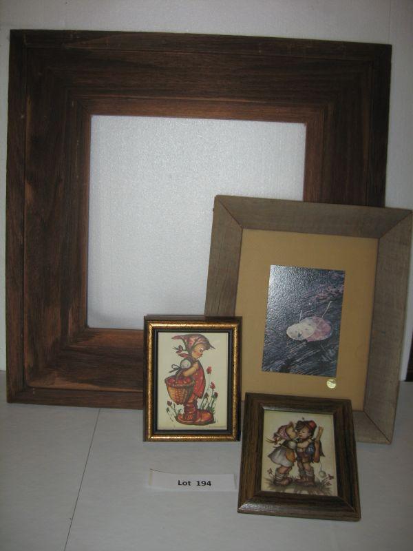 Two barn wood picture frames 20.5”x20.5” & 10”x11” a vintage W. Germany Bertha Hummel print and a vintage print (signed Evans), both 5”x6.5”