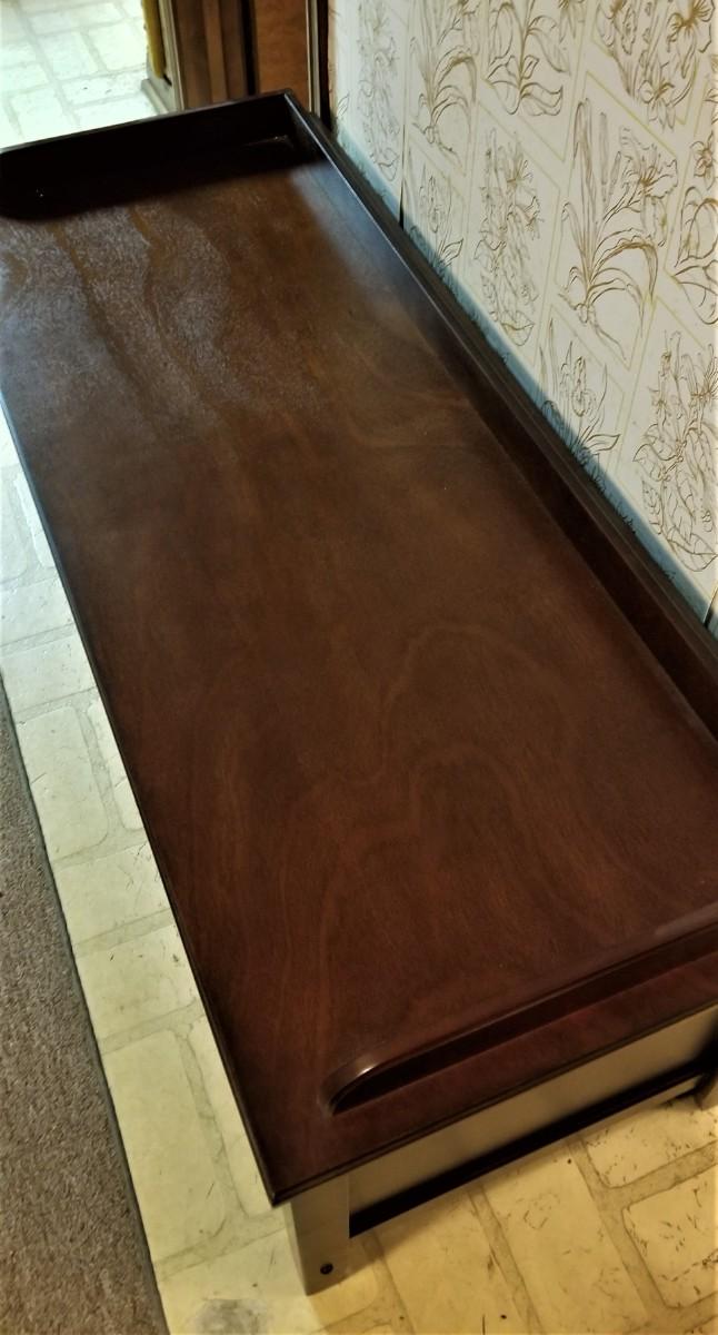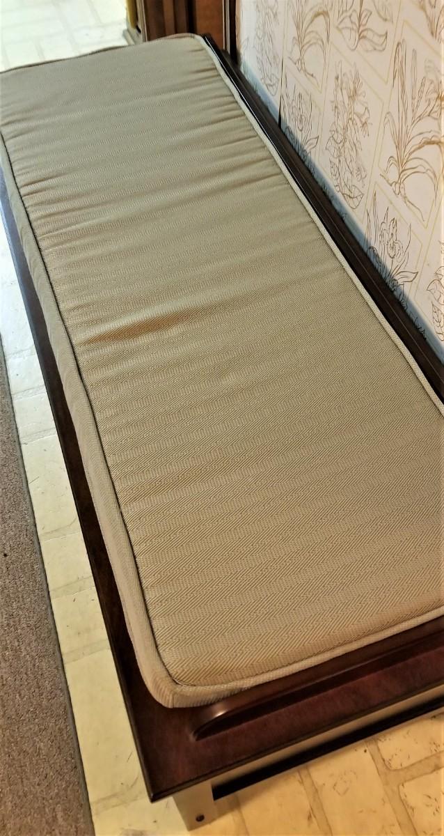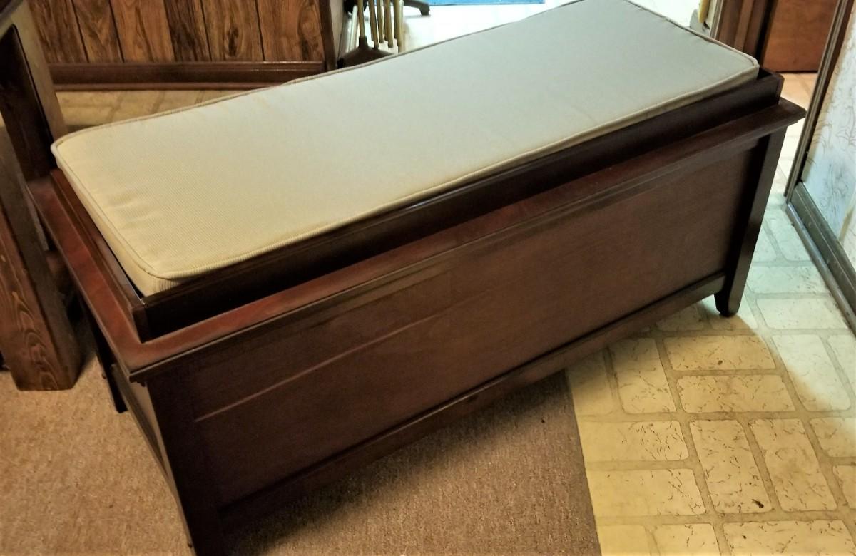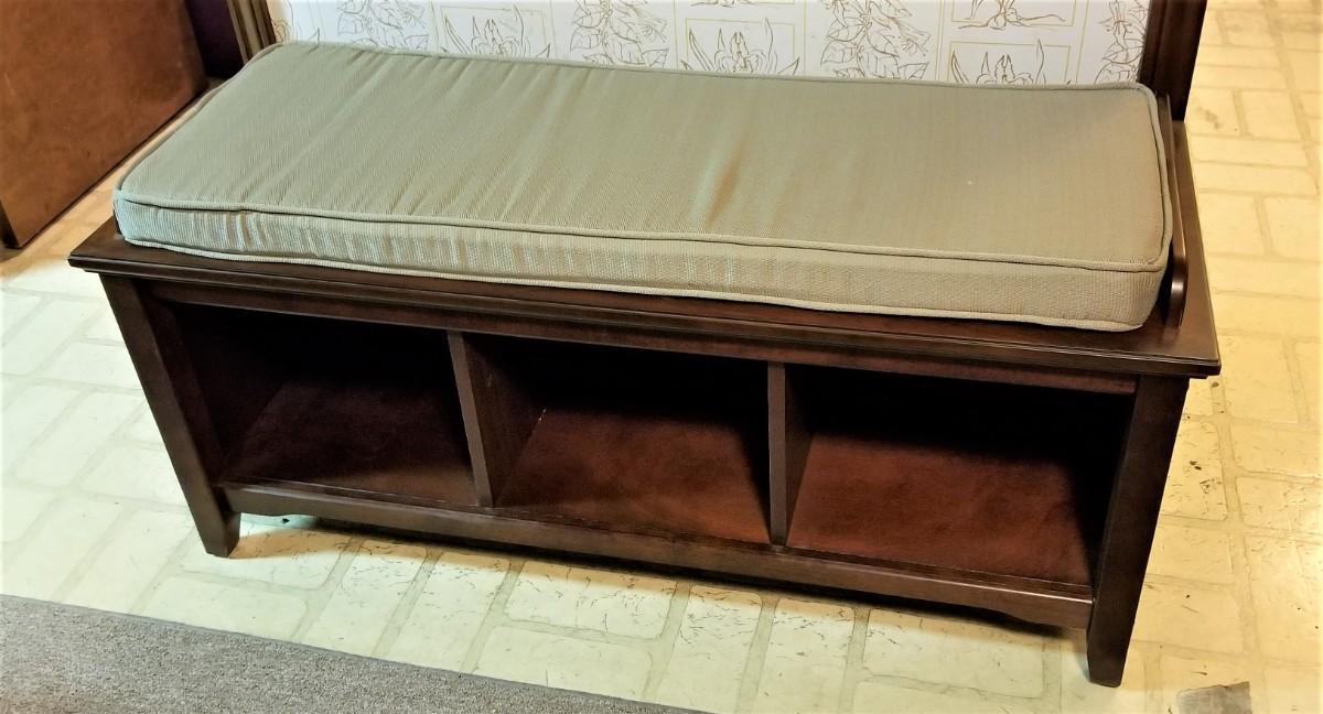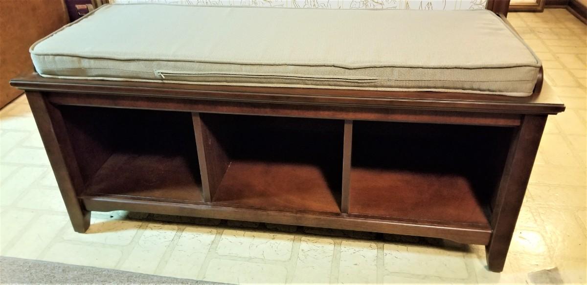 Perfect bench for the foot of the bed or perhaps even the Mud Room - padded seat (can be removed) with storage cubbies underneath. Contemporary - good condition. Measures 48" across, 20" deep, 22" tall.