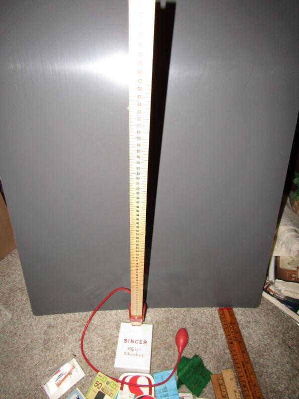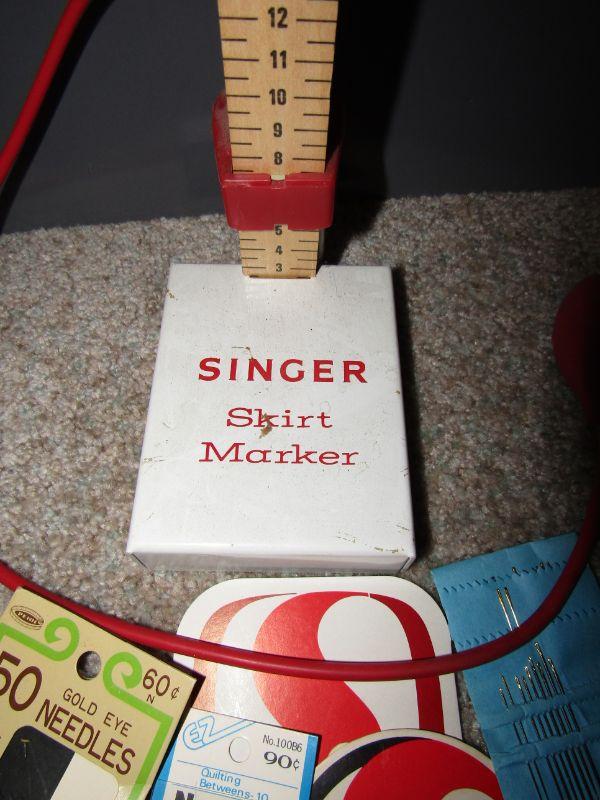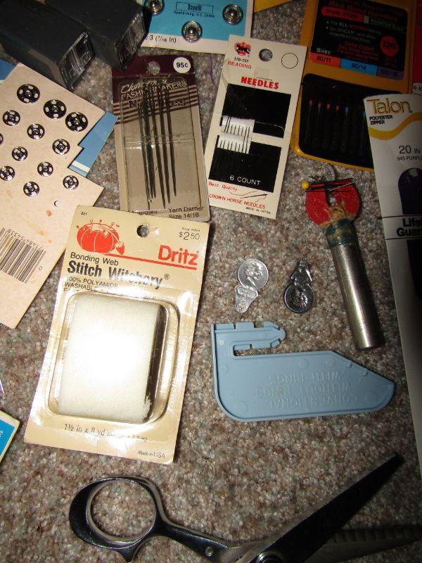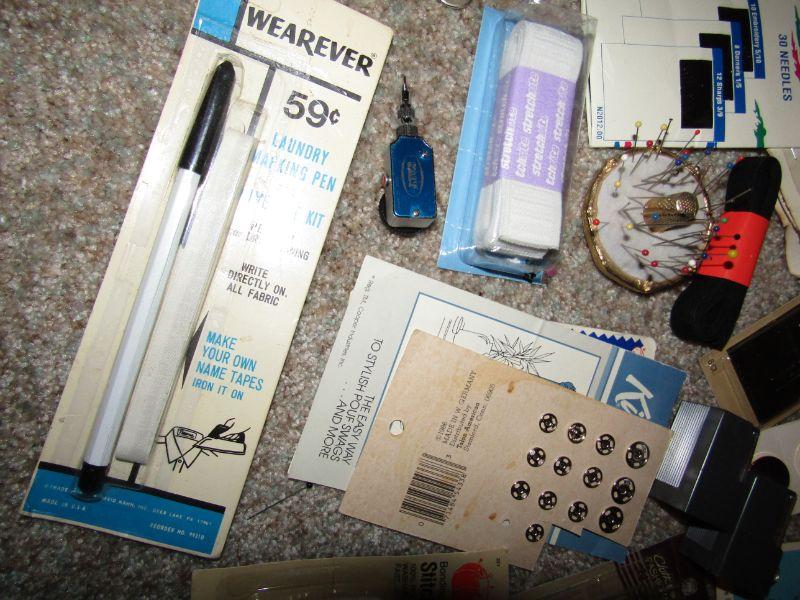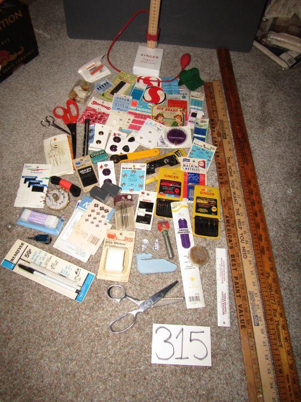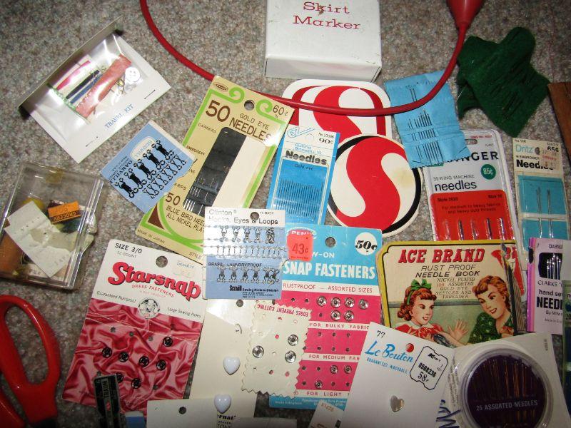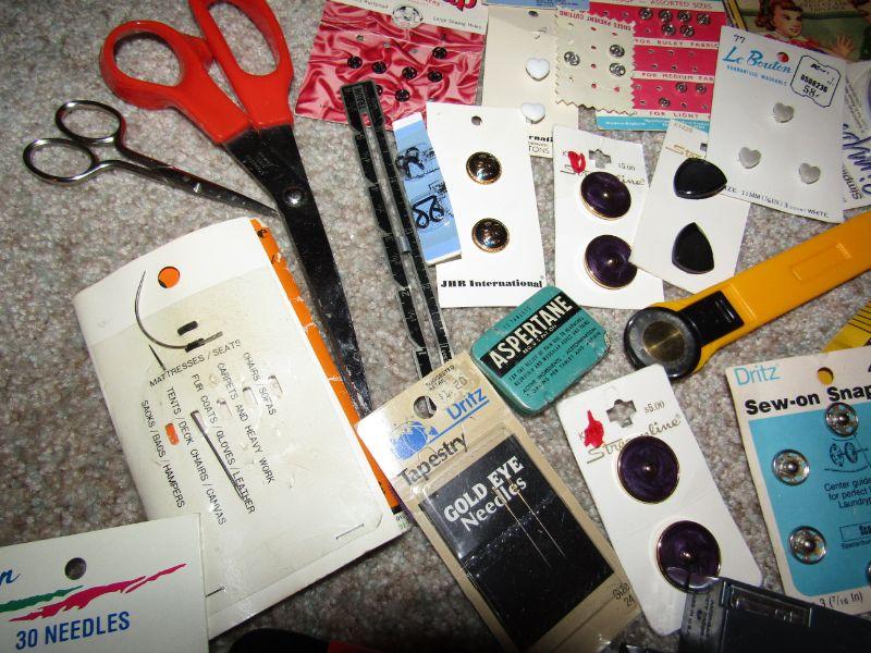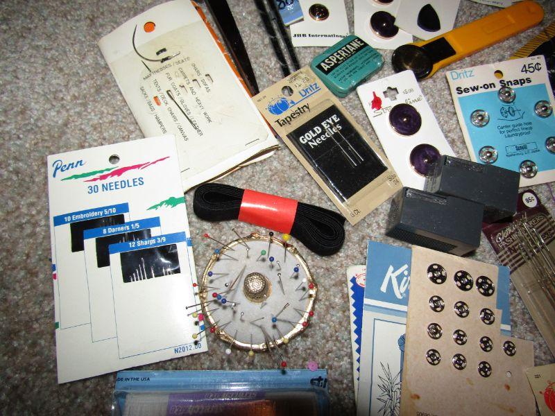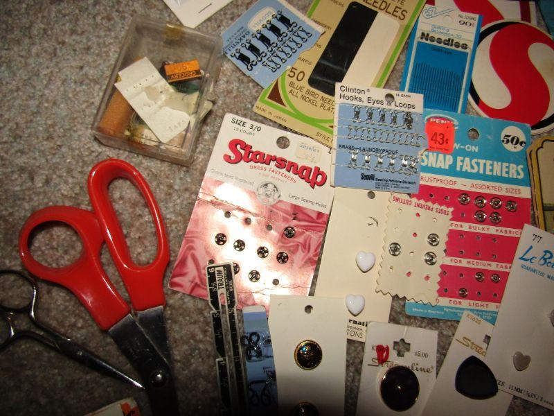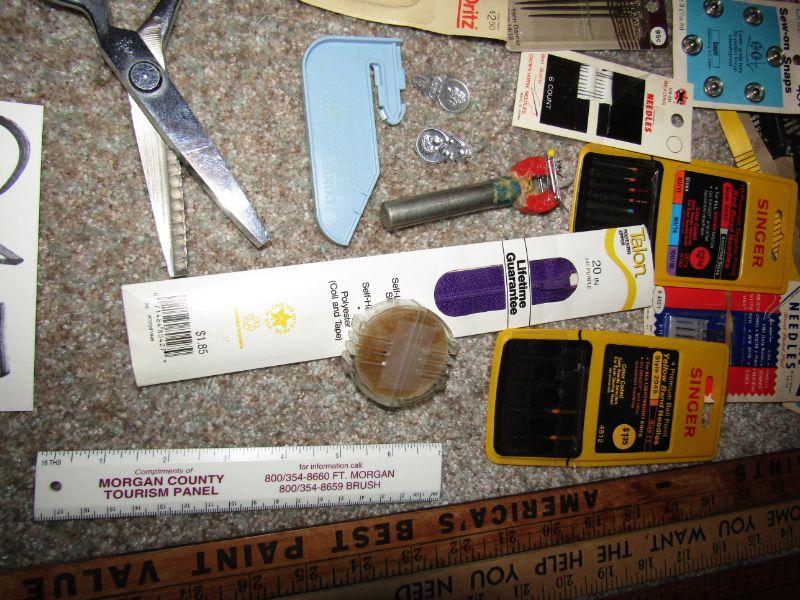 SEWING NEEDLES, MACHINE NEEDLES, SNAPS, BUTTONS, PINS, VINTAGE SKIRT HEM MARKER, ZIPPER, SCISSORS, ROTARY CUTTER, RAZOR BLADES, YARD STICKS AND MORE