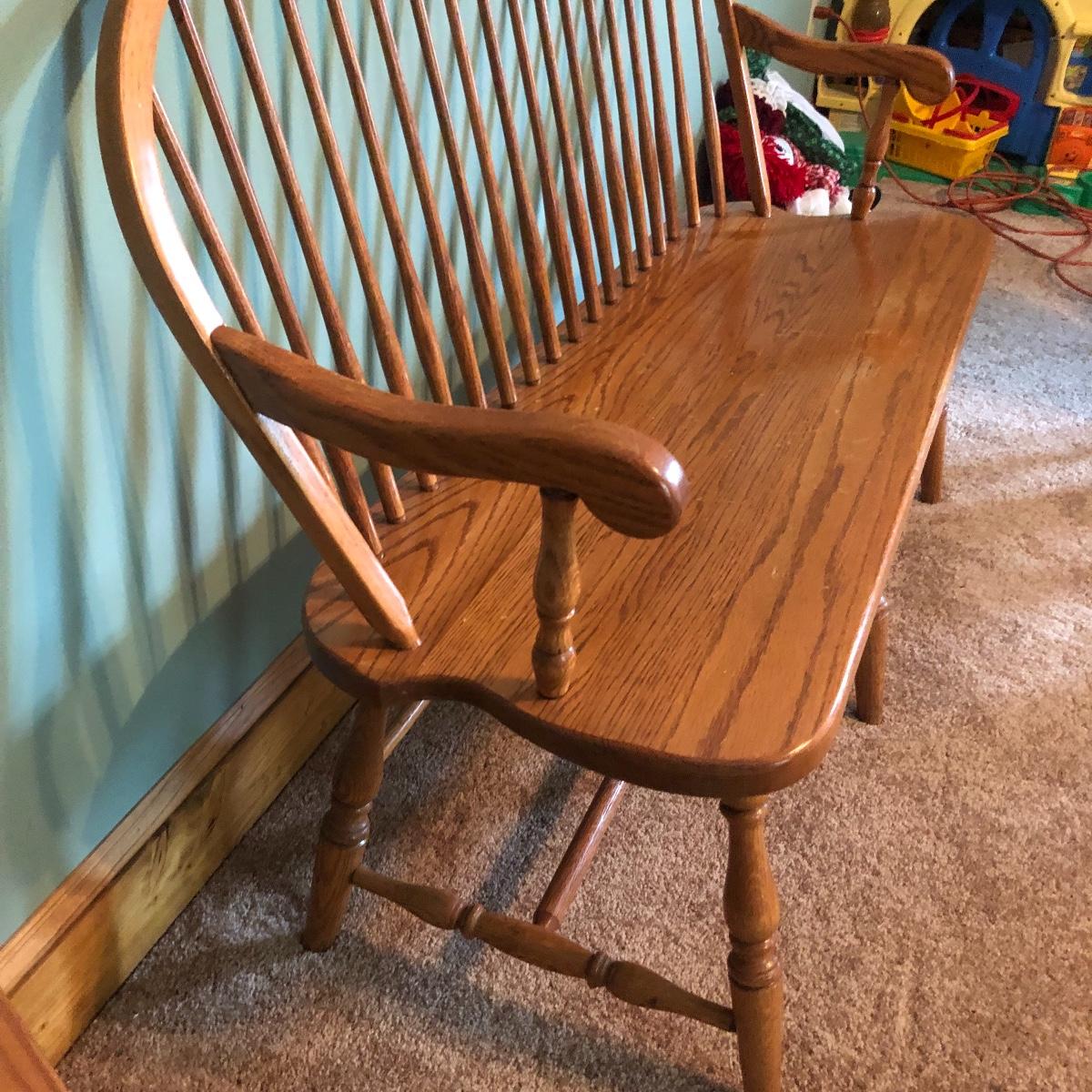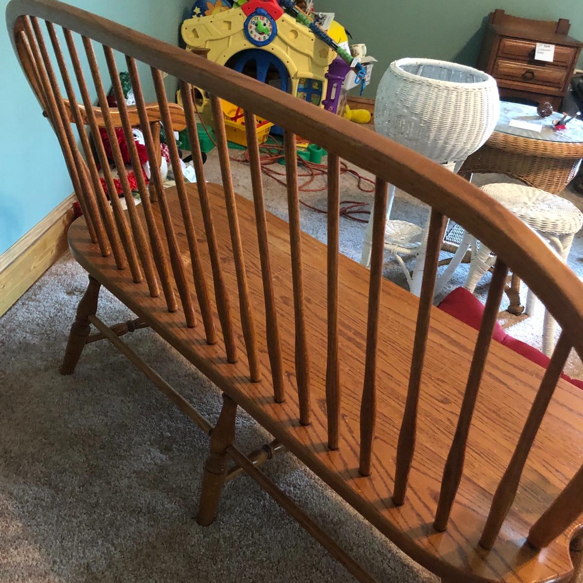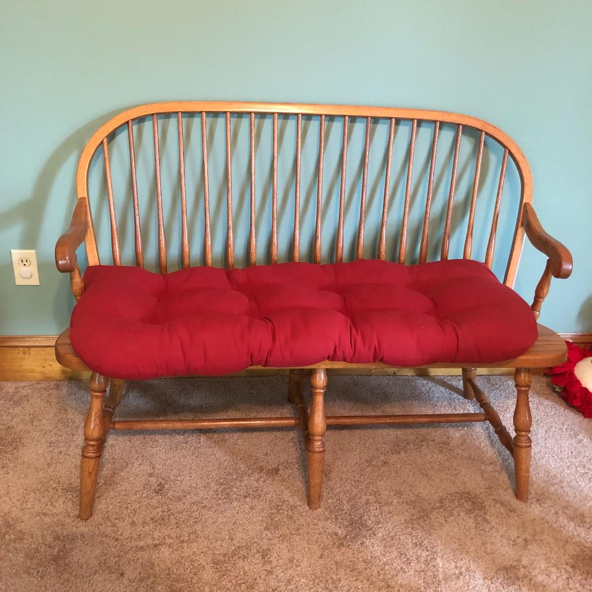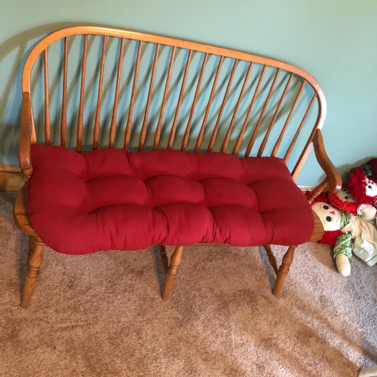This is a lovely large pine bench that comes with a custom dark red cushion. It has a spindle back and beautiful turned legs. Other than some scratches on the seat (shown in images), it’s in good condition.