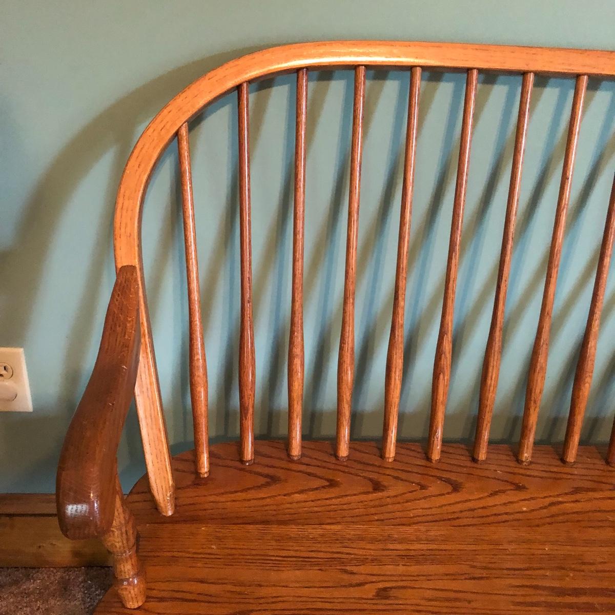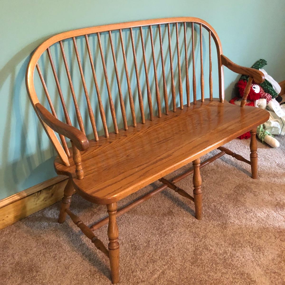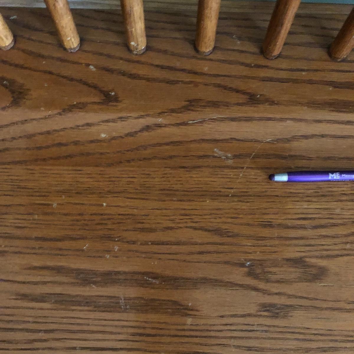 This is a lovely large pine bench that comes with a custom dark red cushion. It has a spindle back and beautiful turned legs. Other than some scratches on the seat (shown in images), it’s in good condition.