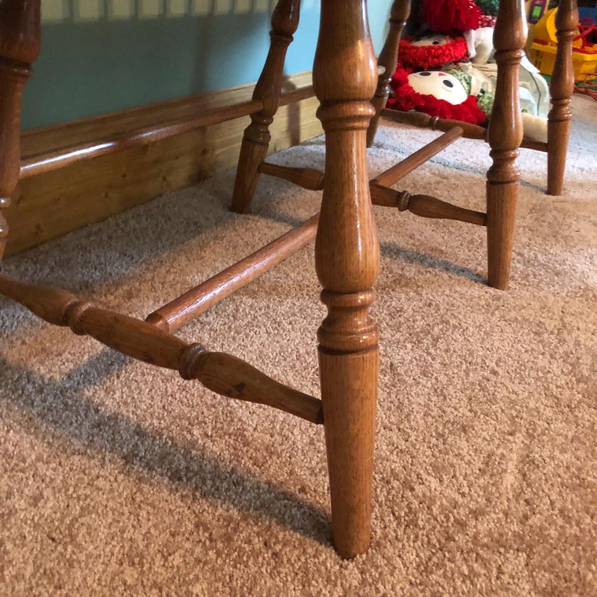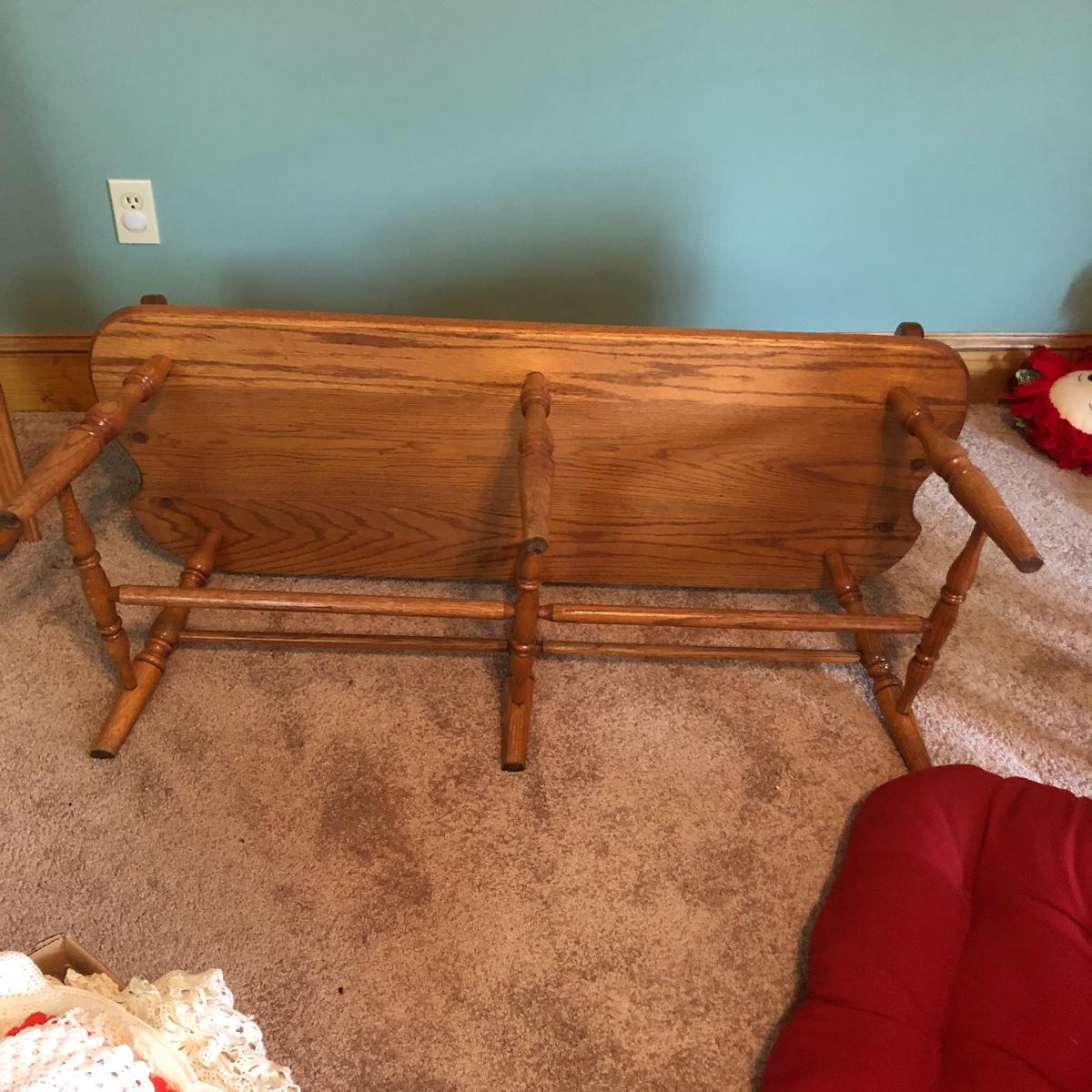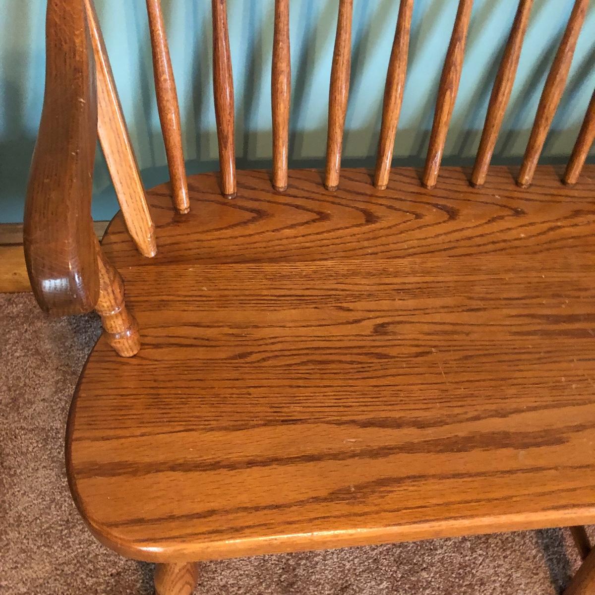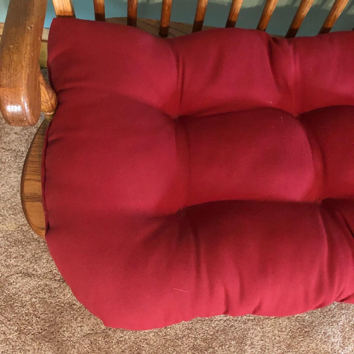 This is a lovely large pine bench that comes with a custom dark red cushion. It has a spindle back and beautiful turned legs. Other than some scratches on the seat (shown in images), it’s in good condition.