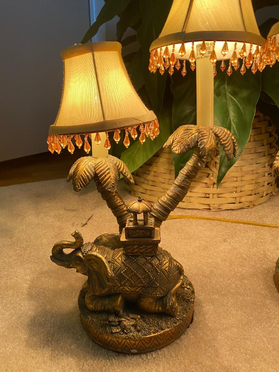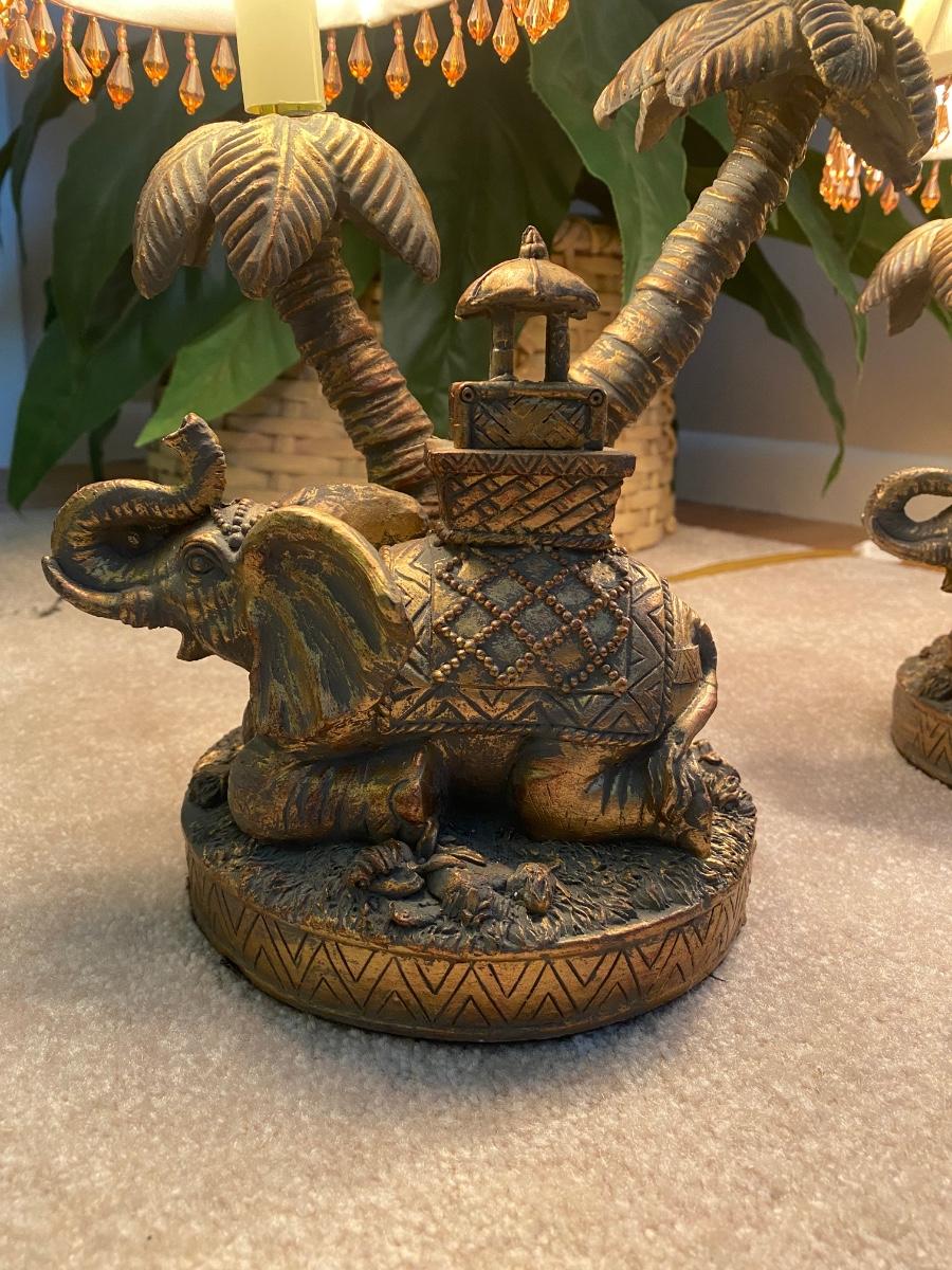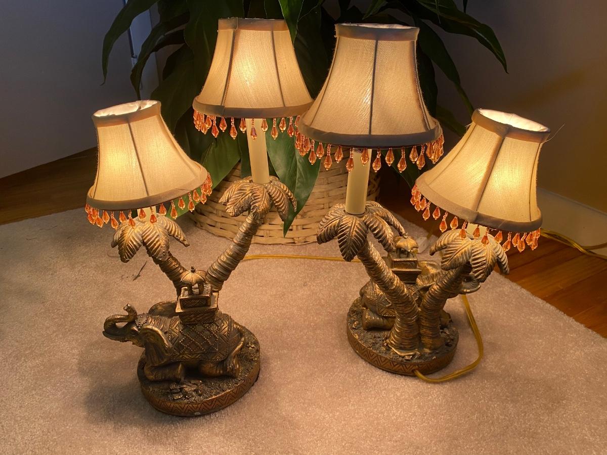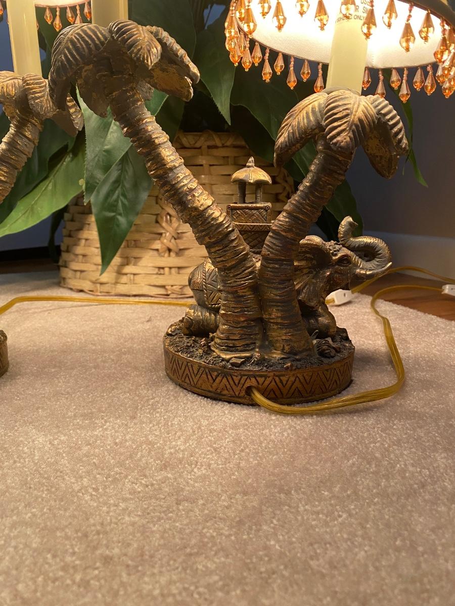 Vintage pair of Elephant Lamp Featuring a kneeling elephant with two palm trees in the background and beaded shades. These look to be resin modern home decor.
