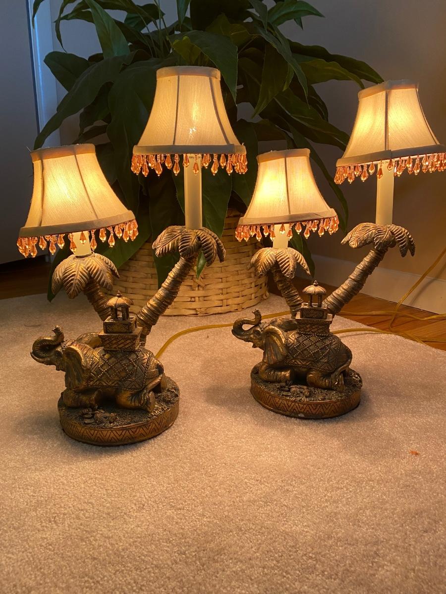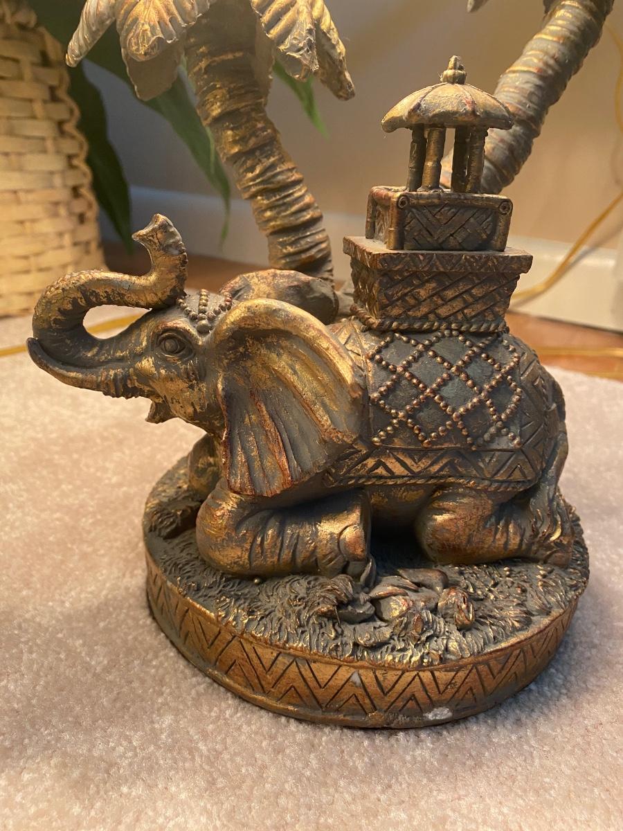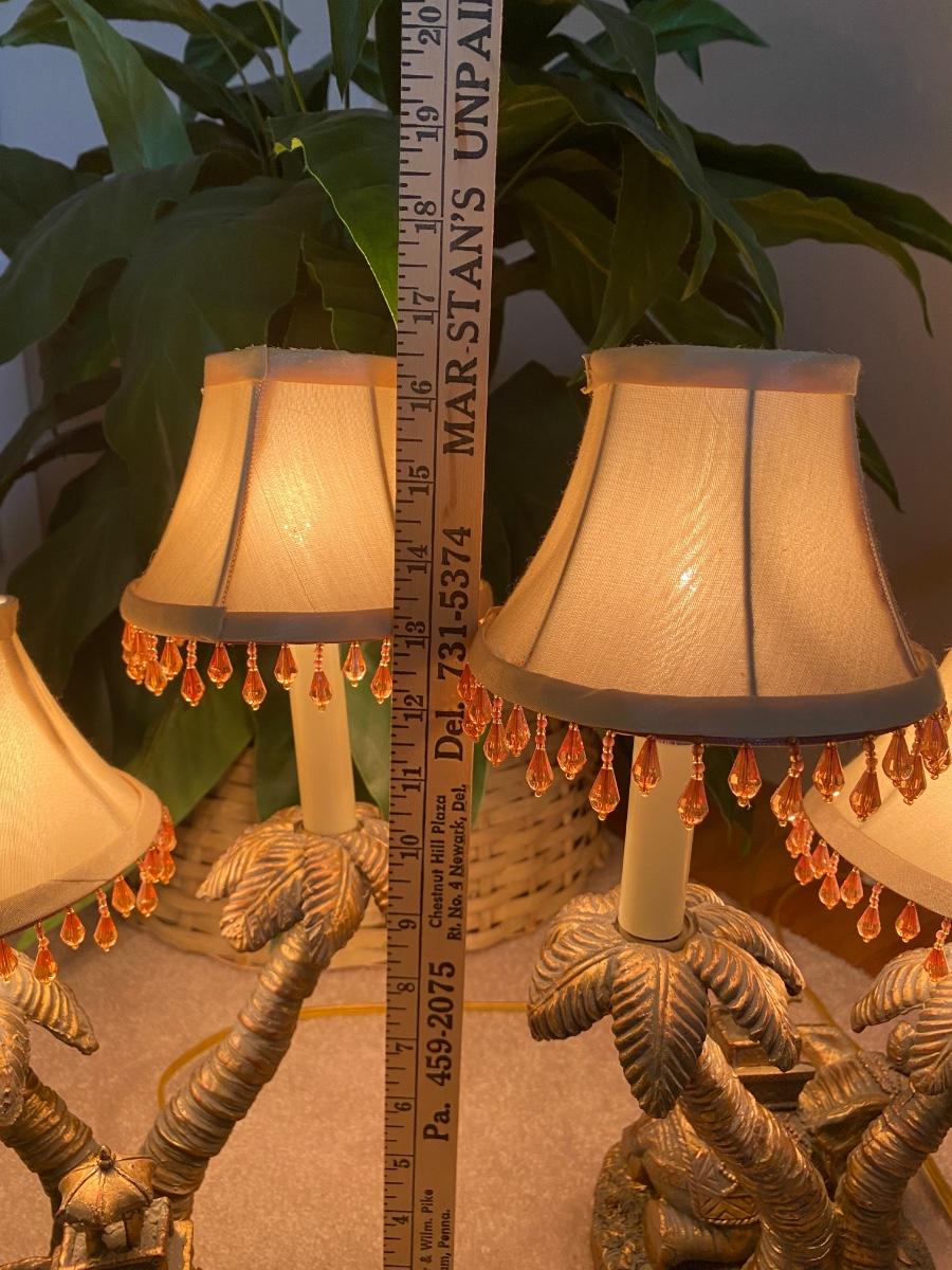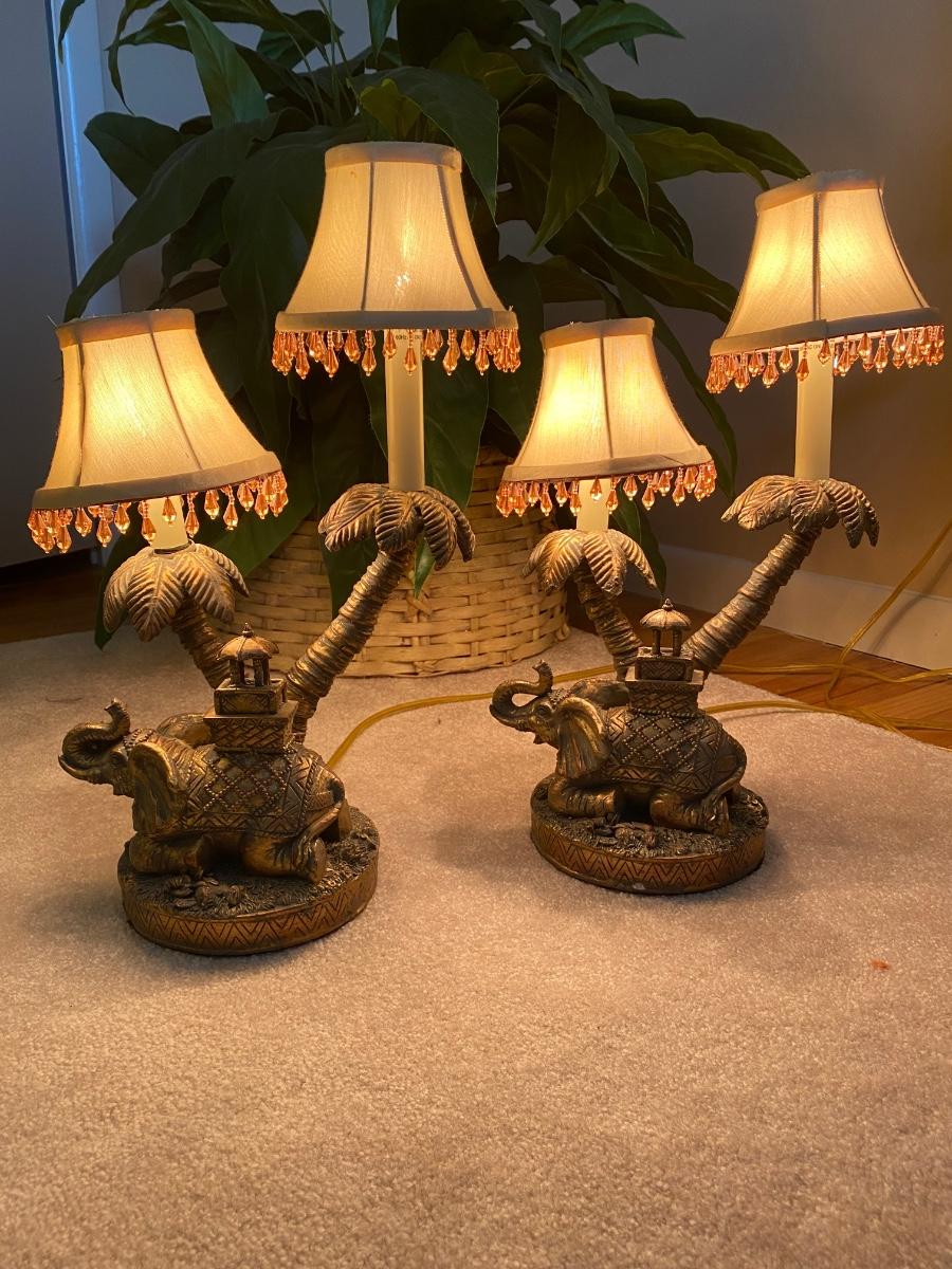 Vintage pair of Elephant Lamp Featuring a kneeling elephant with two palm trees in the background and beaded shades. These look to be resin modern home decor.