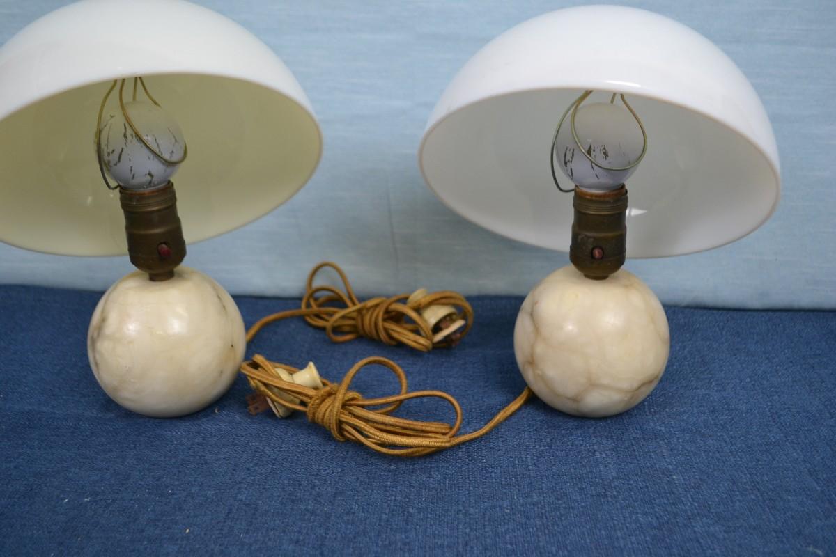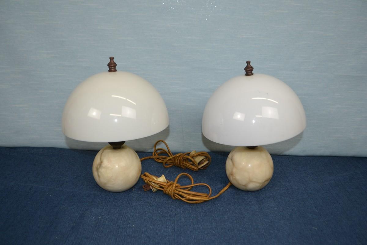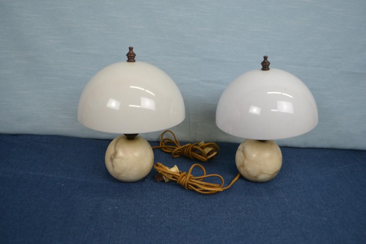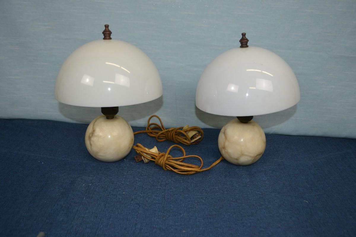 LOT 316. PAIR OF 12" MUSHROOM LAMPS WITH PLASTIC SHADE AND STONE BASE