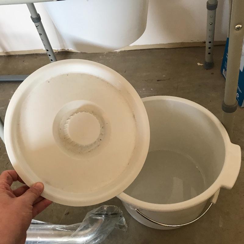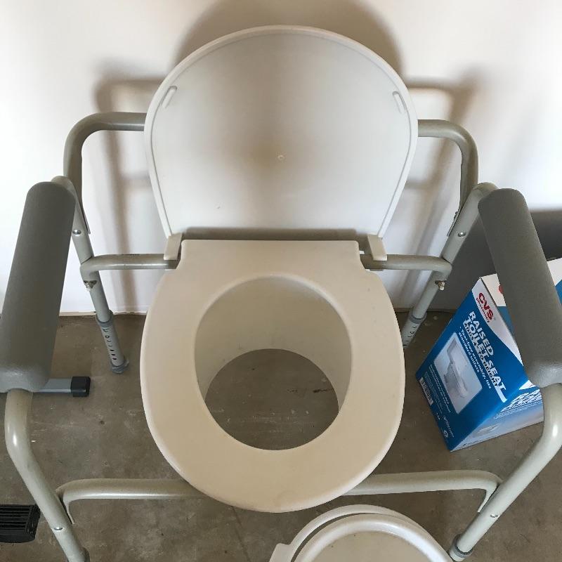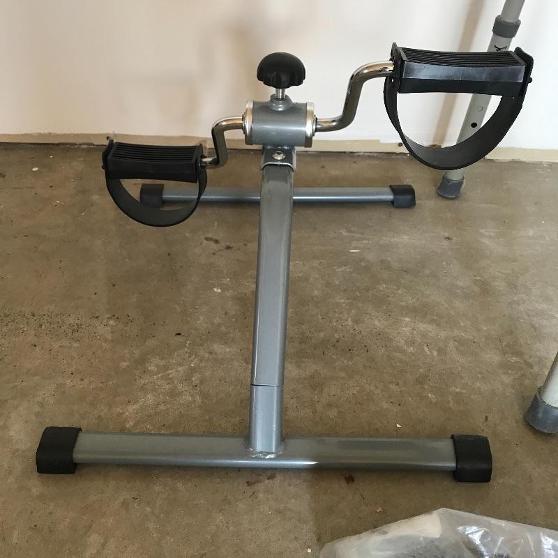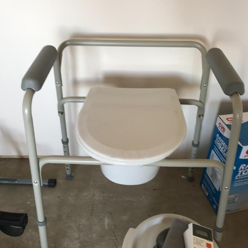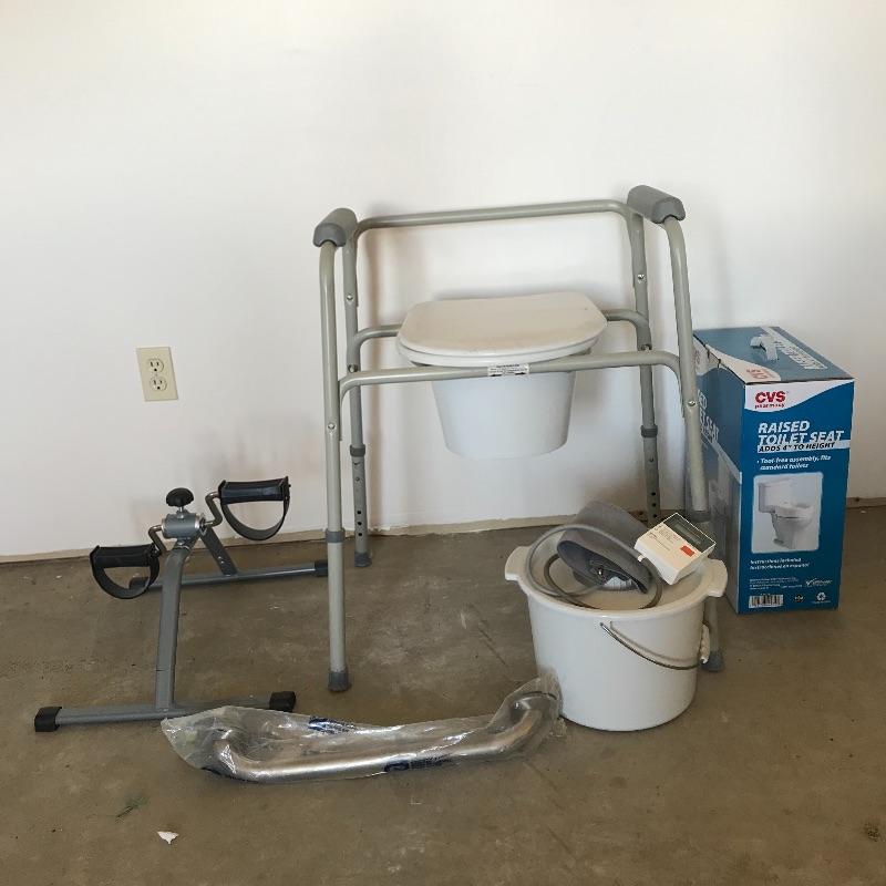 Home health lot includes working Omron blood pressure machine, a new-in-packaging 18” grab bar with hardware, stationary peddler that appears never used. Lot also has a raised toilet seat, a height adjustable toilet seat with bars and an extra lidded bucket. The brand of the peddler is unknown. Local pick up only.