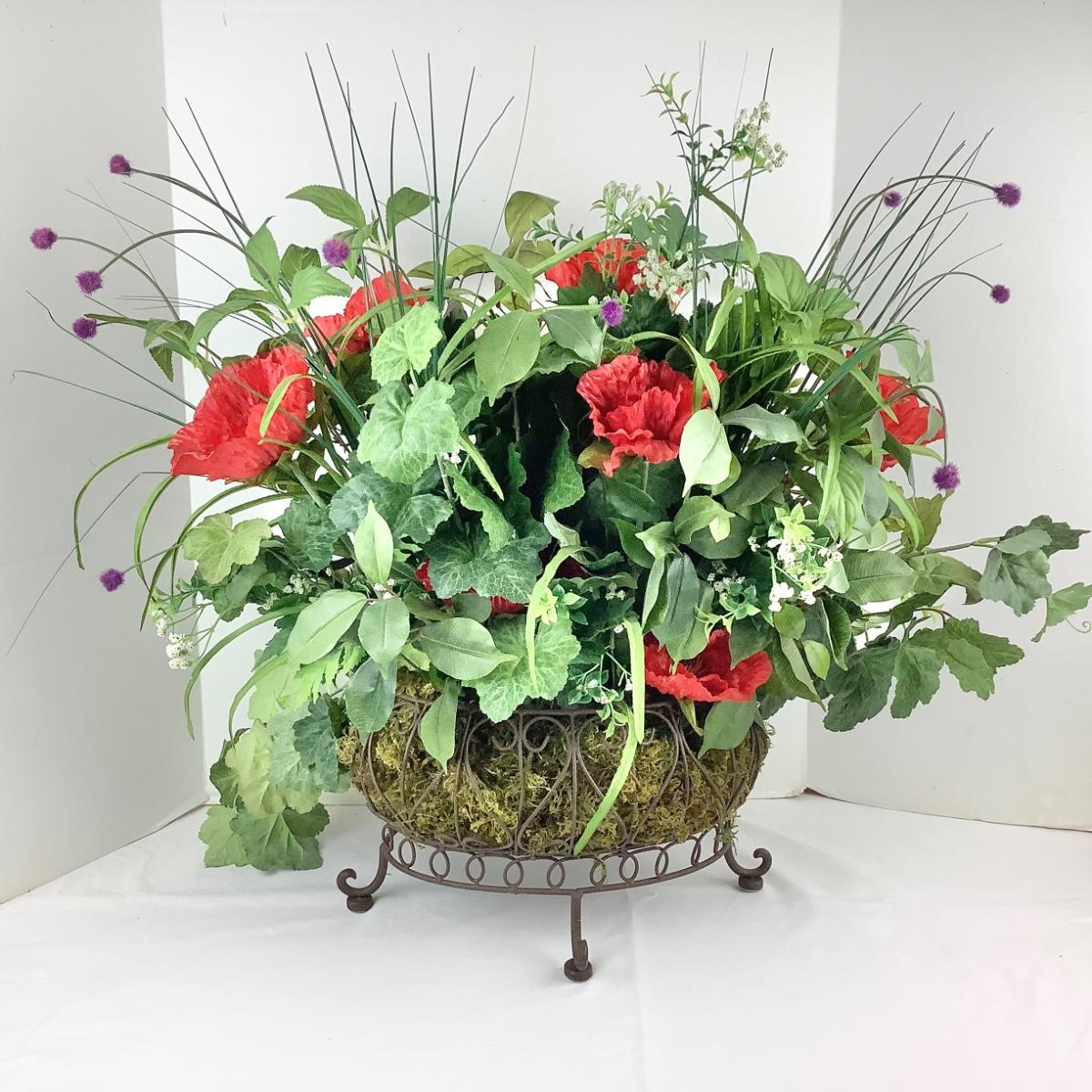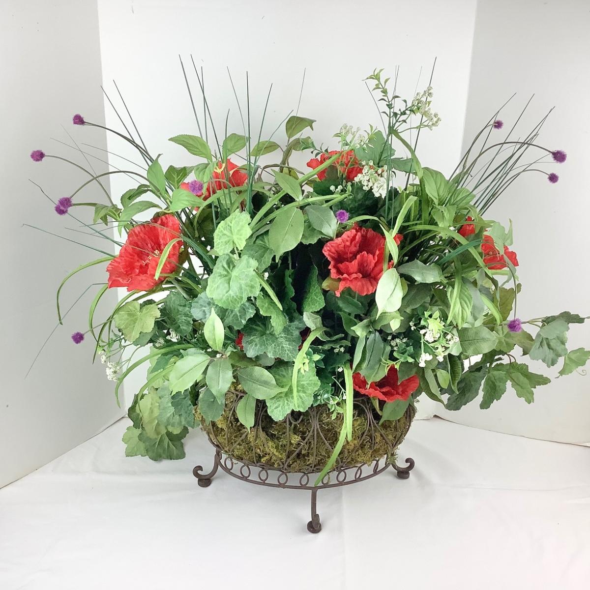 Lot 316. Large Faux Floral Centerpiece with Footed Metal Stand
