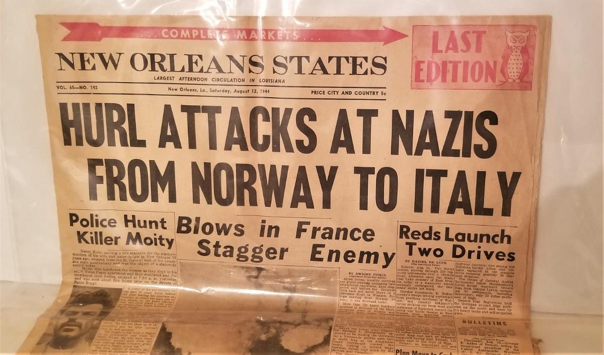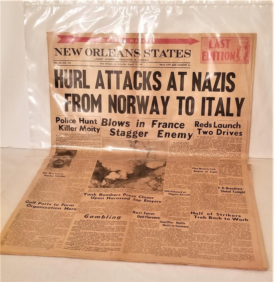 August 12. 1944 - original New Orleans States newspaper - lots of great WWII materials, i.e. "Flows in France Stagger Enemy". Good vintage condition.