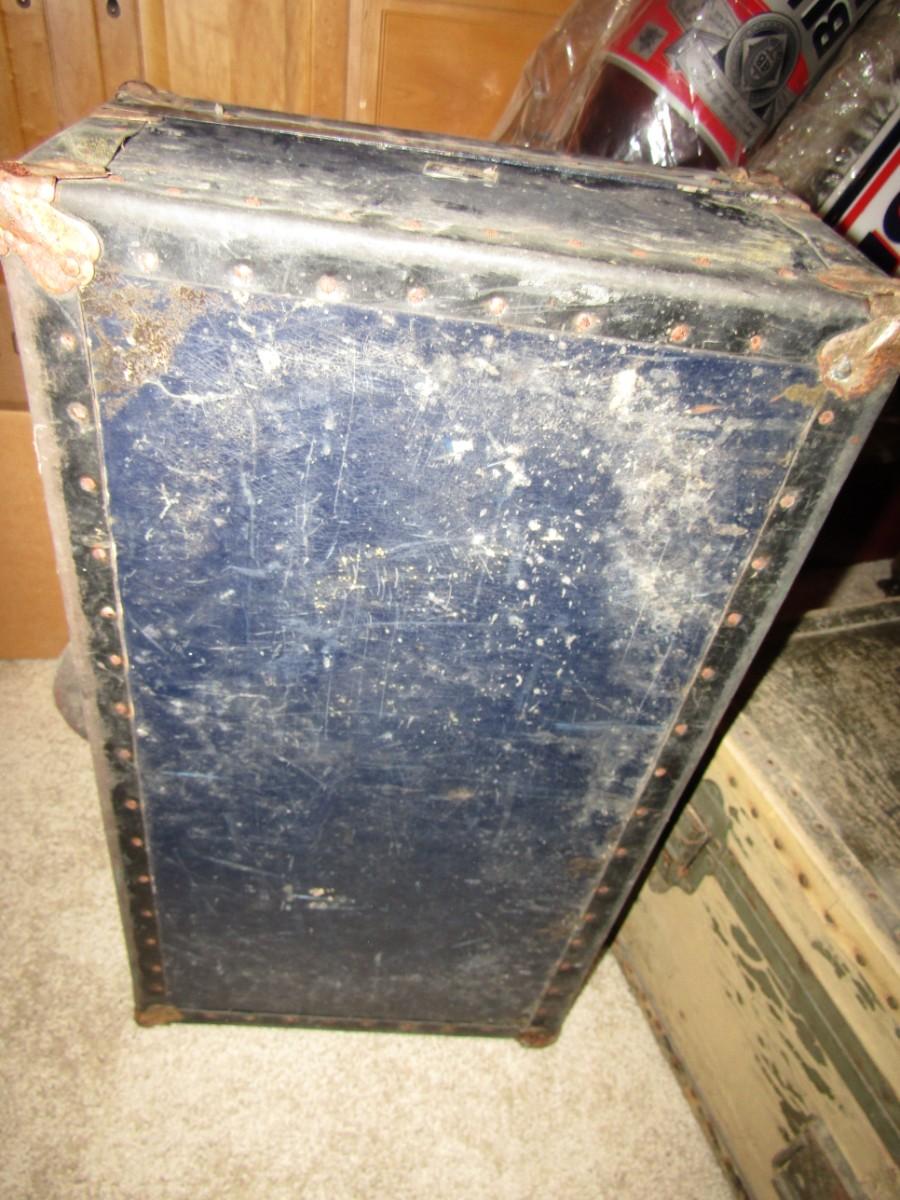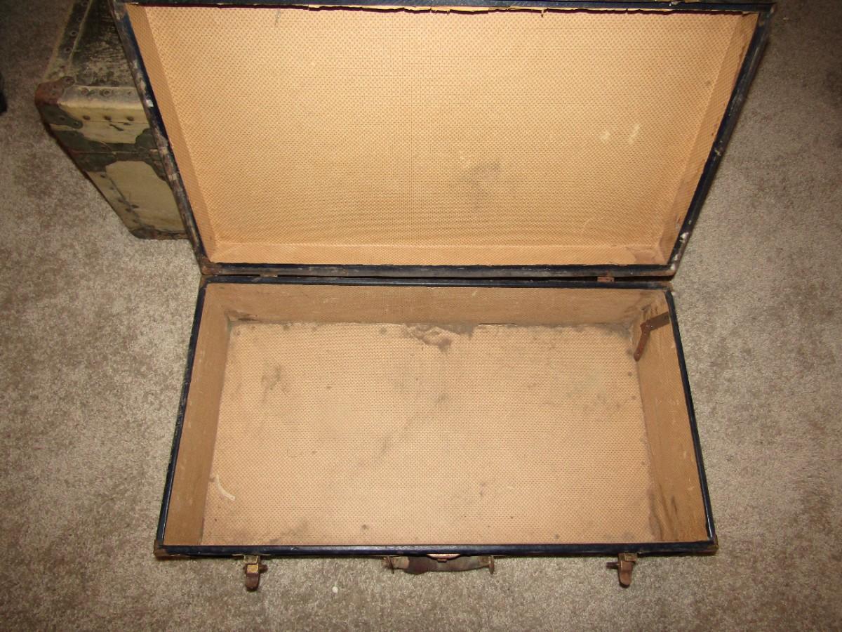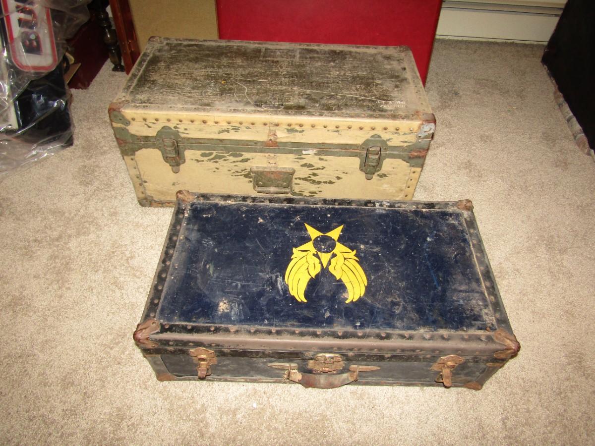THE TAN TRUNK HAS A WOODEN SHELF INSERT. BOTH TRUNKS SMELL MUSTY
