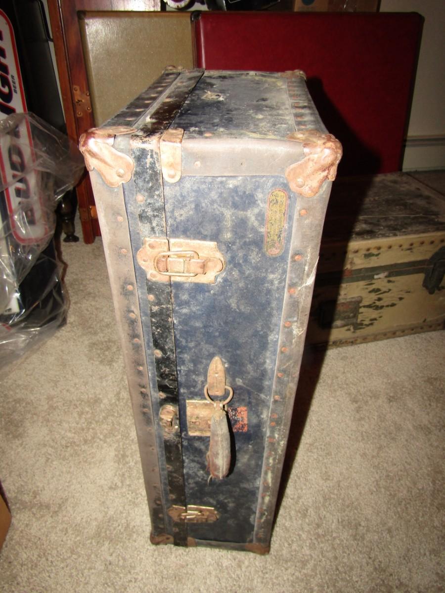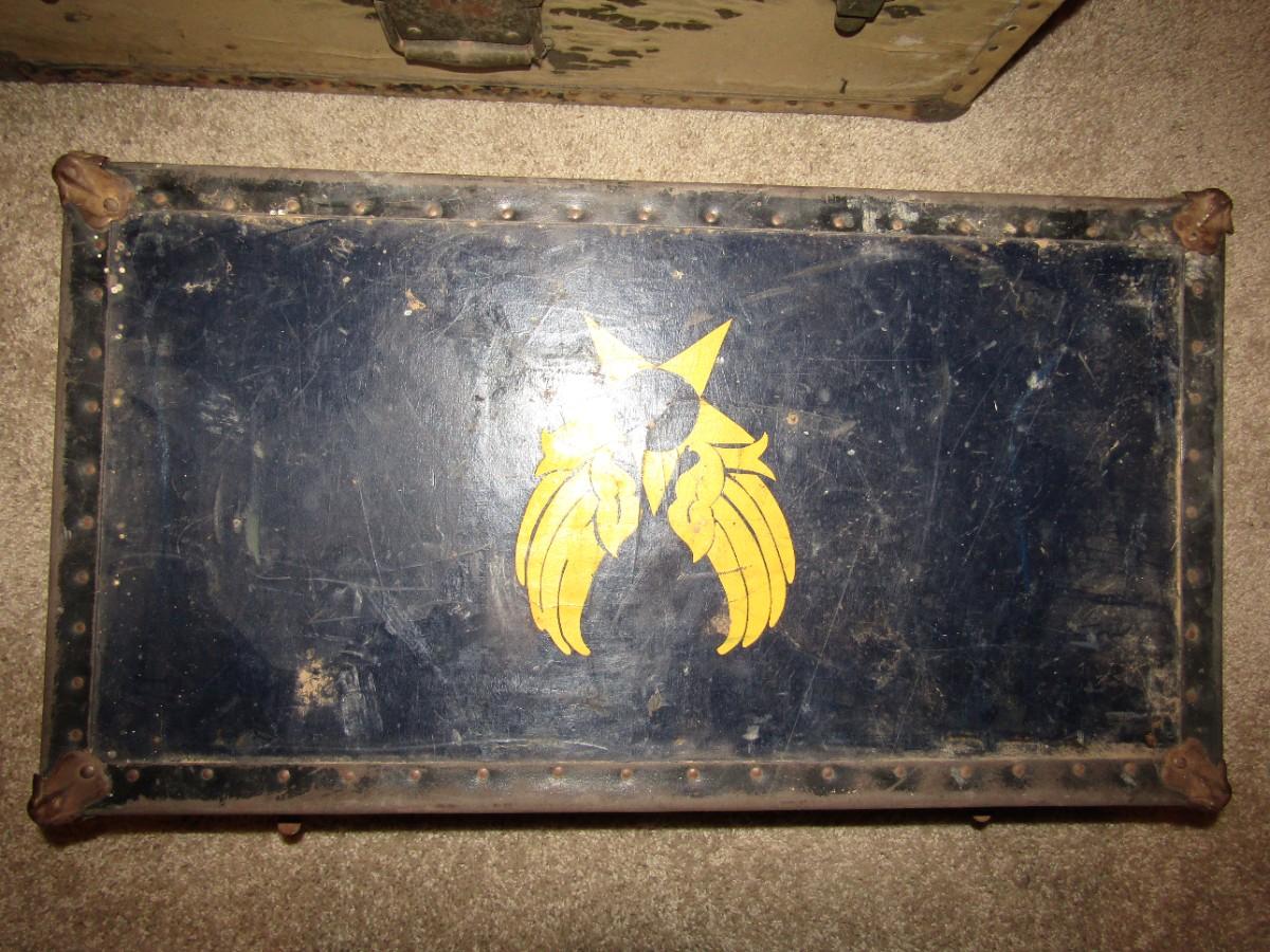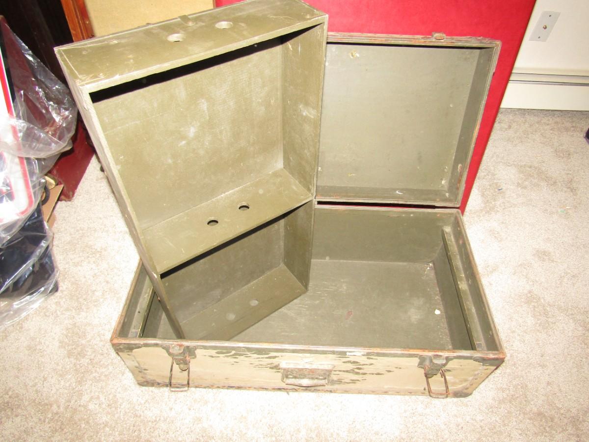 THE TAN TRUNK HAS A WOODEN SHELF INSERT. BOTH TRUNKS SMELL MUSTY