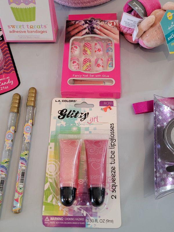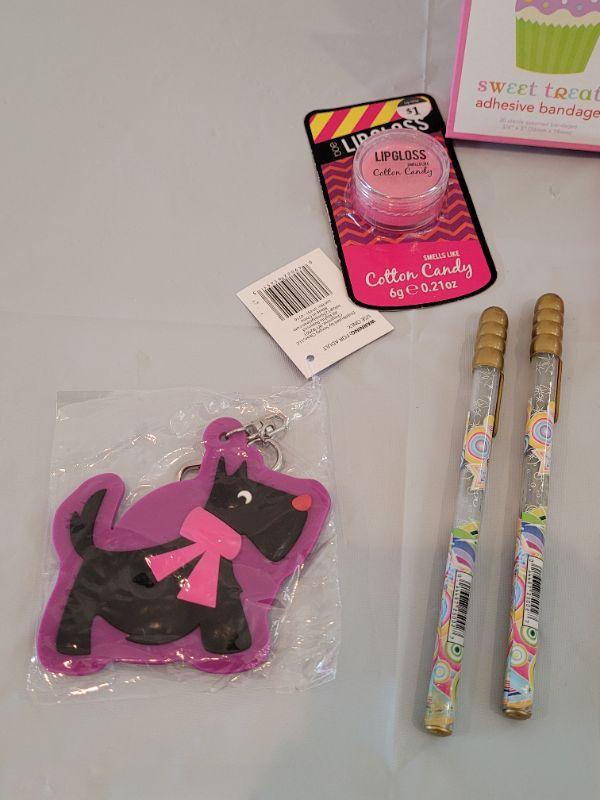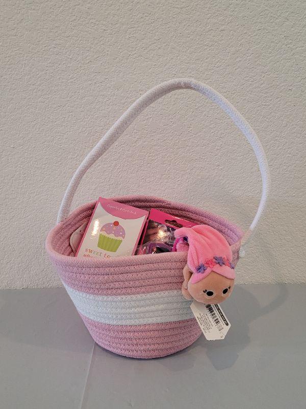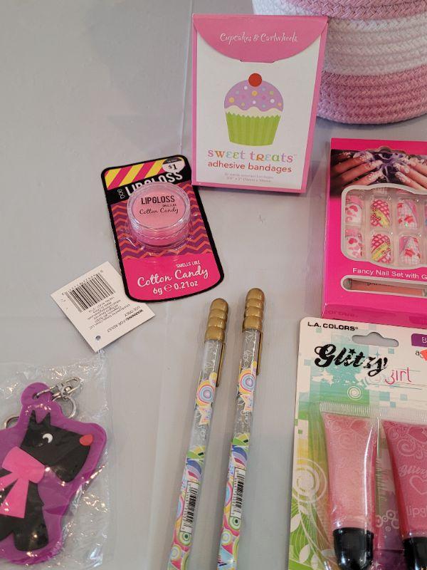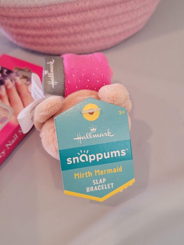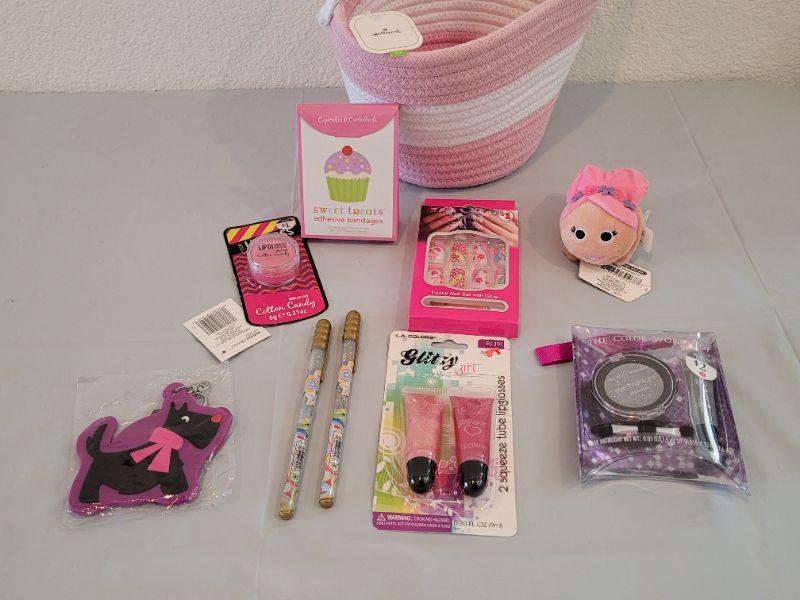 Lot 317: Hallmark Jelly Roll Rug Easter Basket and Makeup, Keychain, Gel Pens, Bandaid, Mirth Mermaid Slap Bracelet,