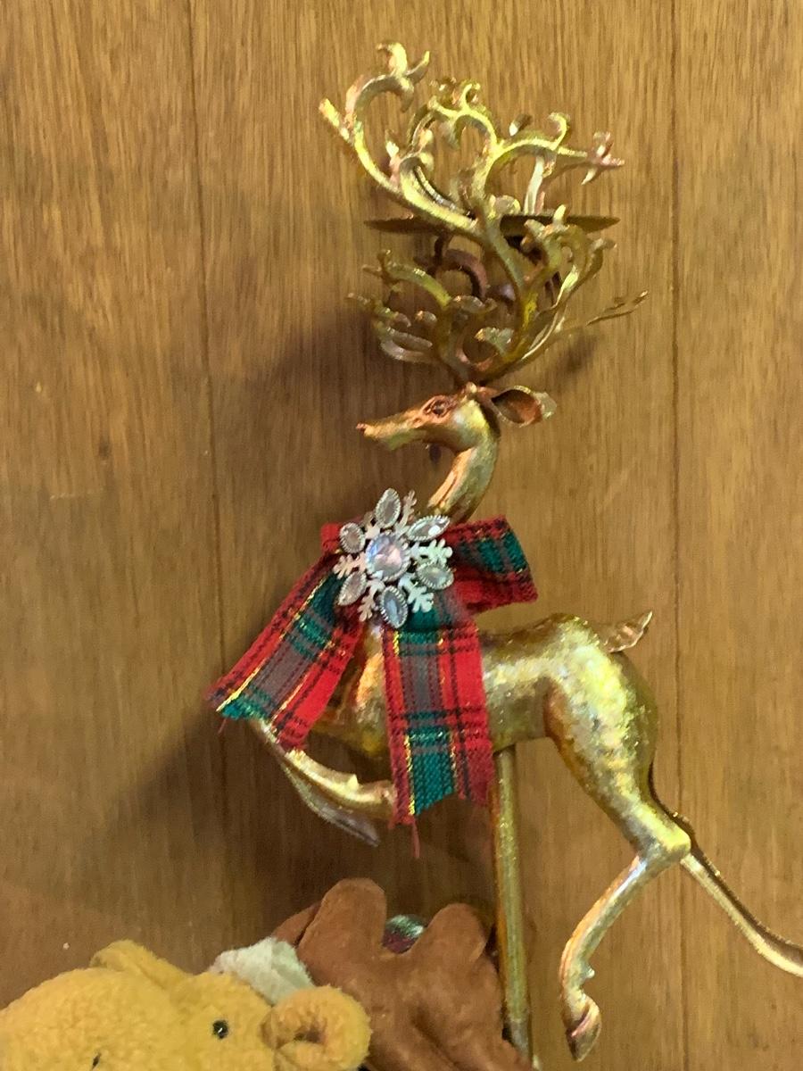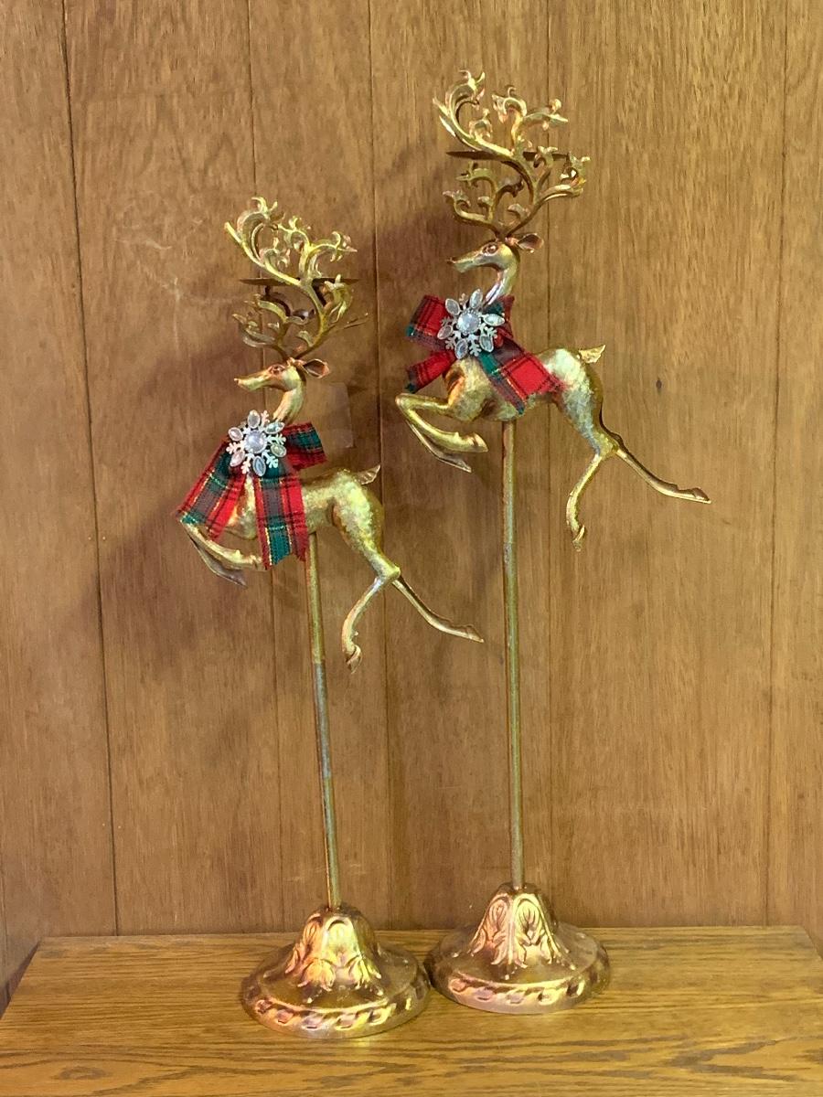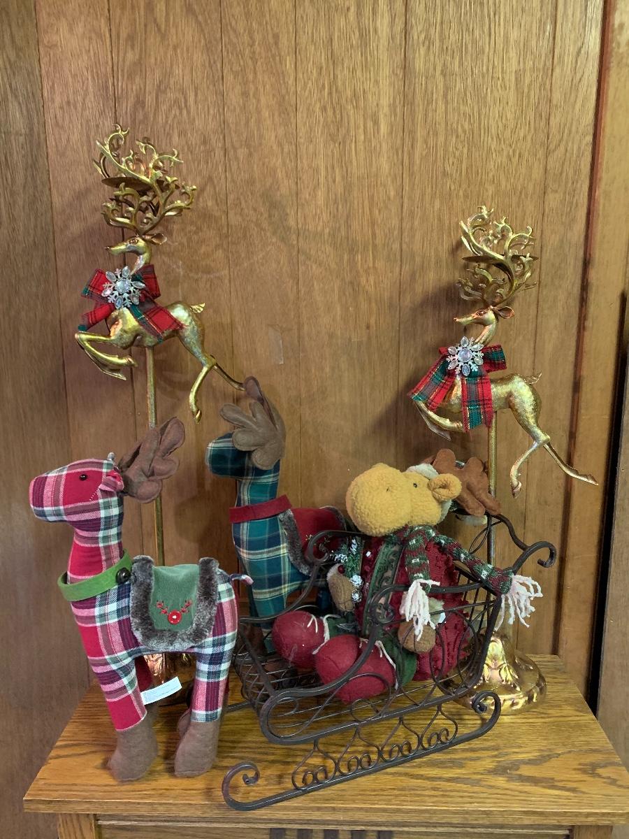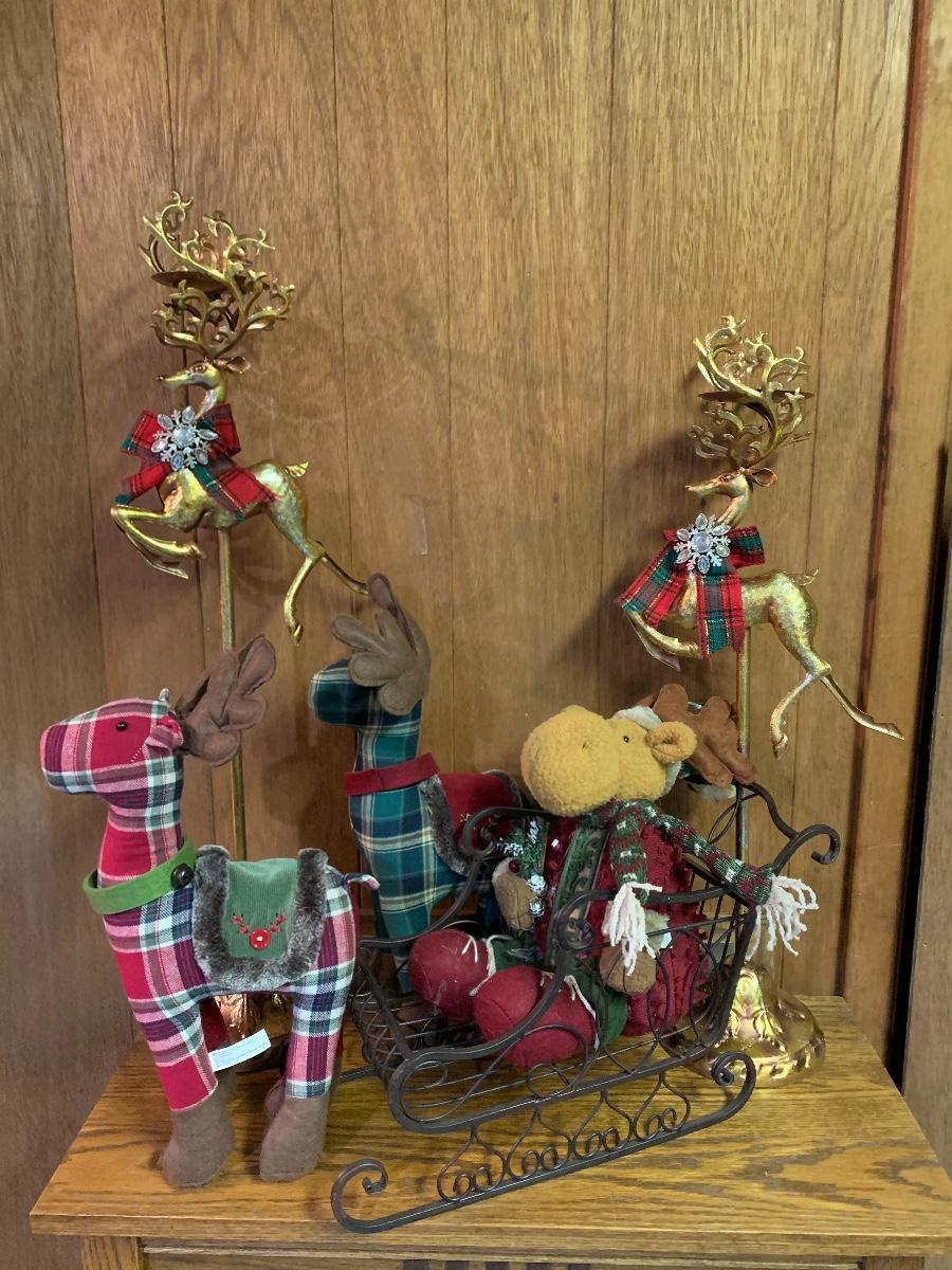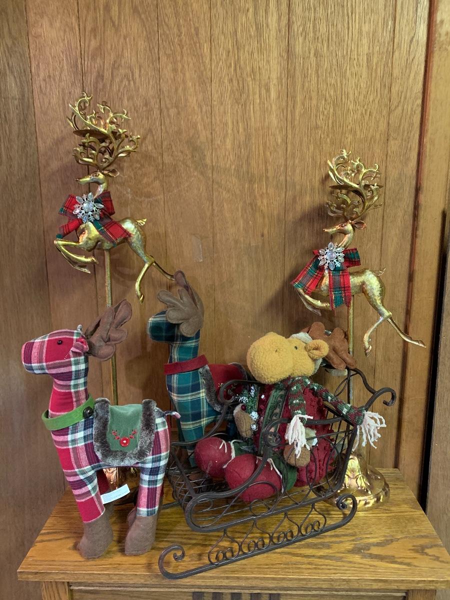 Tall gold tone deer candle holders come apart for easier storage, plaid deer, a moose with a metal sleigh to add to any holiday decorating.