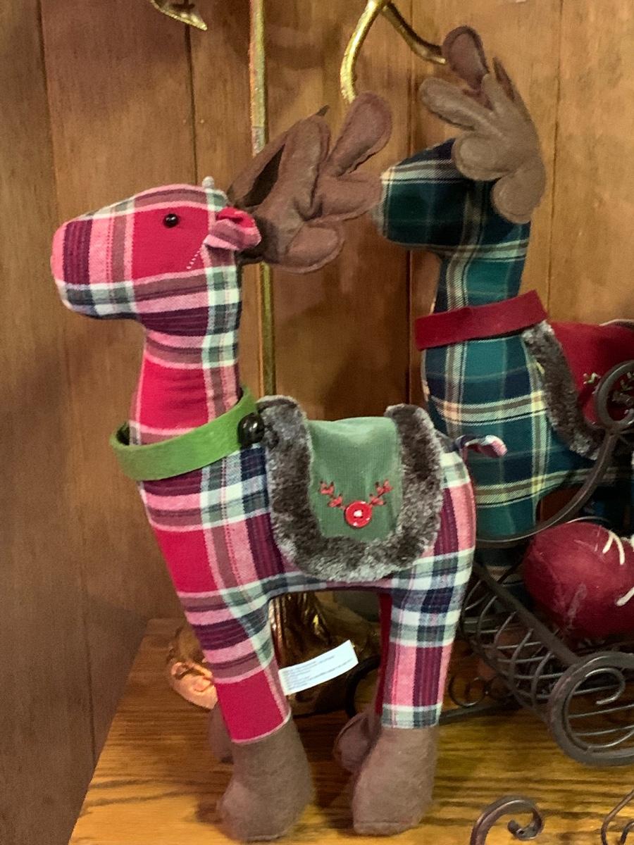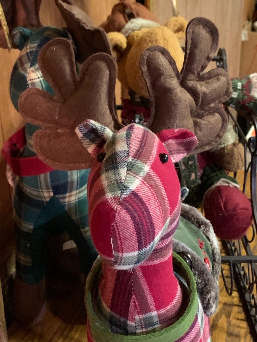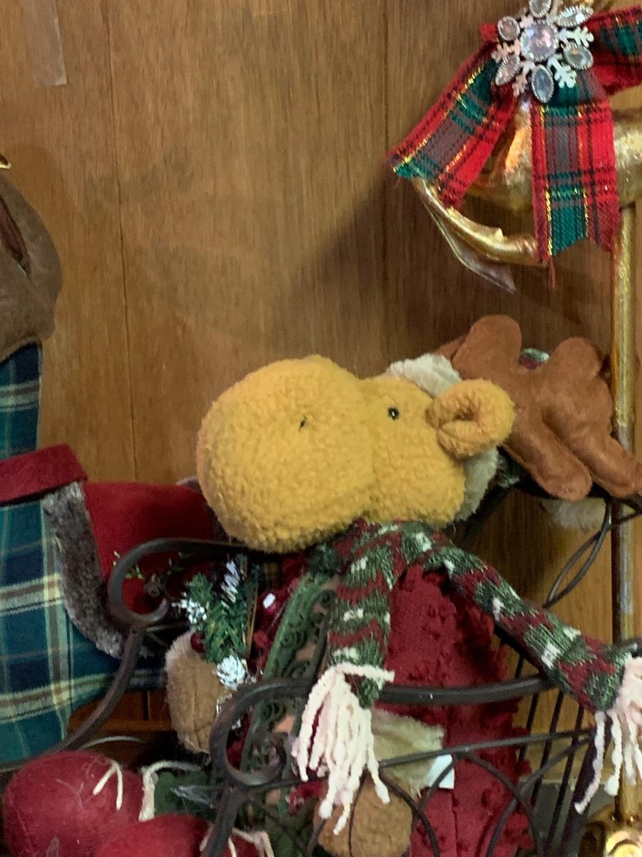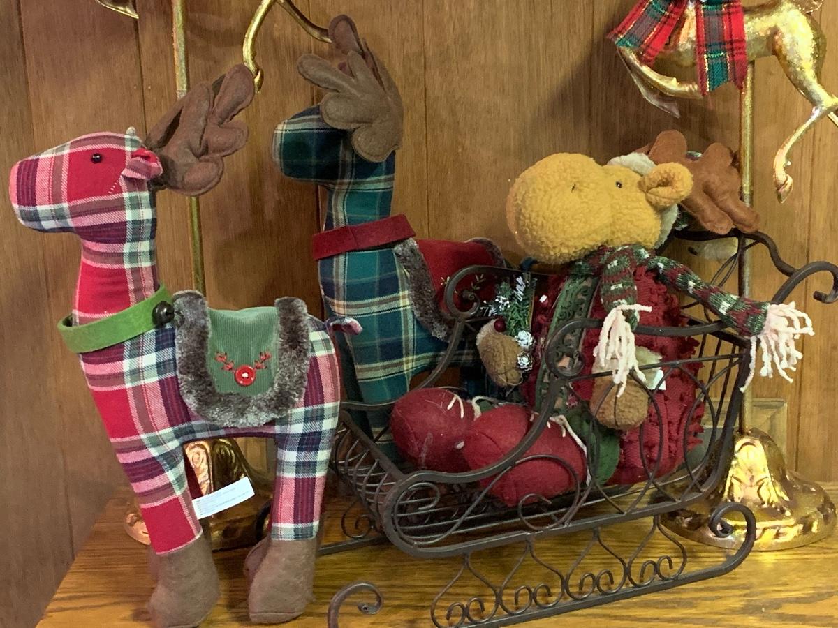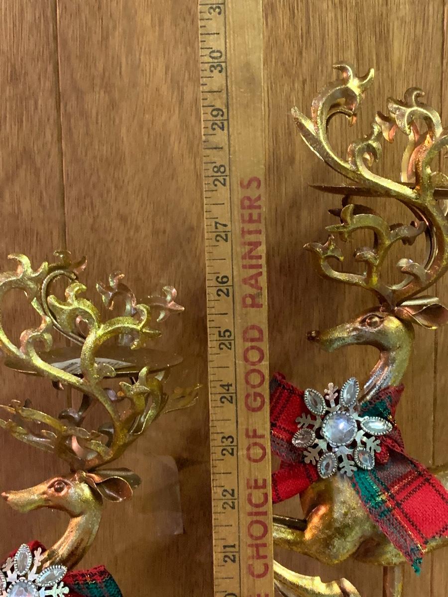 Tall gold tone deer candle holders come apart for easier storage, plaid deer, a moose with a metal sleigh to add to any holiday decorating.