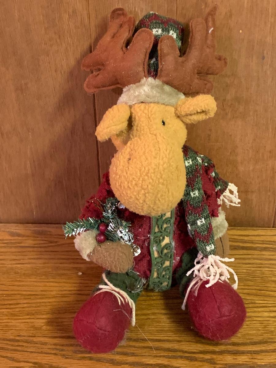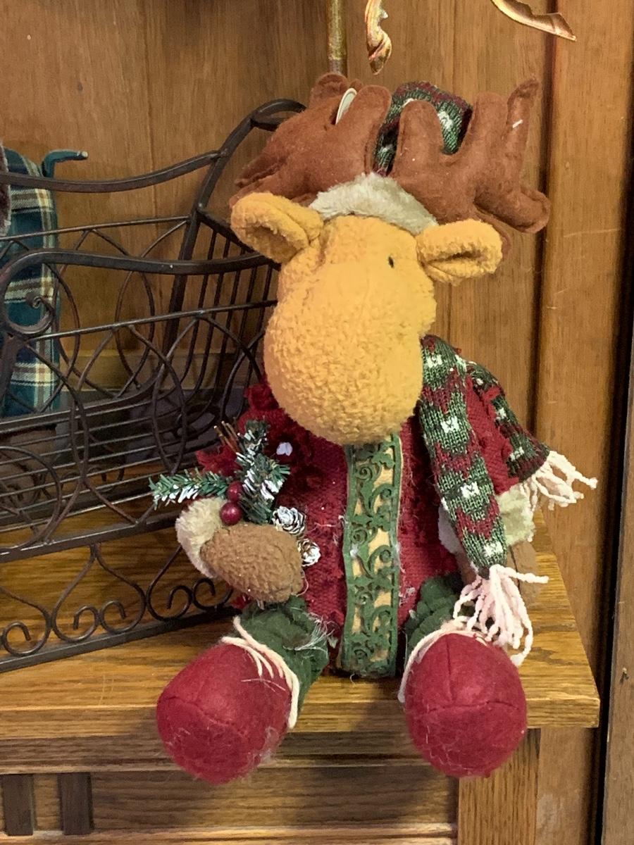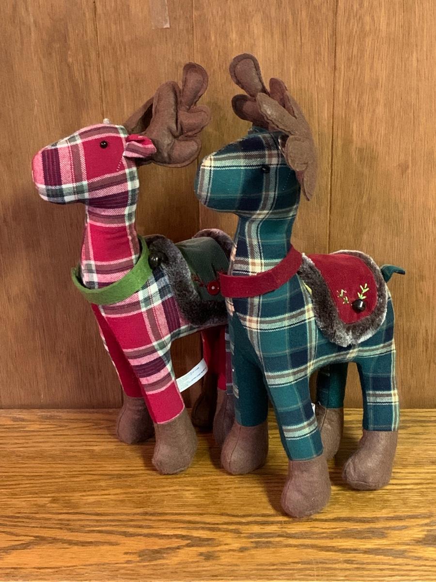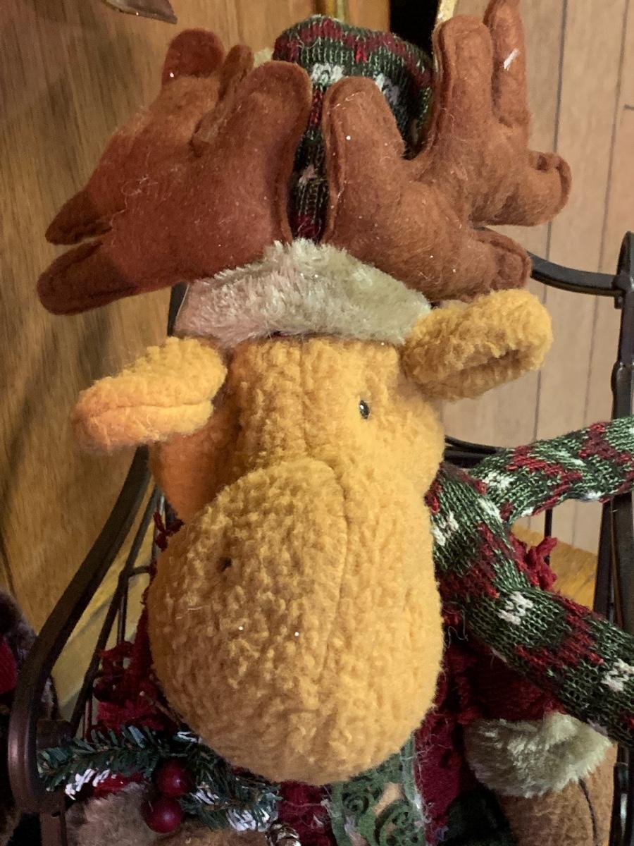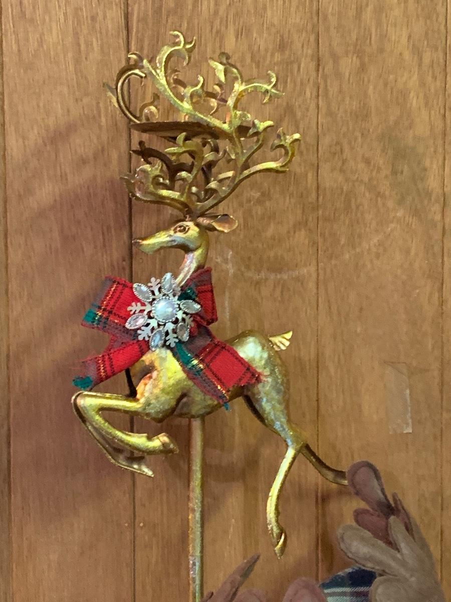 Tall gold tone deer candle holders come apart for easier storage, plaid deer, a moose with a metal sleigh to add to any holiday decorating.