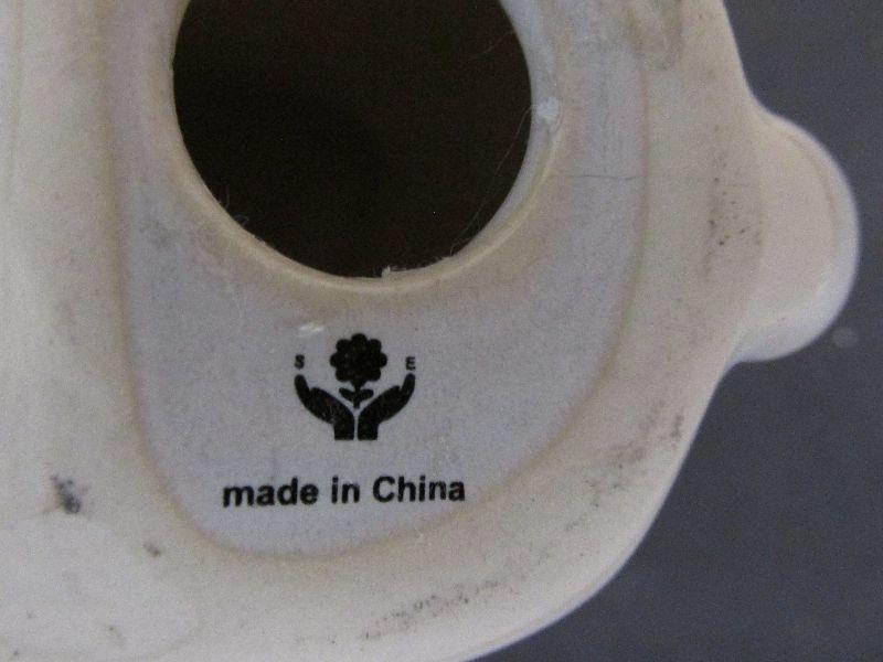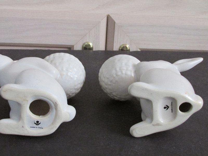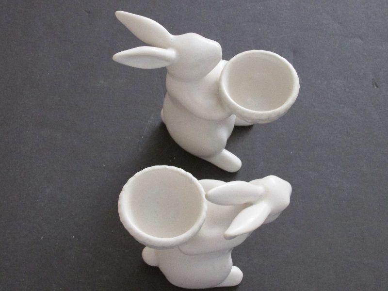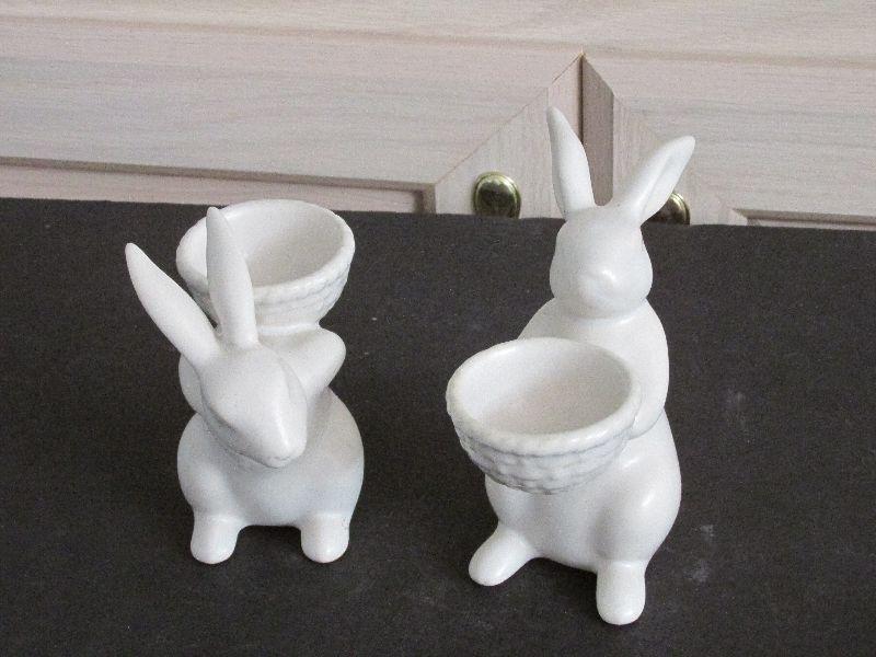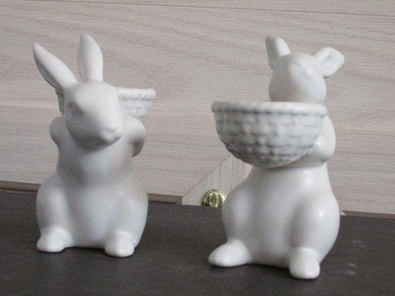 White ceramic rabbit figurines carrying bowls. Made in China. No chips or cracks.