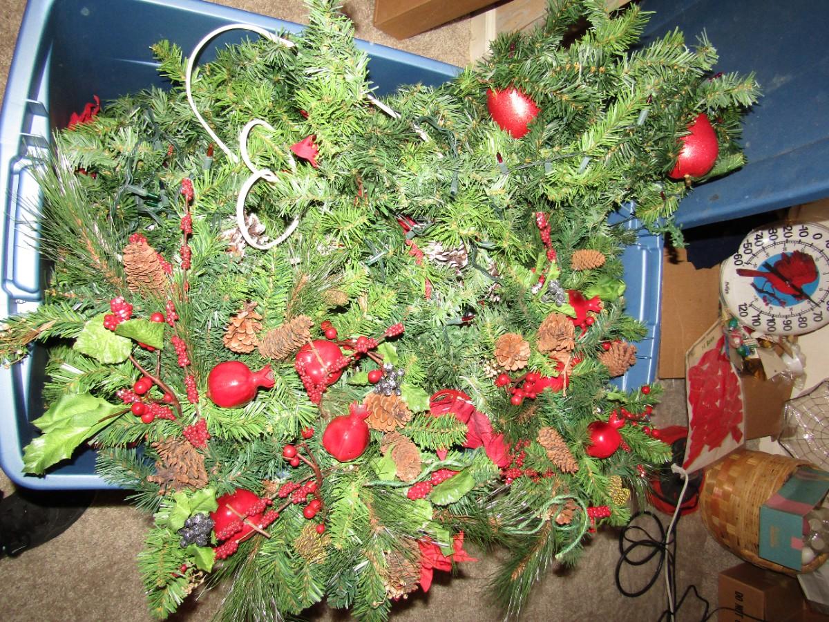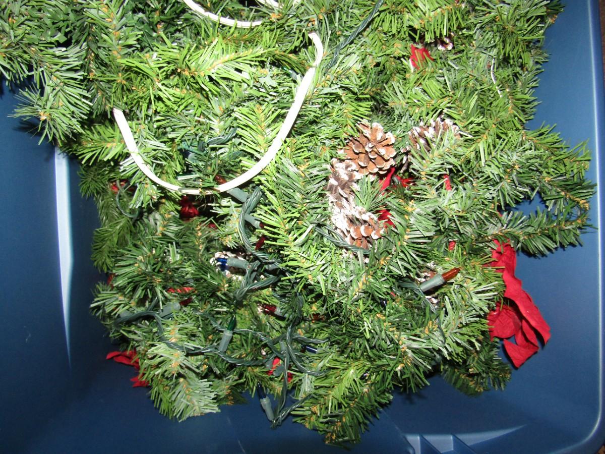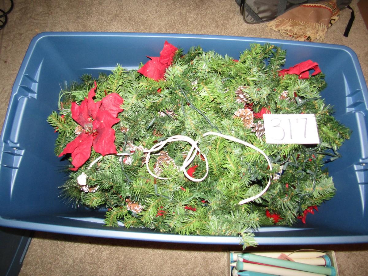 LARGE TOTE (INCLUDED) WITH LONG LIGHTED CHRISTMAS GARLAND. ALSO 3 CHRISTMAS SWAGS