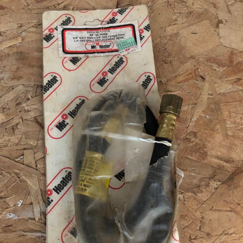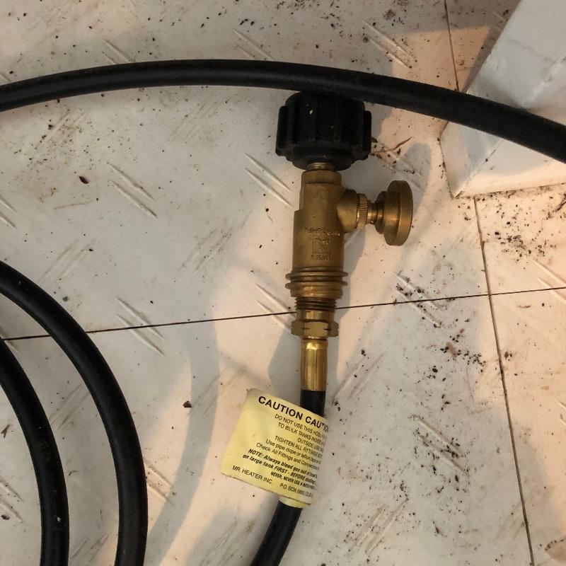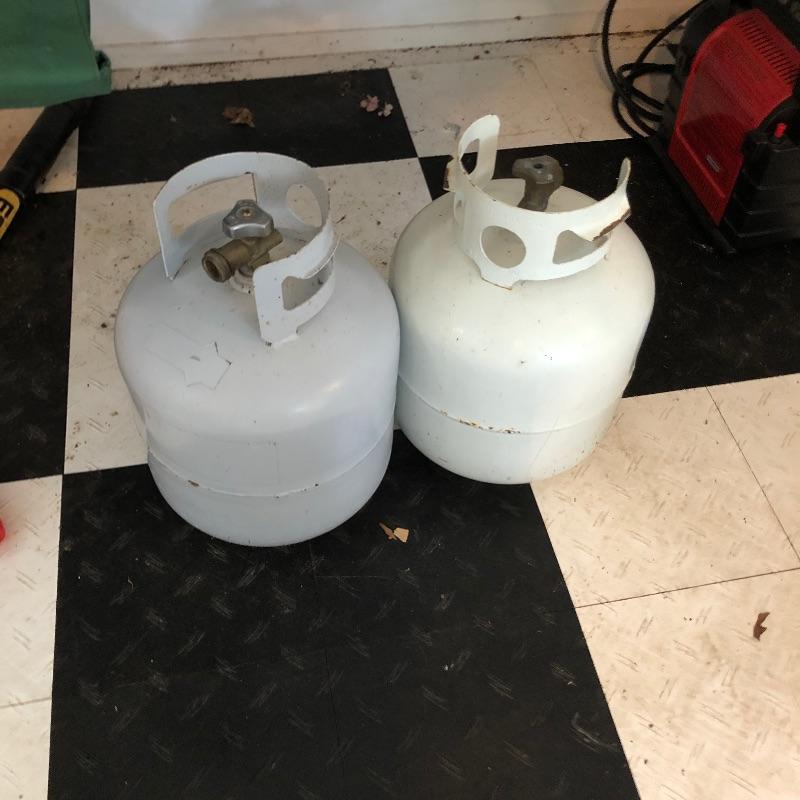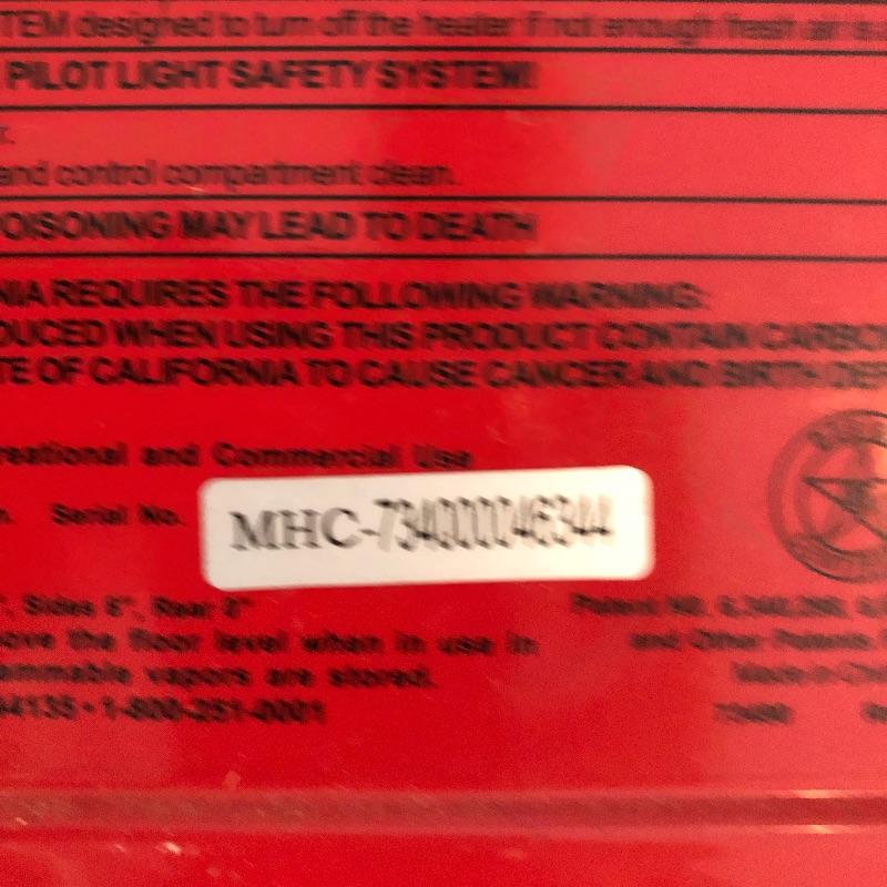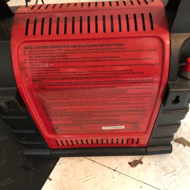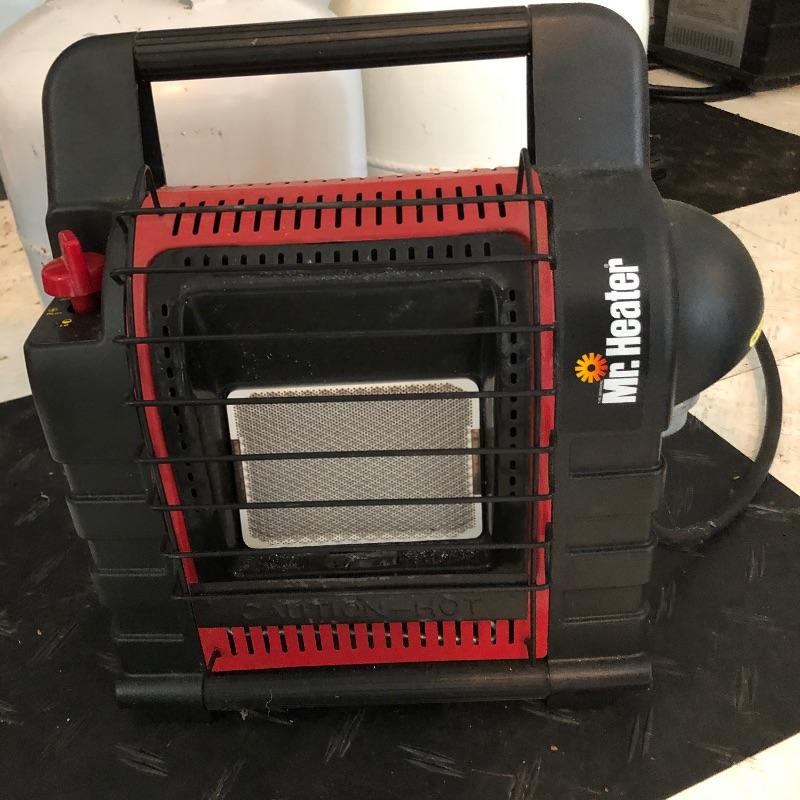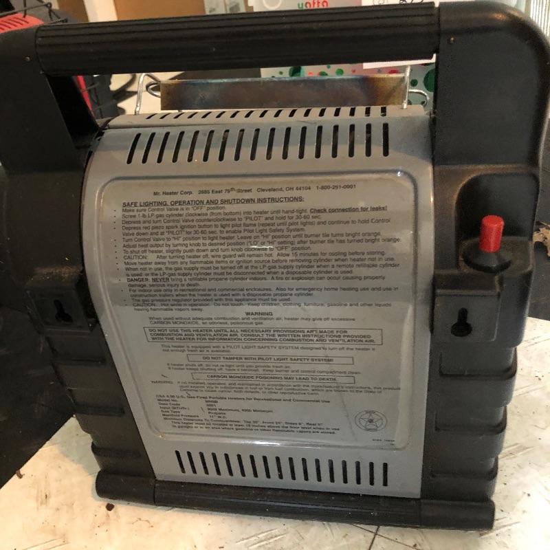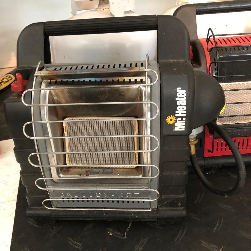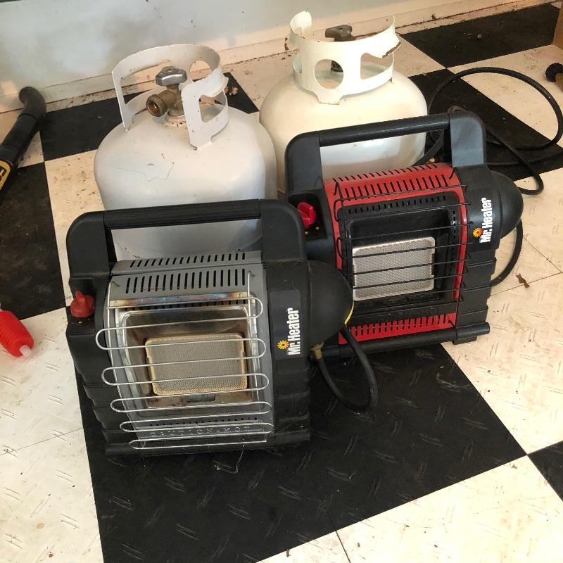 We have two Mr. Heaters and two propane tanks here to have you all ready for winter. No need to worry if you have no power with these two appliances. We did not test either heater. Both of the propane tanks appear to be close to full. See images for model number on the red heater, no number was found on the other. Also included is an extra cable.