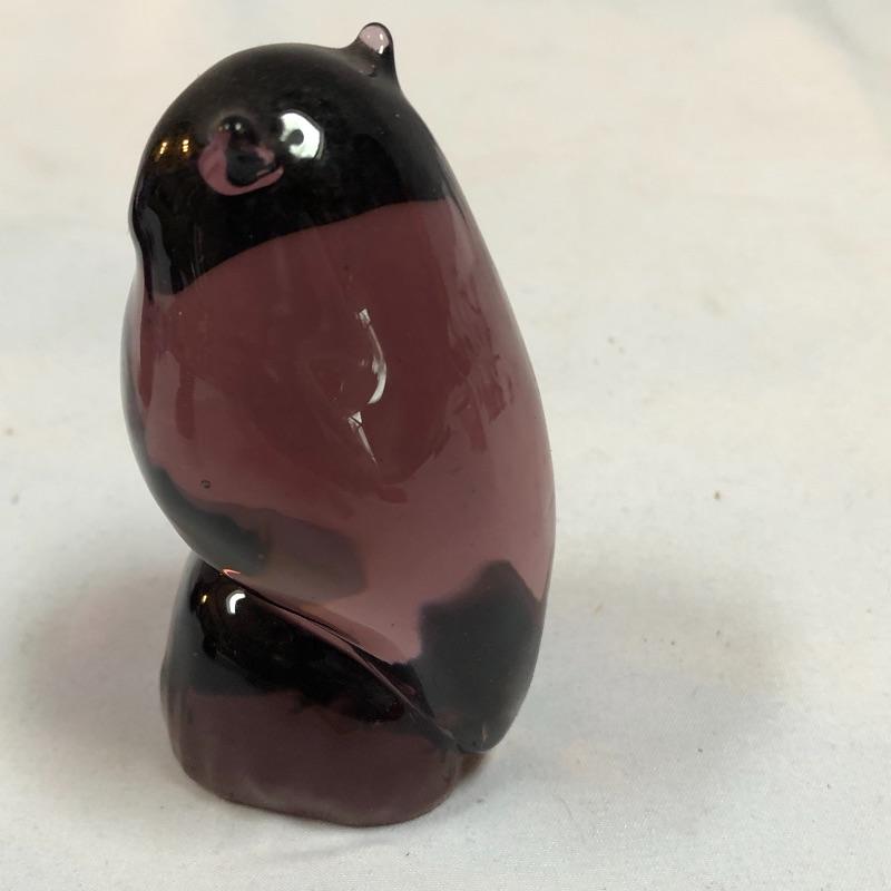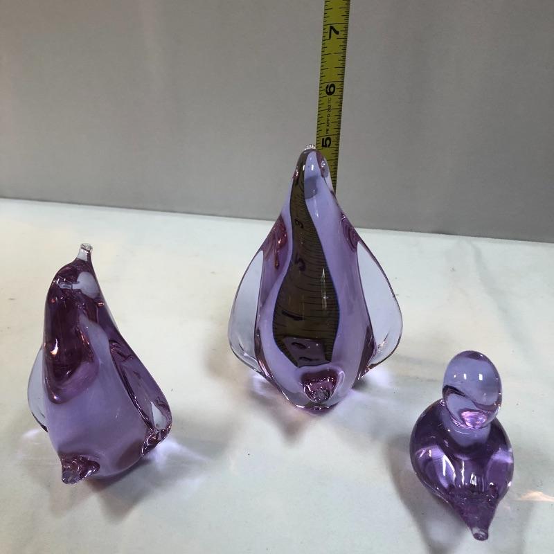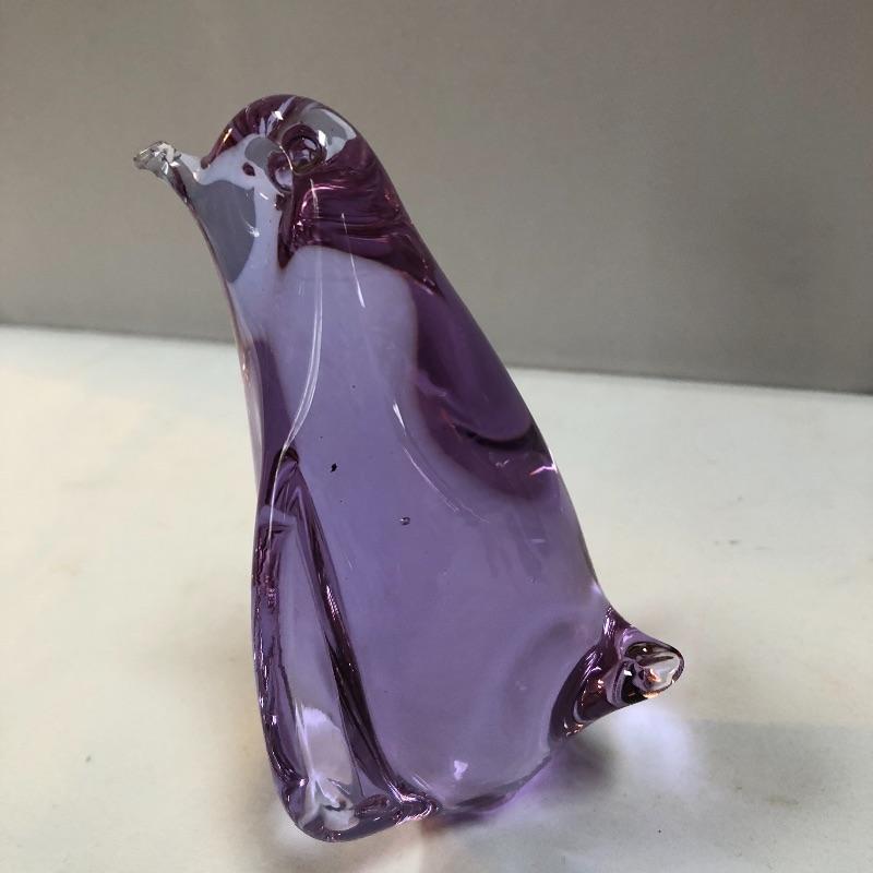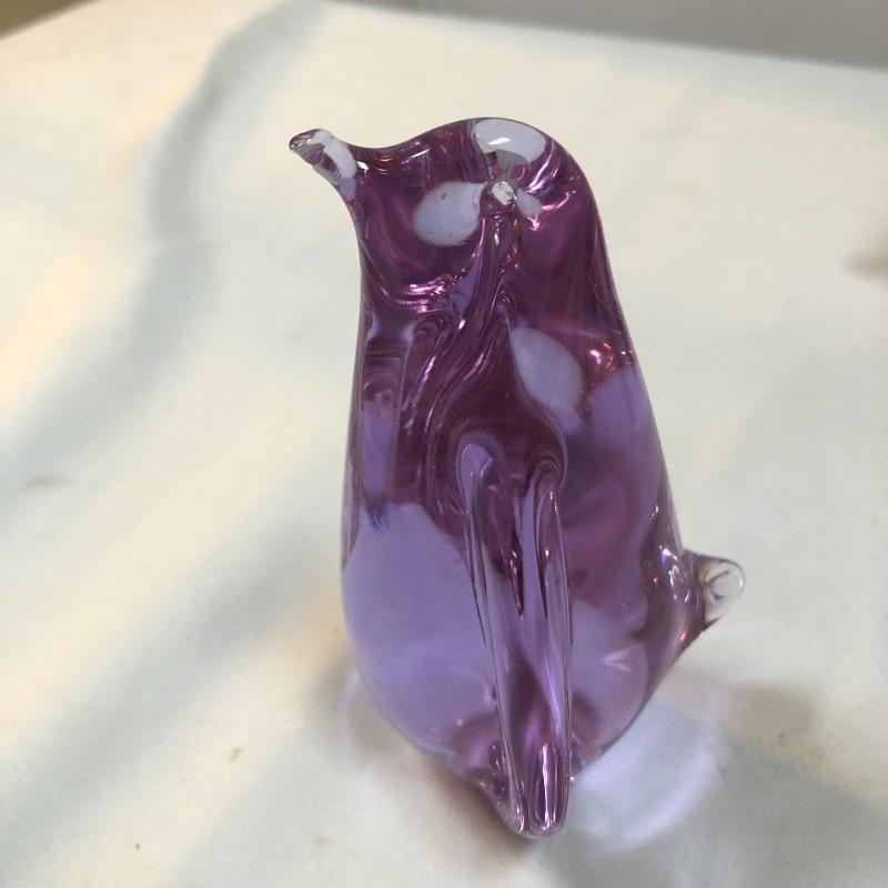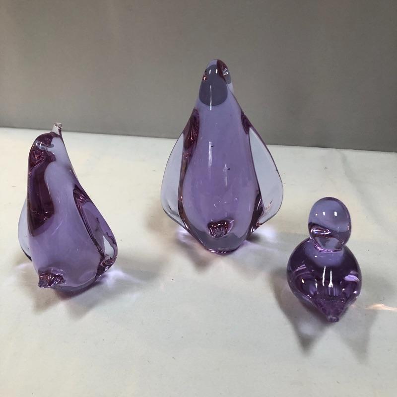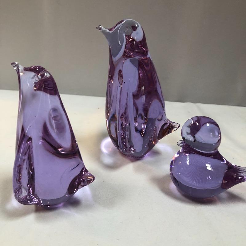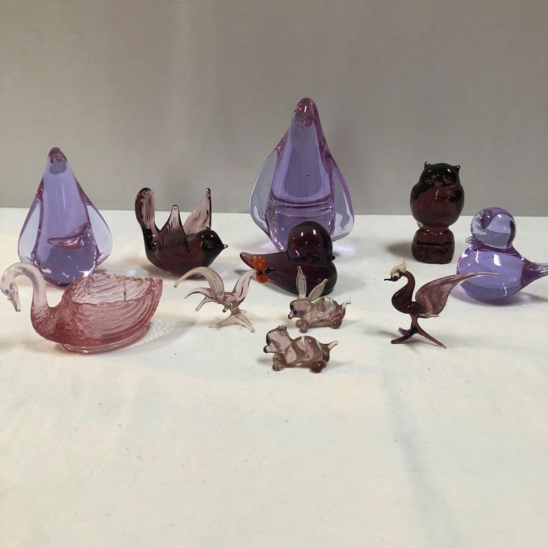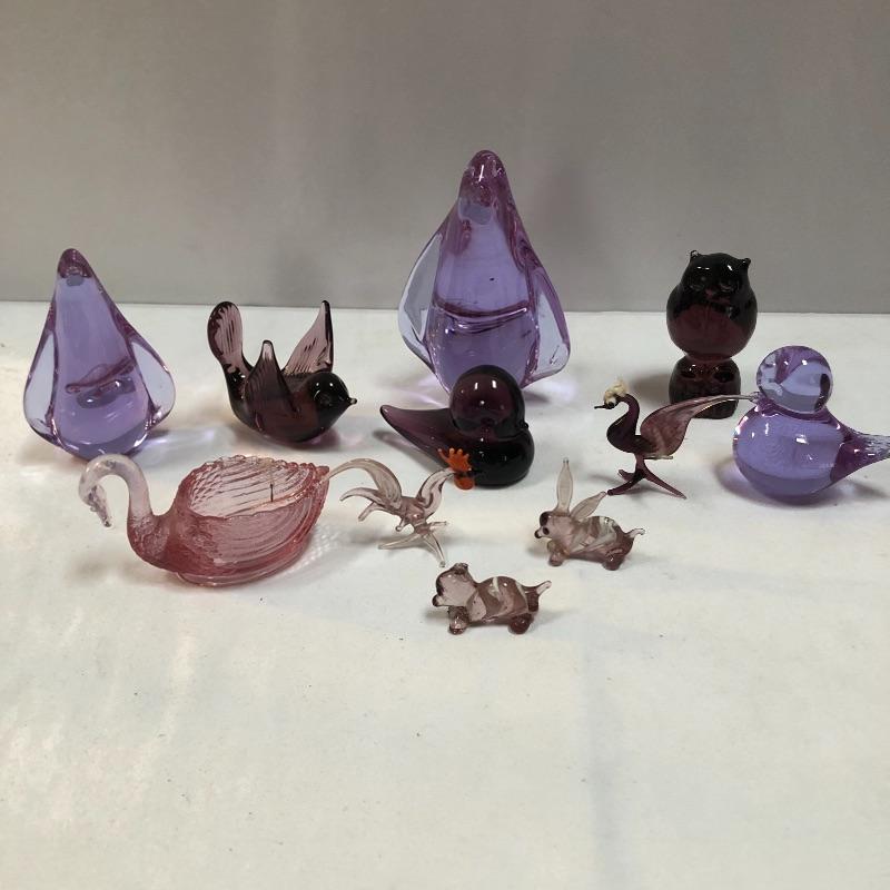 Enjoy this cute lot! This lot includes eleven pieces of glass with four of the pieces being hand blown. Note the different shades of purple. The large light purple Penguin has a small chip on his beak. The little bear cub has small chips on his ears. Shipping available.