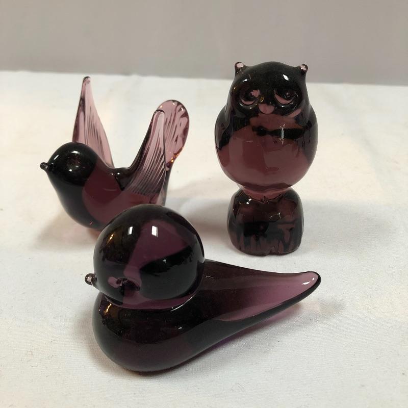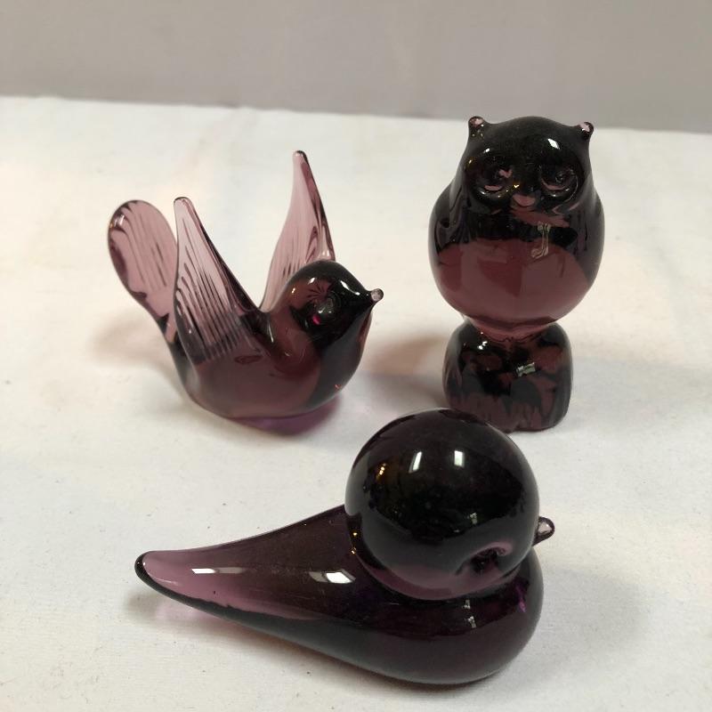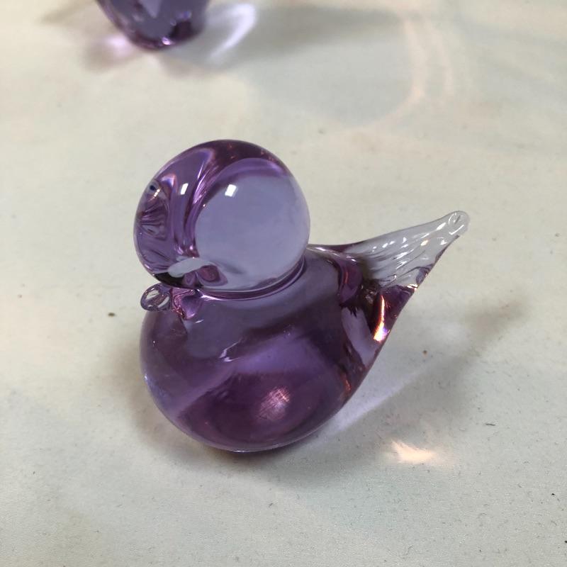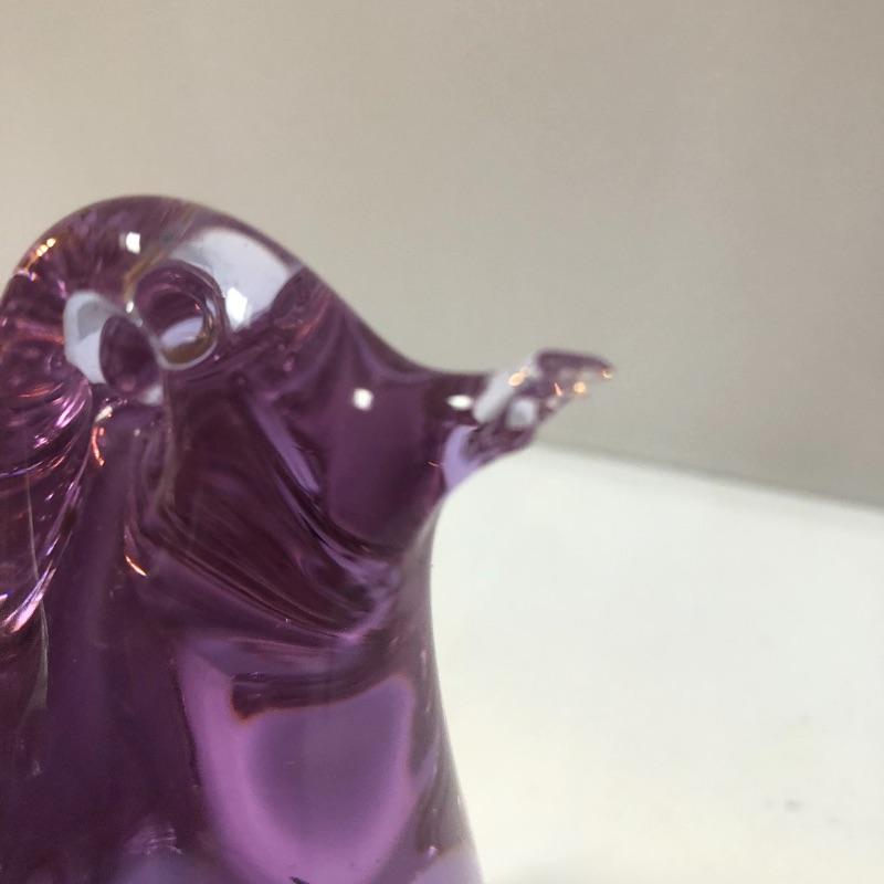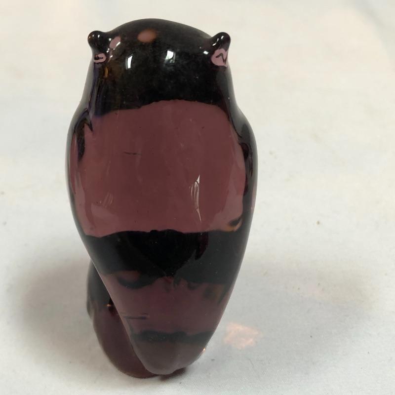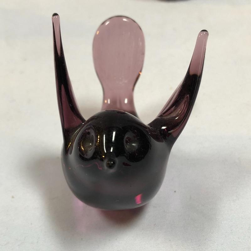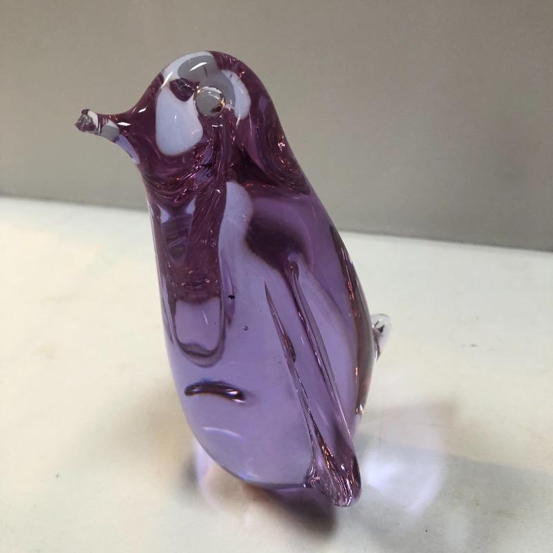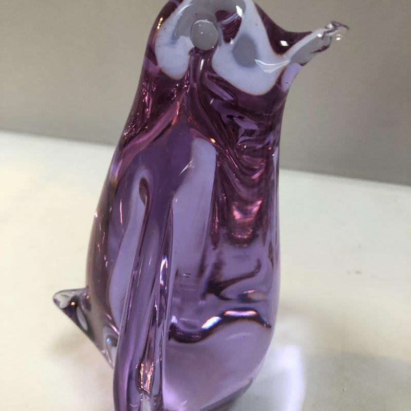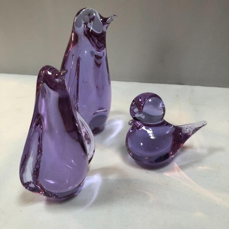 Enjoy this cute lot! This lot includes eleven pieces of glass with four of the pieces being hand blown. Note the different shades of purple. The large light purple Penguin has a small chip on his beak. The little bear cub has small chips on his ears. Shipping available.