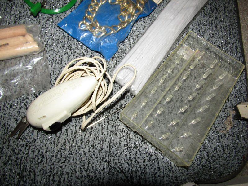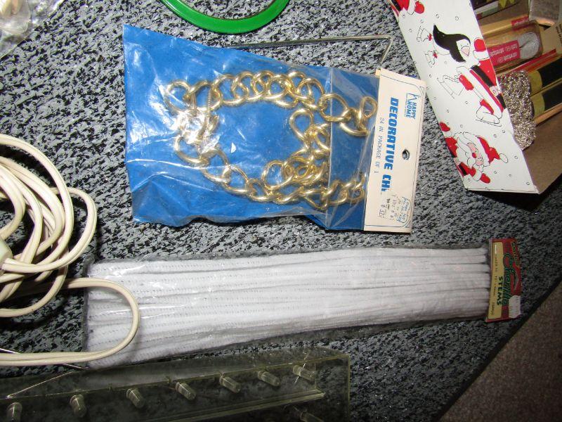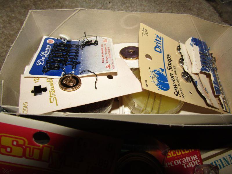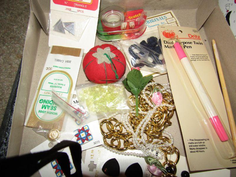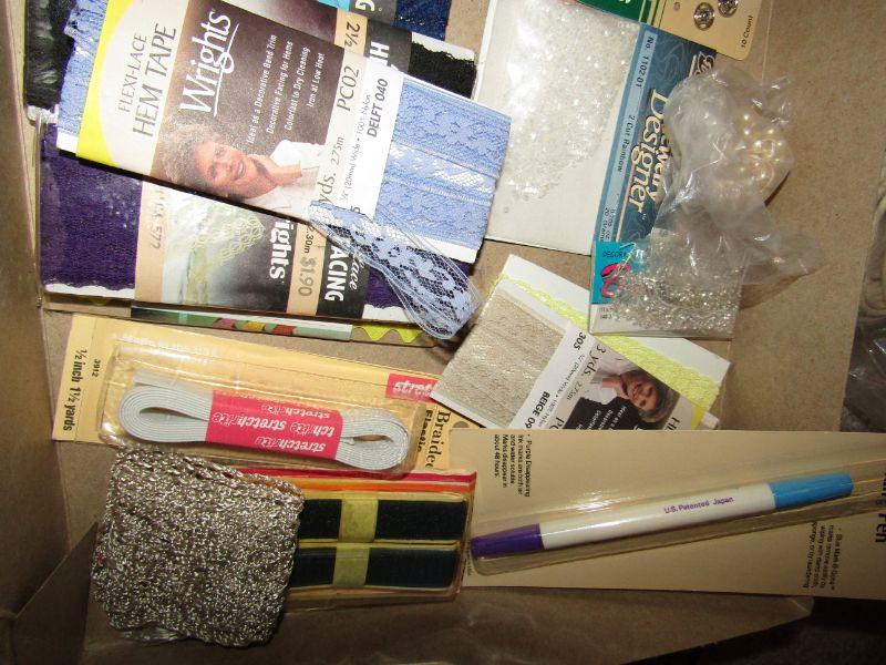 ELECTRIC SCISSORS, PIPE CLEANERS, CRAFT & ACRYLIC PAINT, BUTTONS, MARKING PENS, SEVERAL PACKAGES OF BANDING AND TRIM, PIN CUSHION, GOLD TONE CHAIN, HOOK & EYES, SNAPS SCISSORS AND MORE