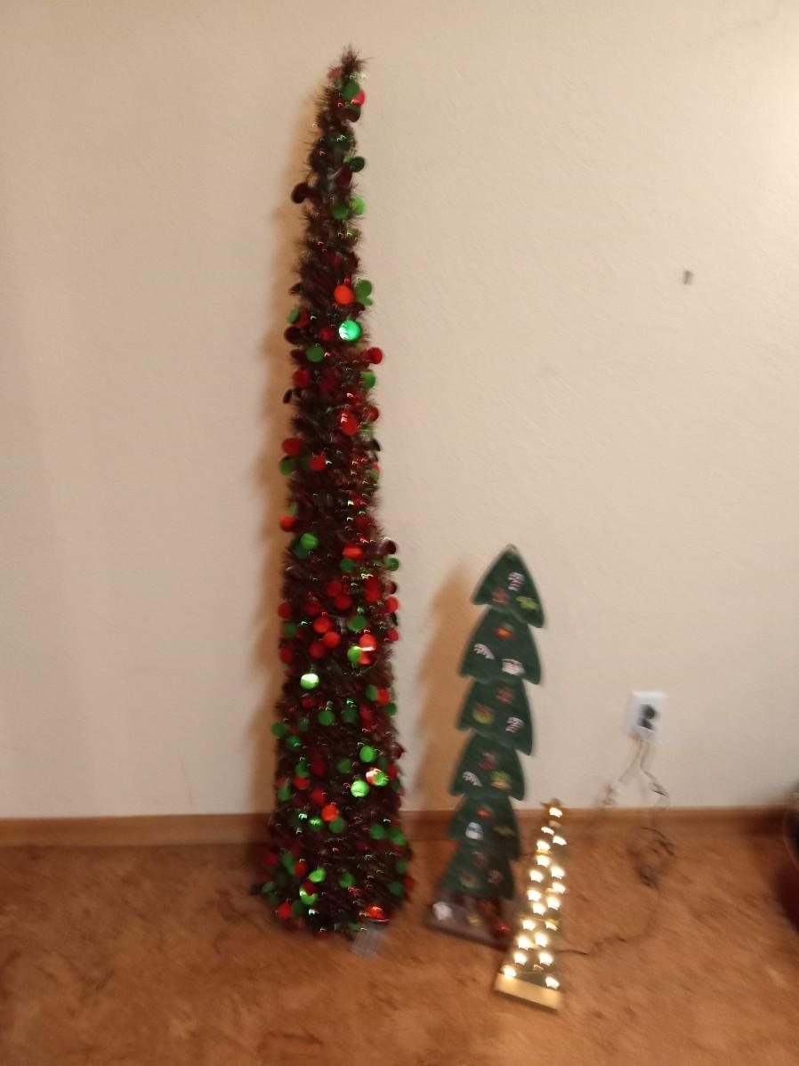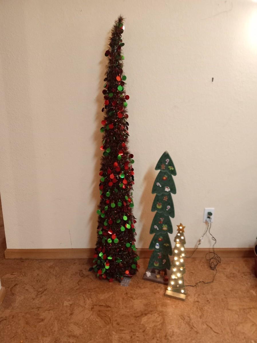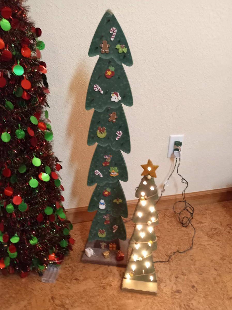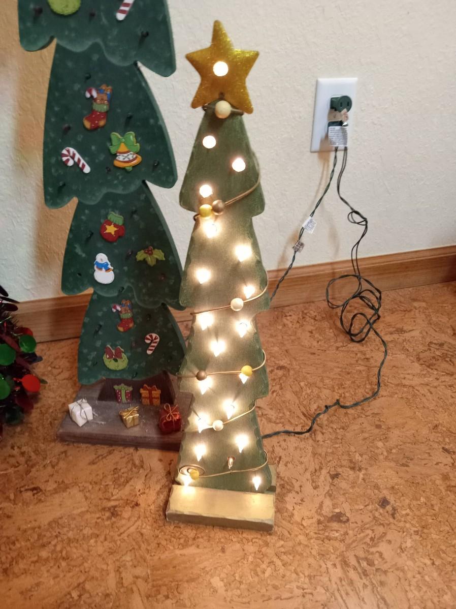 2 WOODEN TREES WITH LIGHTS, THE GREEN TREES LIGHTS ARE NOT WORKING