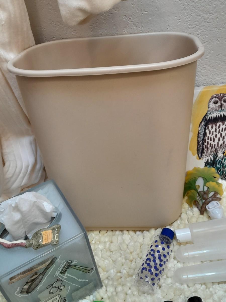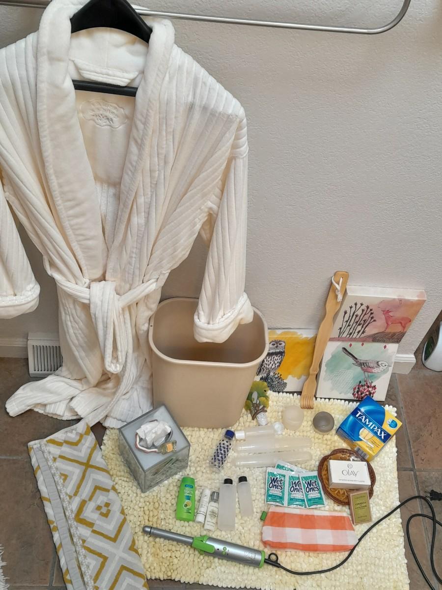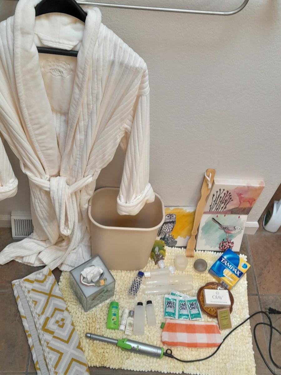 BATH RUG, TRASH CAN, ROBE, CURLING IRON, WALL HANGINGS, BATHROOM DECOR AND BATH, BEAUTY AND HYGIENE PRODUCTS