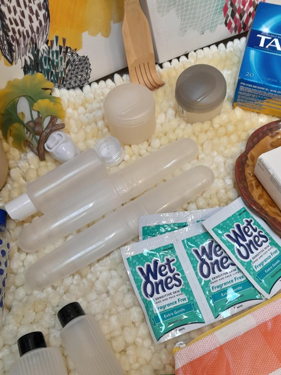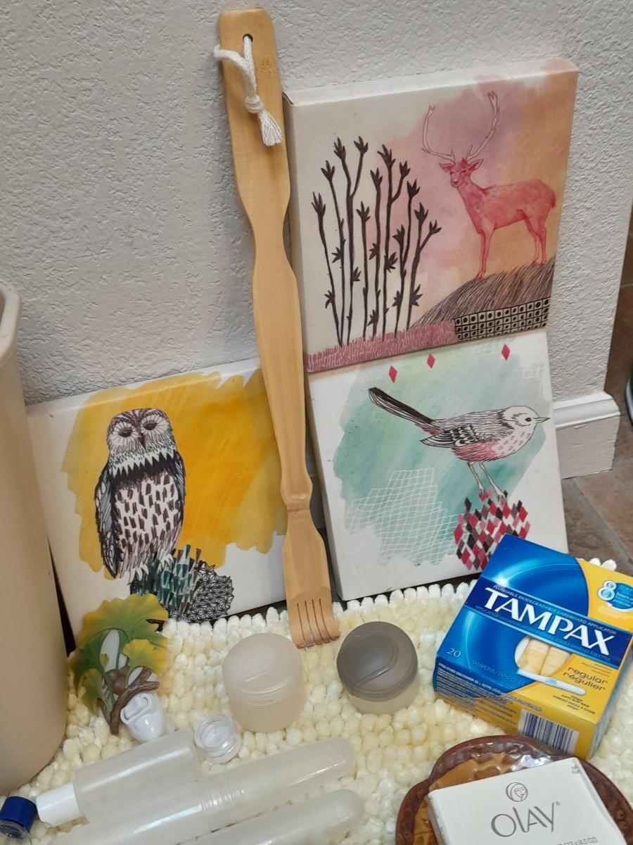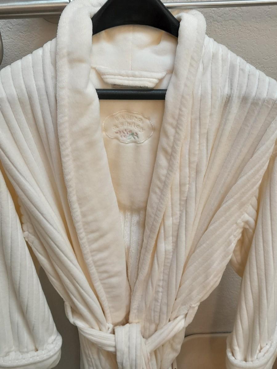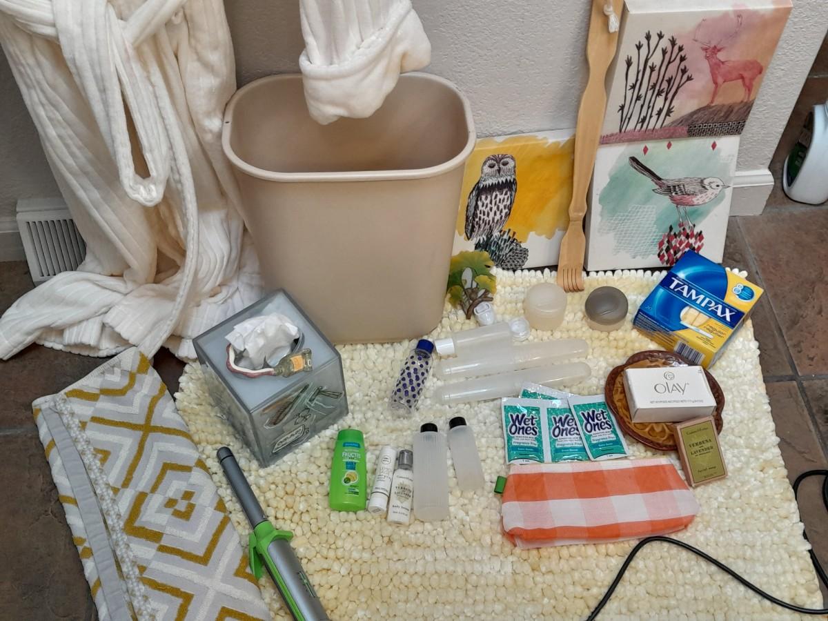 BATH RUG, TRASH CAN, ROBE, CURLING IRON, WALL HANGINGS, BATHROOM DECOR AND BATH, BEAUTY AND HYGIENE PRODUCTS