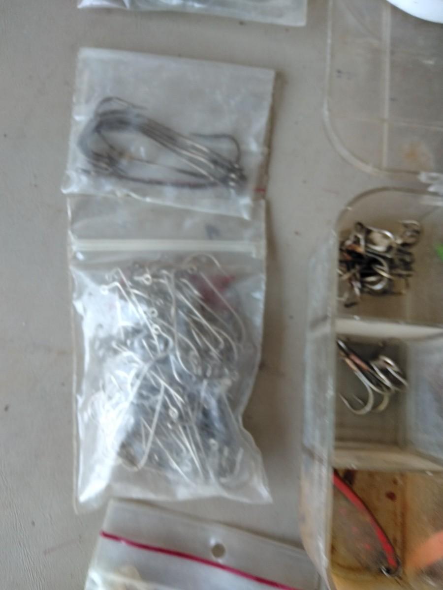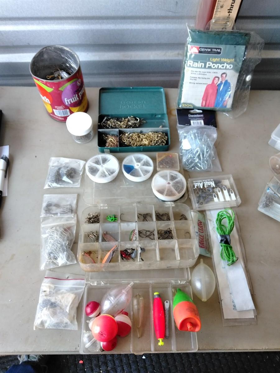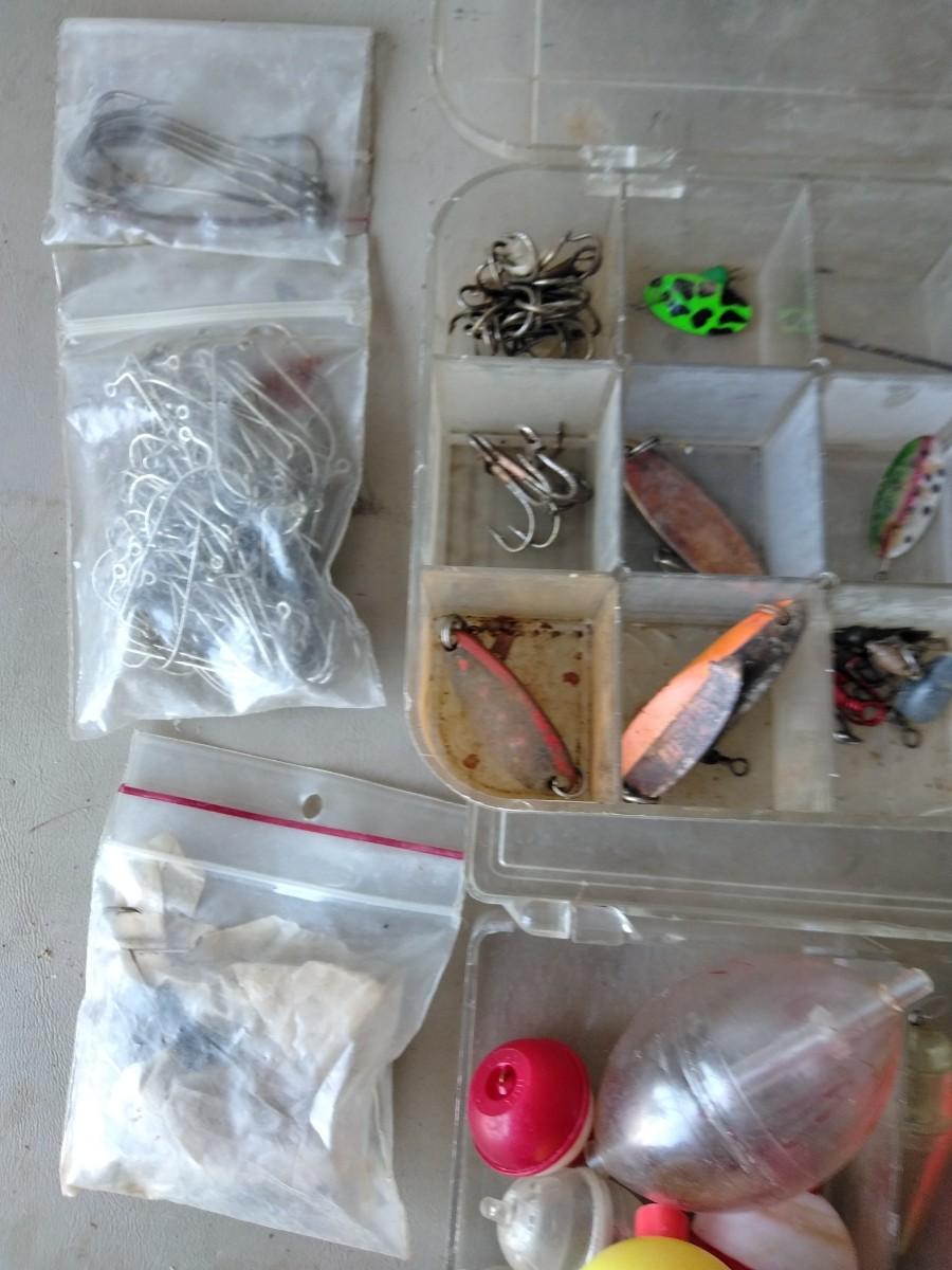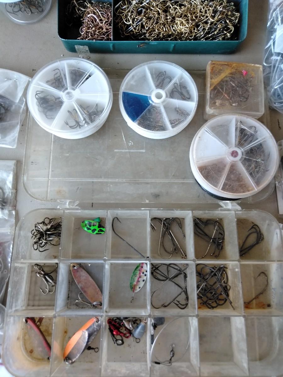 ASSORTMENT OF FISHING TACKLE, HOOKS, SINKERS, AND MORE