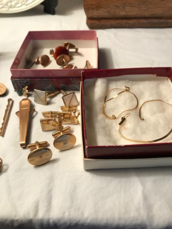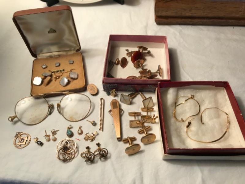 Assorted gold tone jewelry. Antique spectacles, cuff links, earrings, pins, charms and more. Some of these pieces are genuine gold, some are gold filled and some are gold tone
