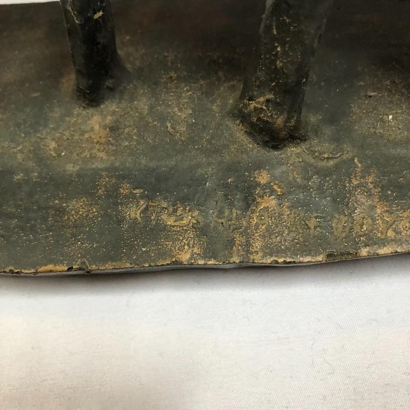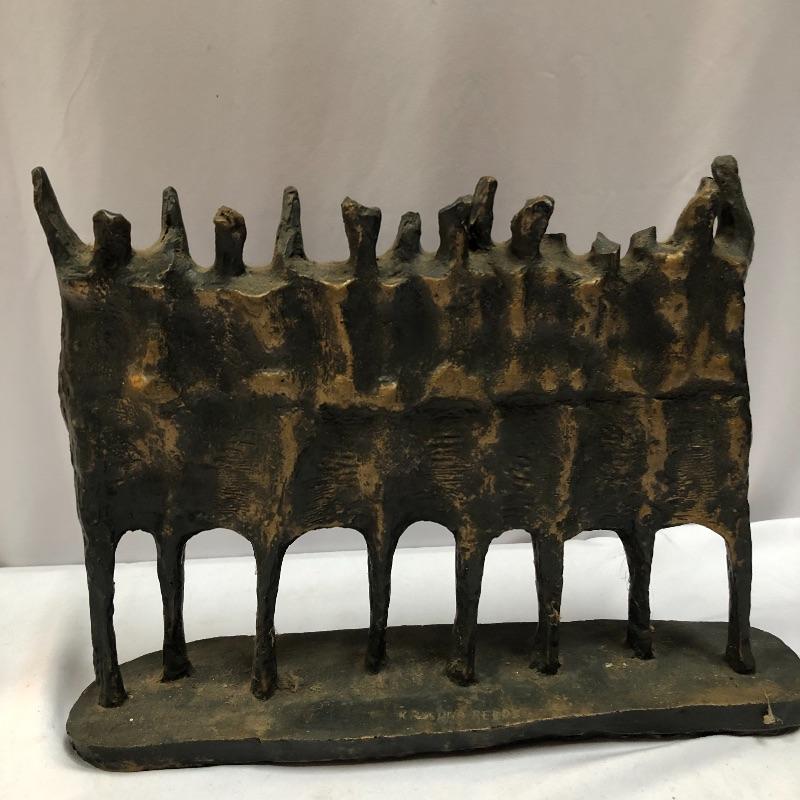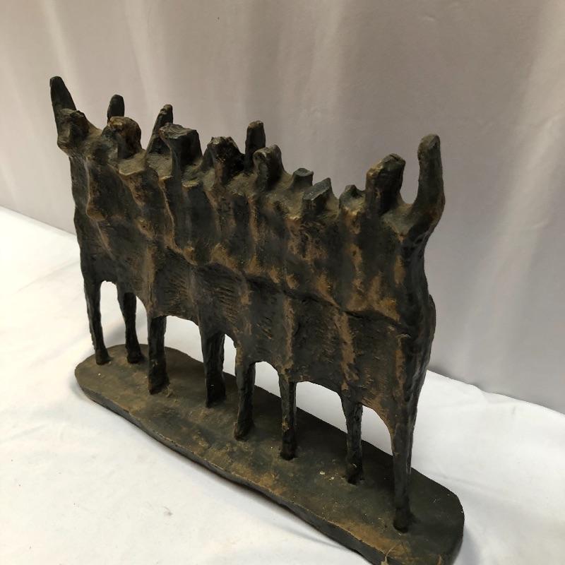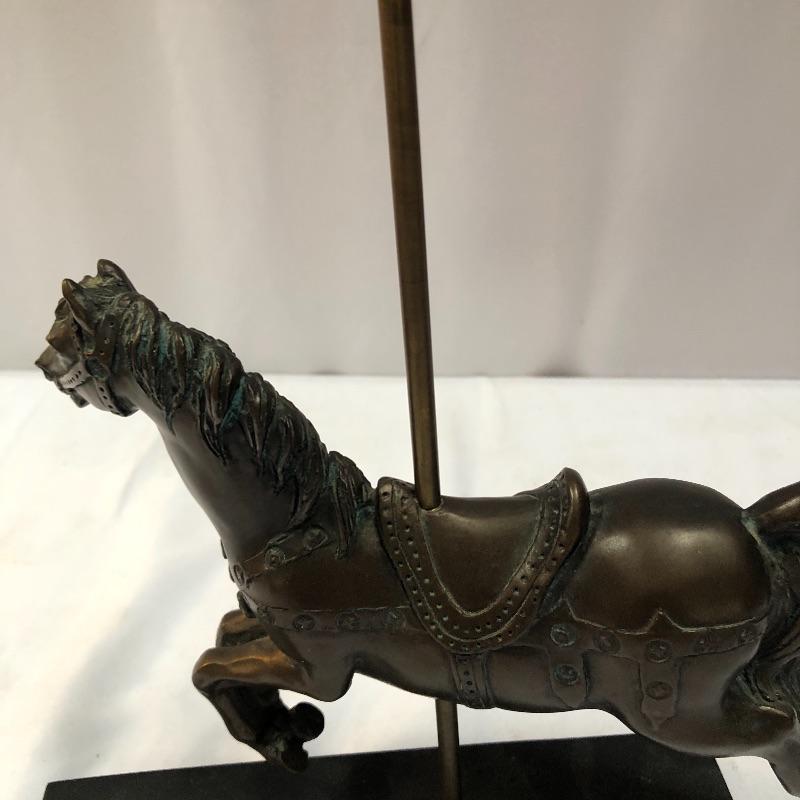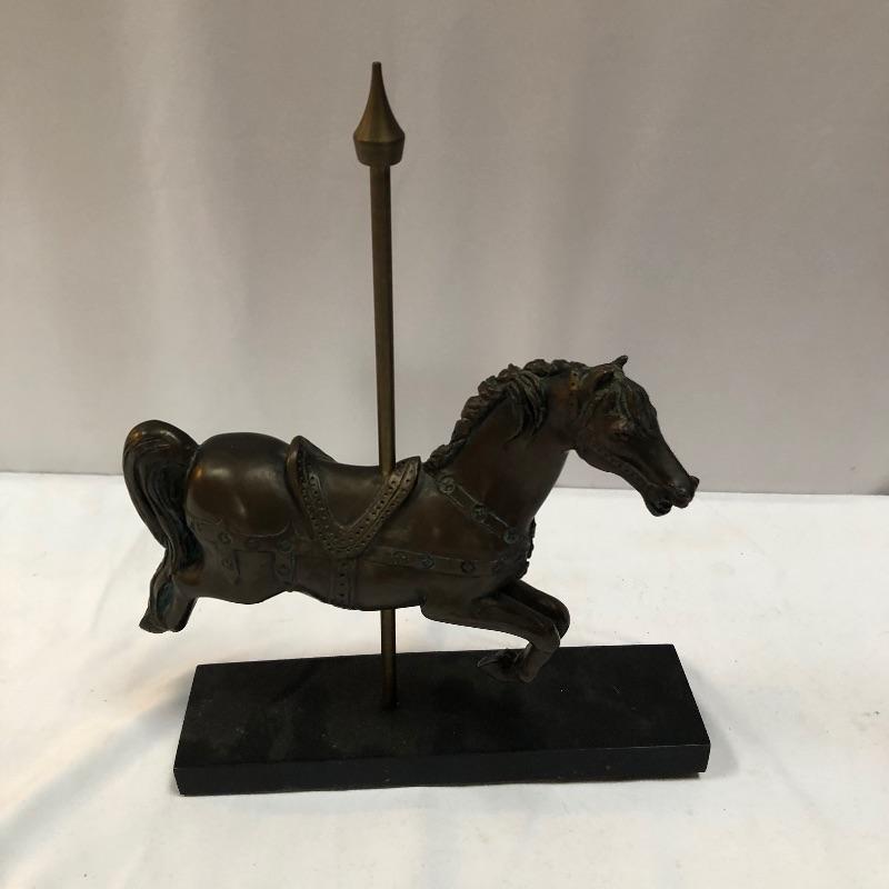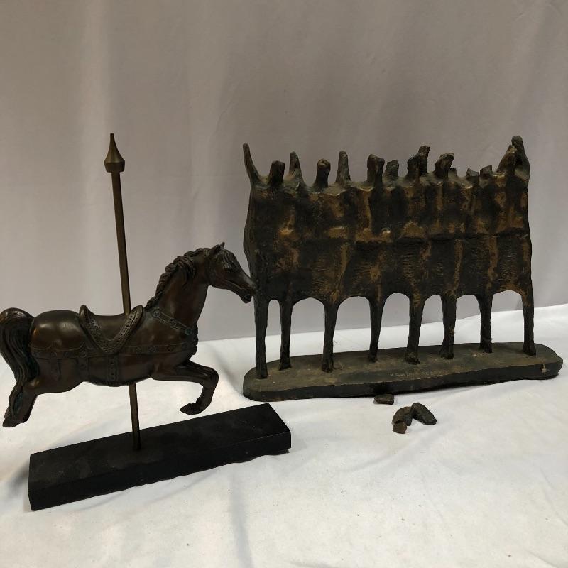 This lot includes two items-one a bronze carousel horse and the other a Krishna Reddy sculpture. The Krishna Reddy sculpture is chipped with the pieces included. The sculpture is named, “The Vision.” Shipping Available.