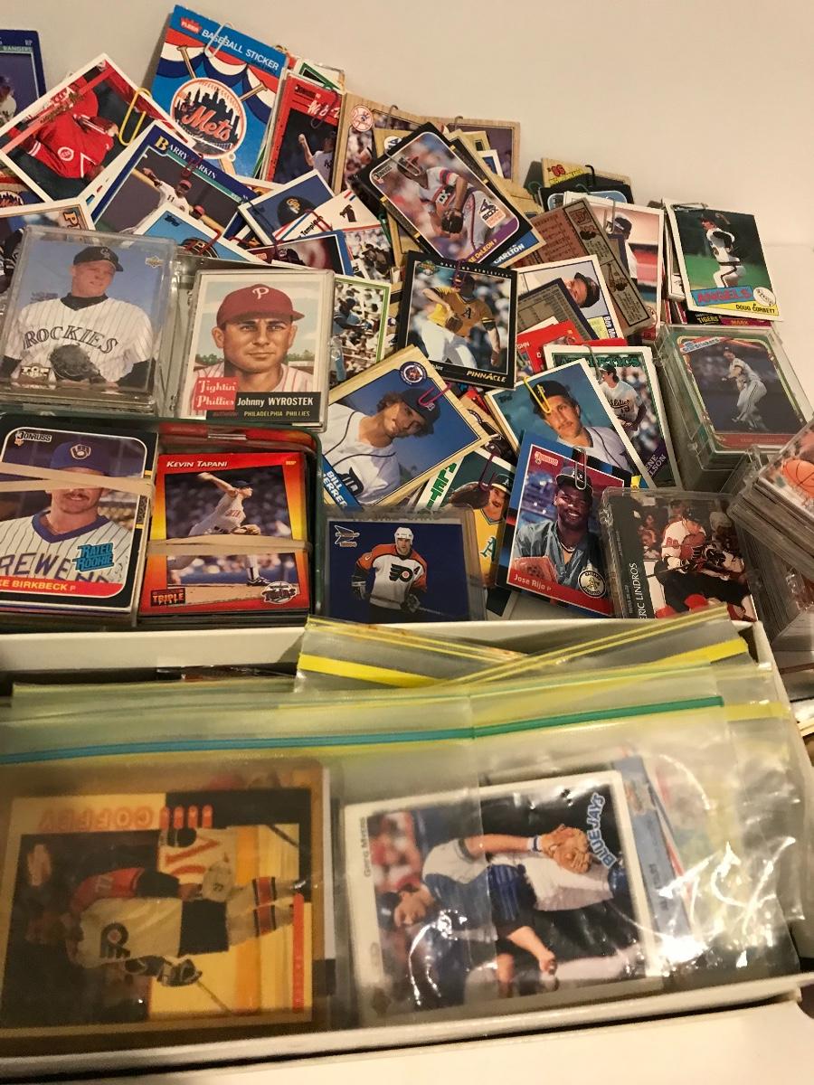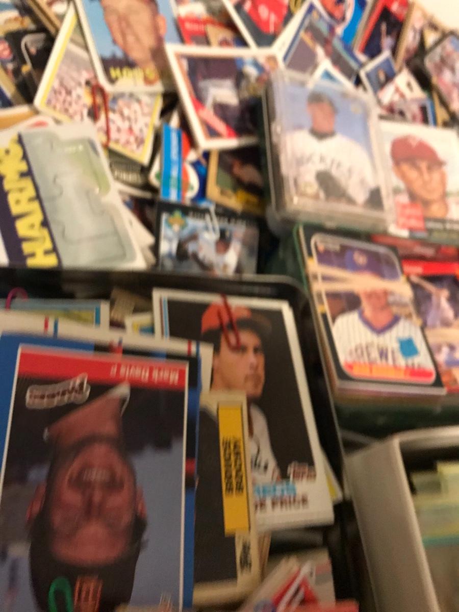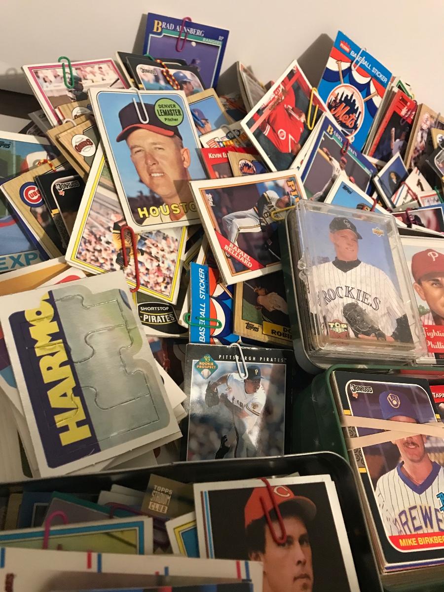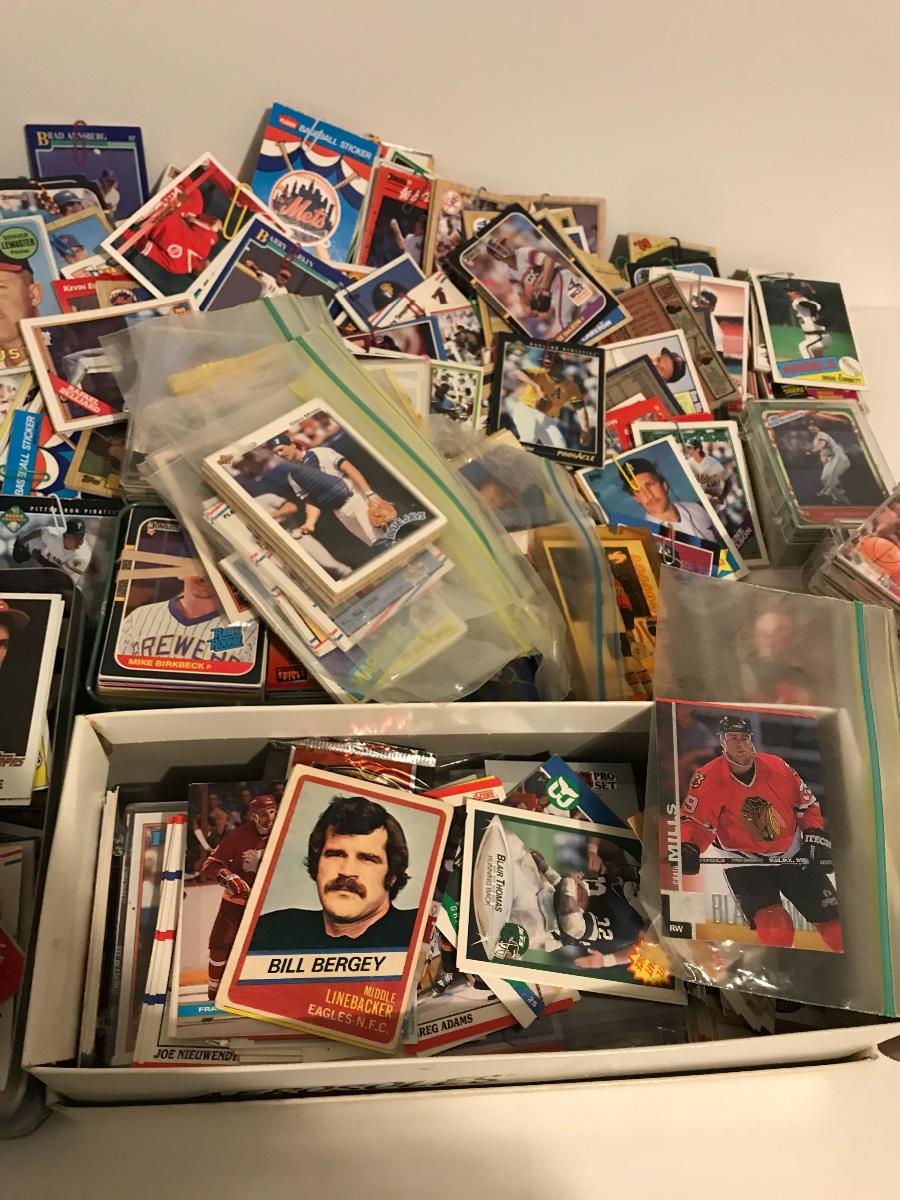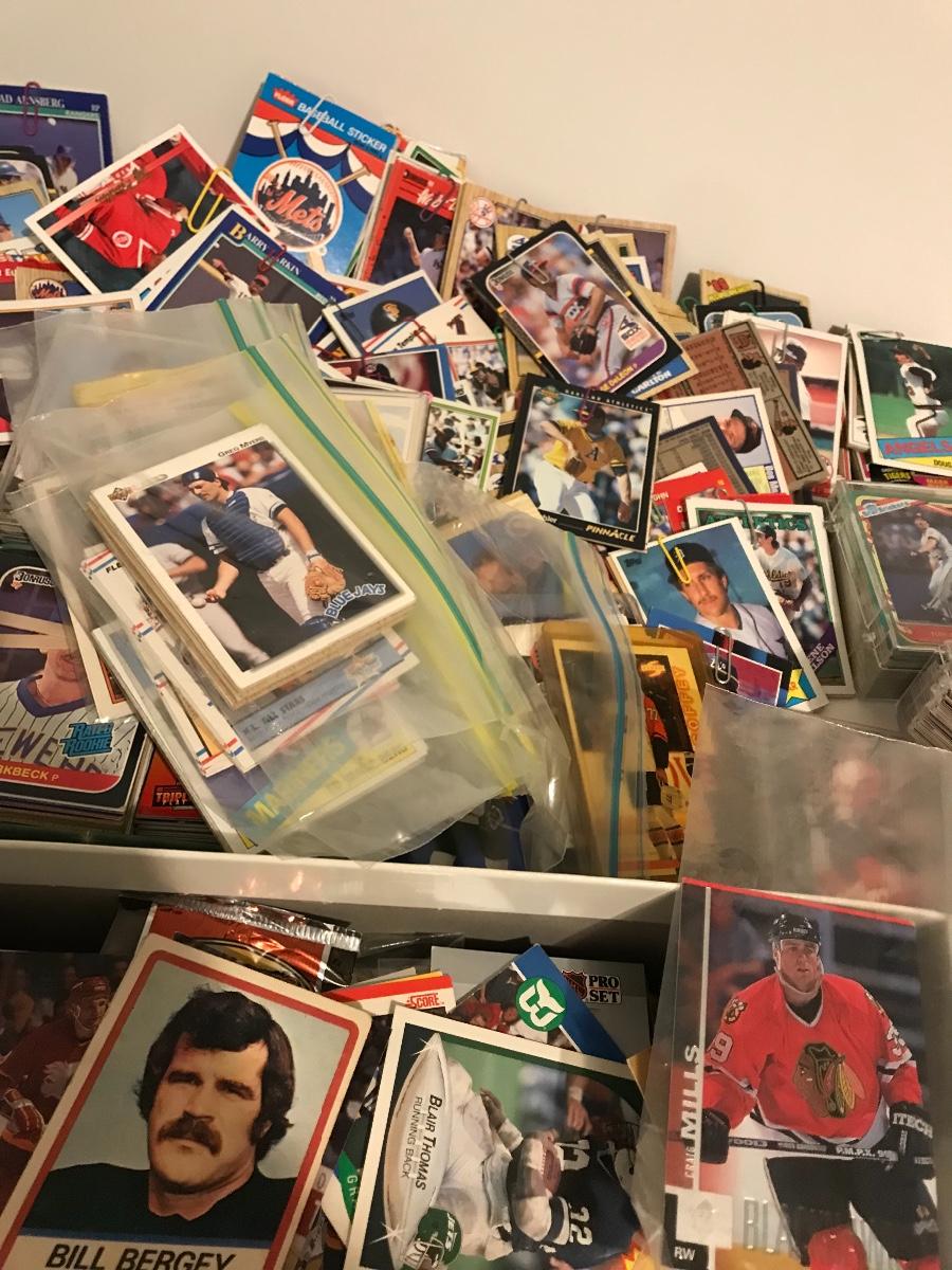 Sports Card Collection- Baseball, Basketball, Football & Hockey. Mostly from the 80s and 90s. Cards are in varying conditions with many held together in bundles with rubber bands and paper clips. Please see all pictures as they are the best representation of the items. The pictures show condition, measurements if taken, and what is included in the lot. Due to the large amount that we photograph and the time frame, we are not always able to take measurements. All items unless noted, are pre-owned and have been used. If you purchased furniture, you must bring help. We do not allow one person to carry large furniture out on their own. Bring help, tools and a truck for the safety of our client’s homes, and your personal safety. Company policy. Thank you.