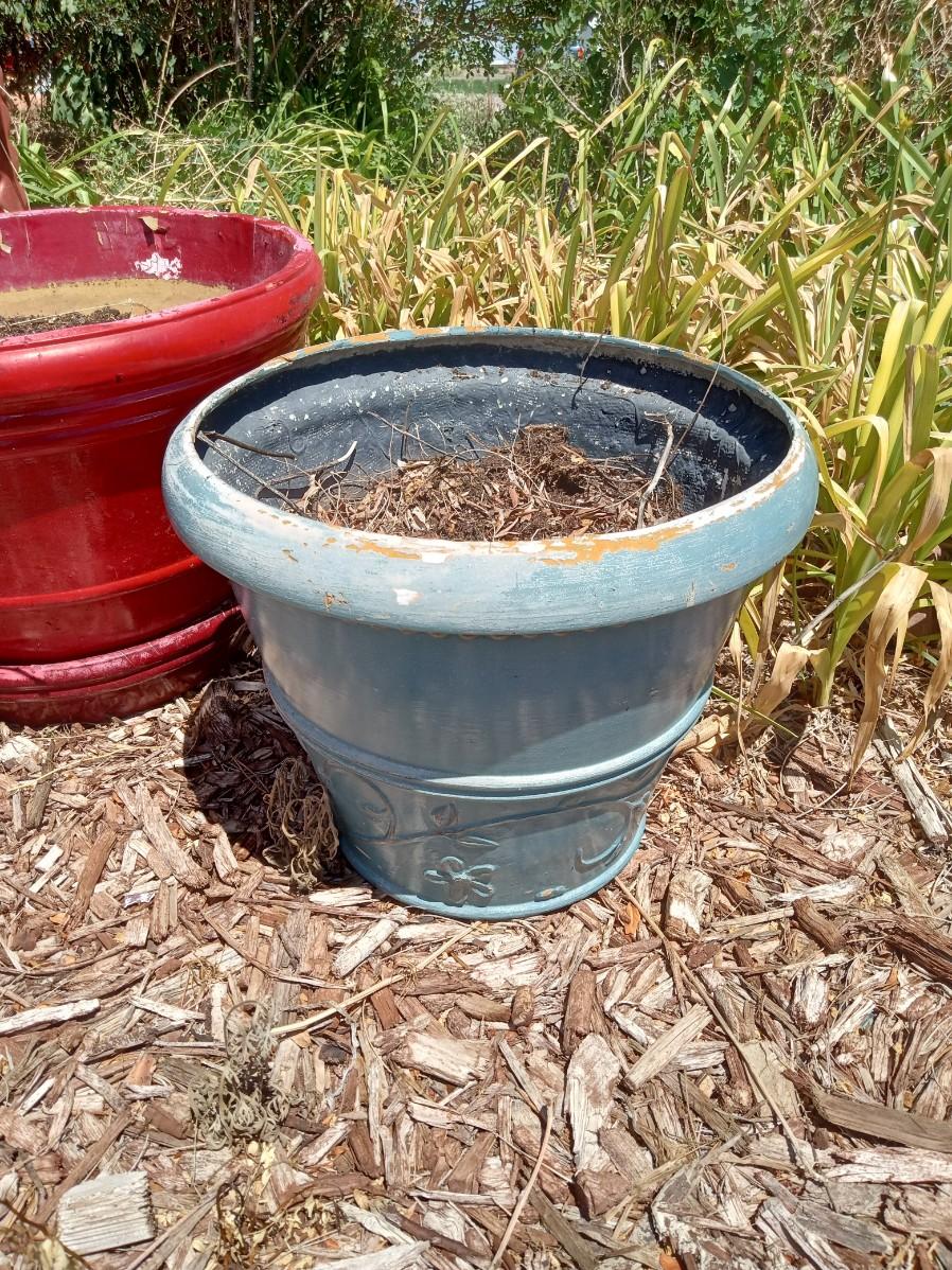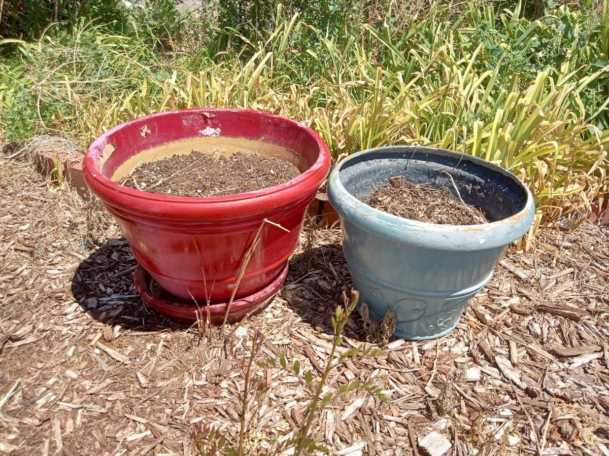 LOT 318  TWO LARGER FLOWER POTS AND A METAL BIRDHOUSE ON HOOK (OB)