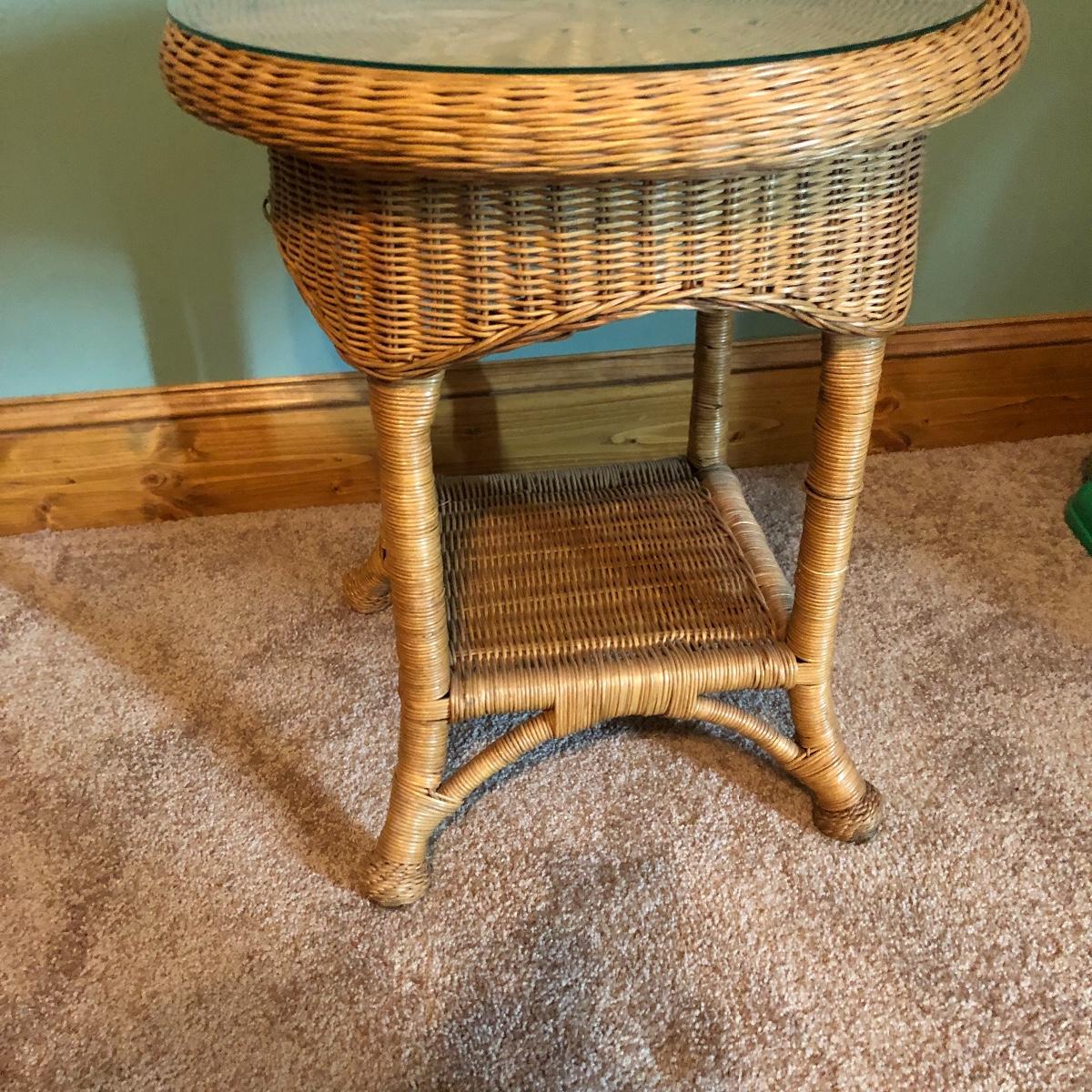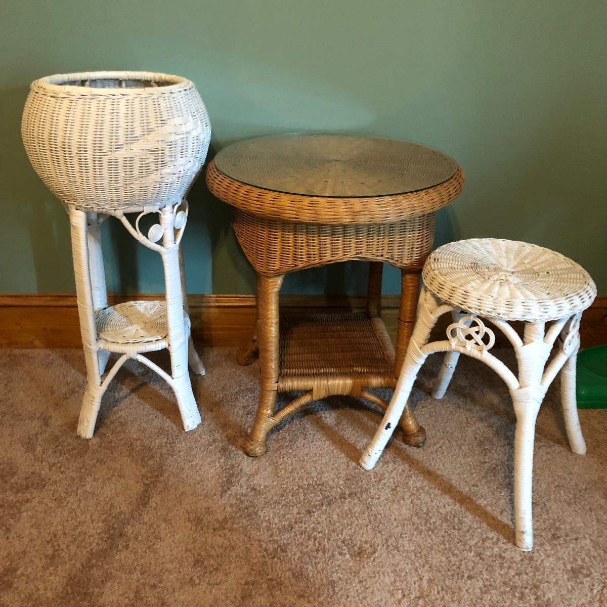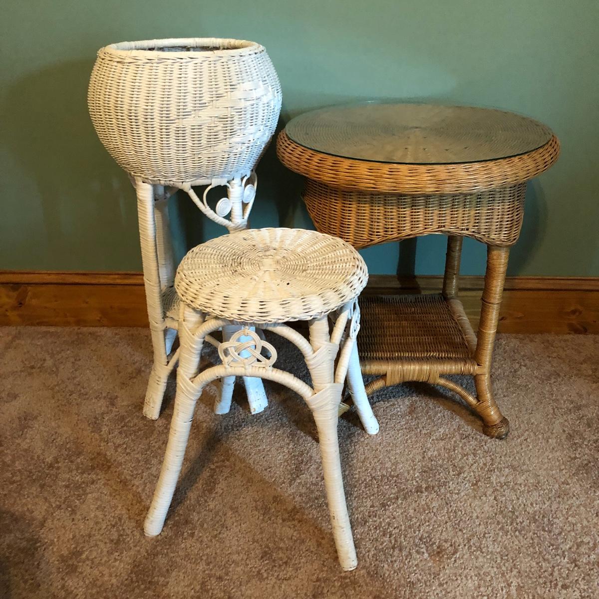 Get that natural feeling in your home with these three pieces of wicker furniture. This lot includes natural color table with glass top and two white plant stands.