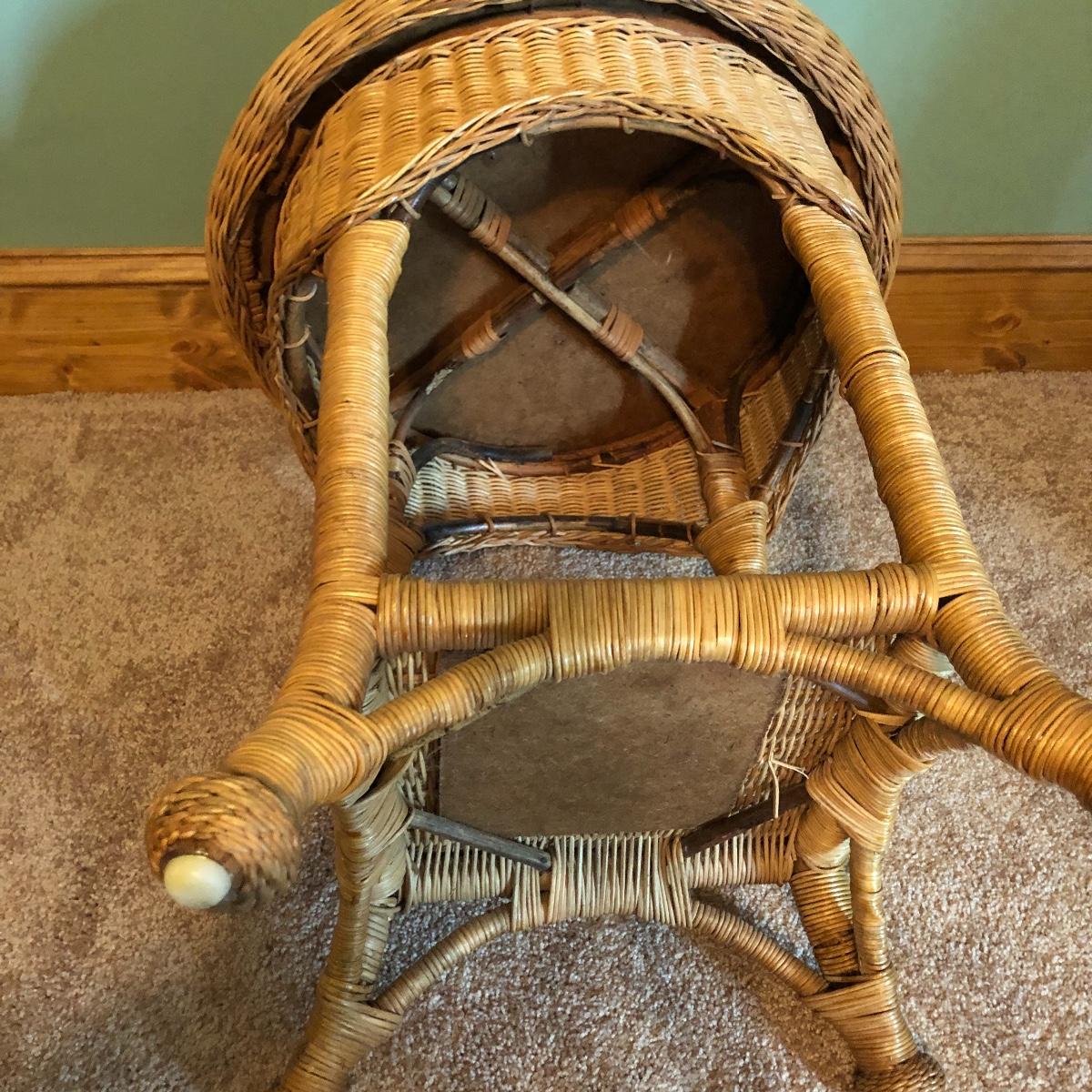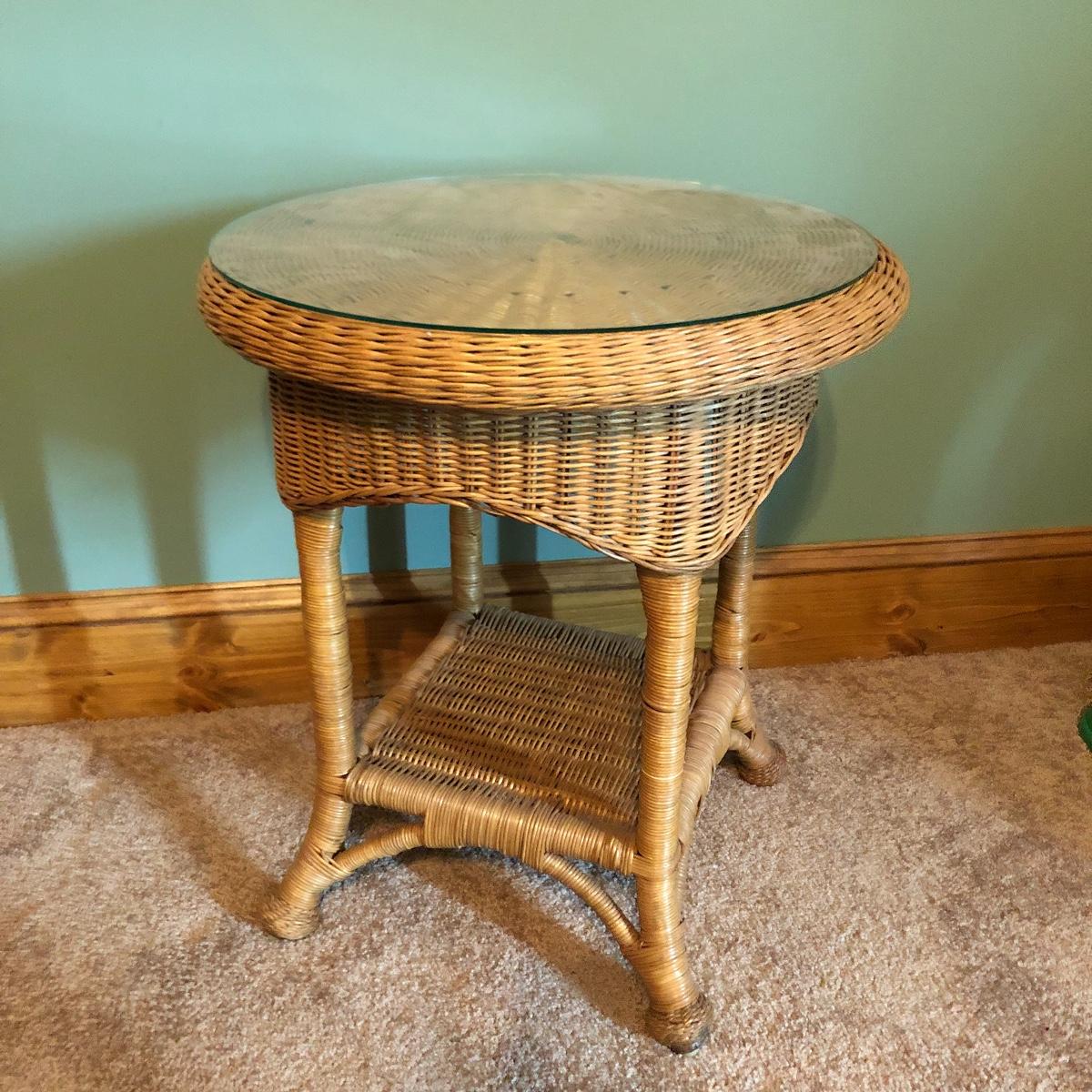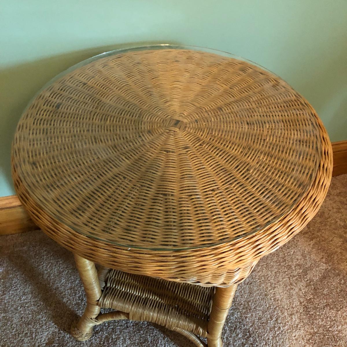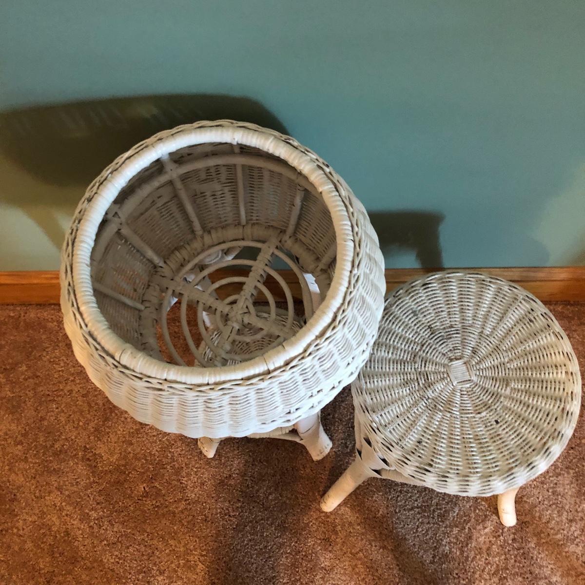 Get that natural feeling in your home with these three pieces of wicker furniture. This lot includes natural color table with glass top and two white plant stands.
