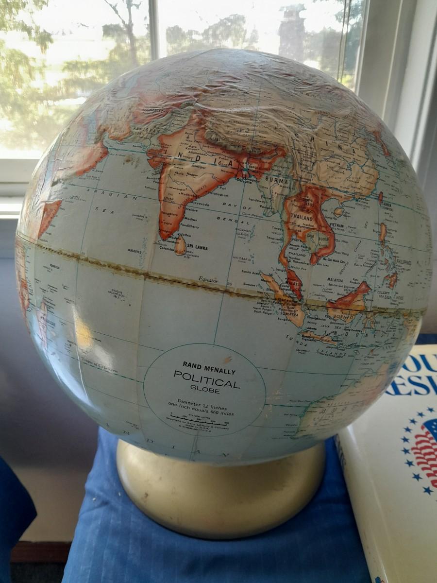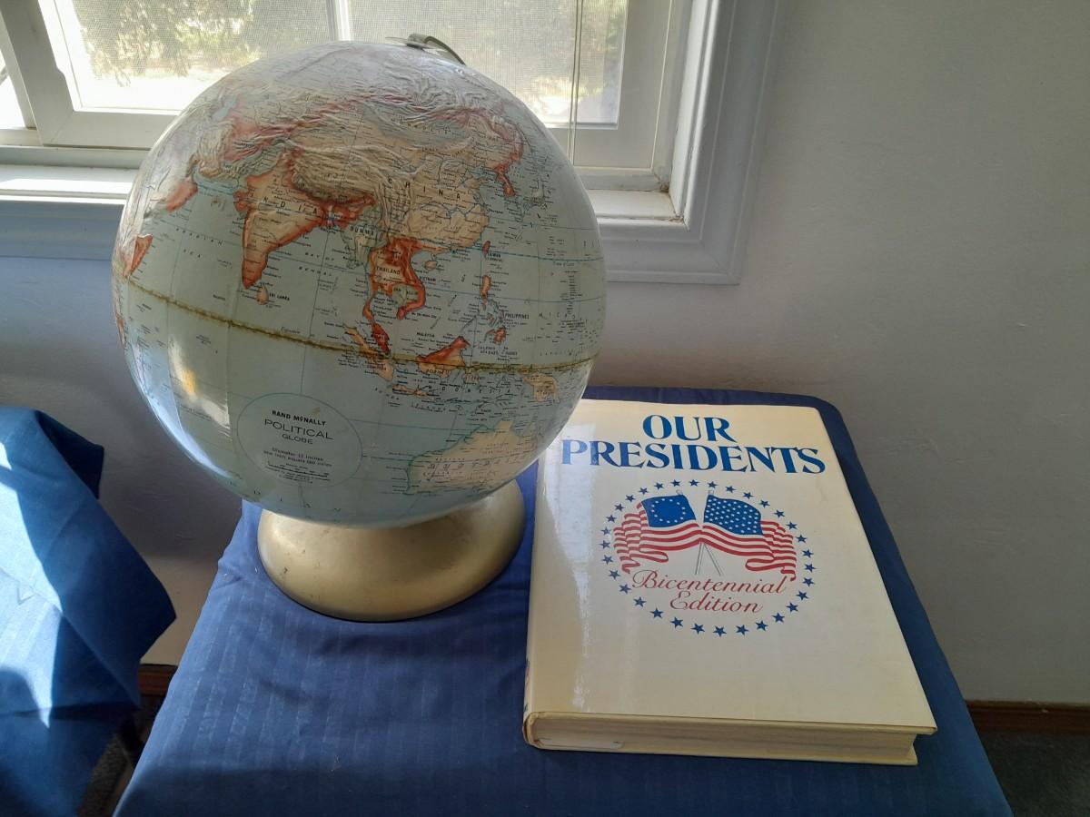 RAND MCNALLY POLITIACAL GLOBE 12" WITH STAND AND OUR PRESIDENT'S HARDBACK BOOK BICENTENNIAL EDITION.