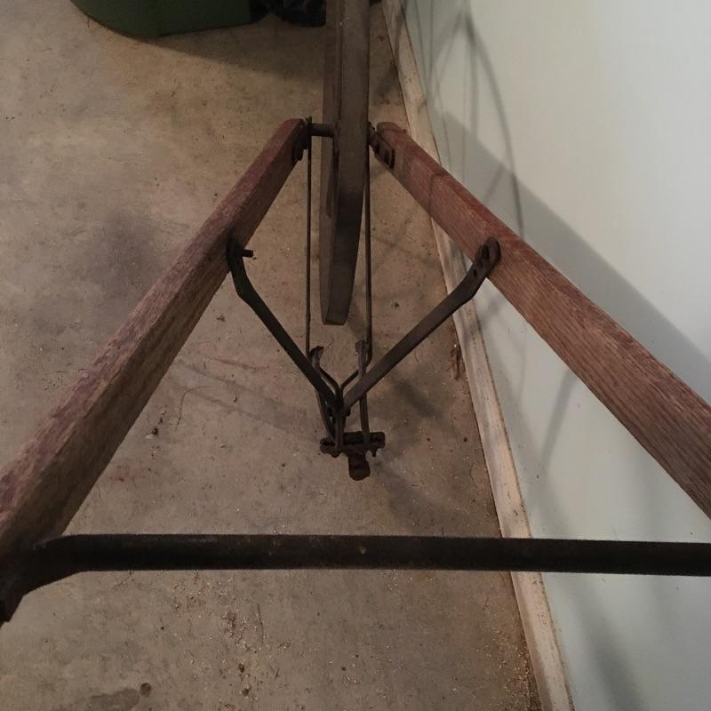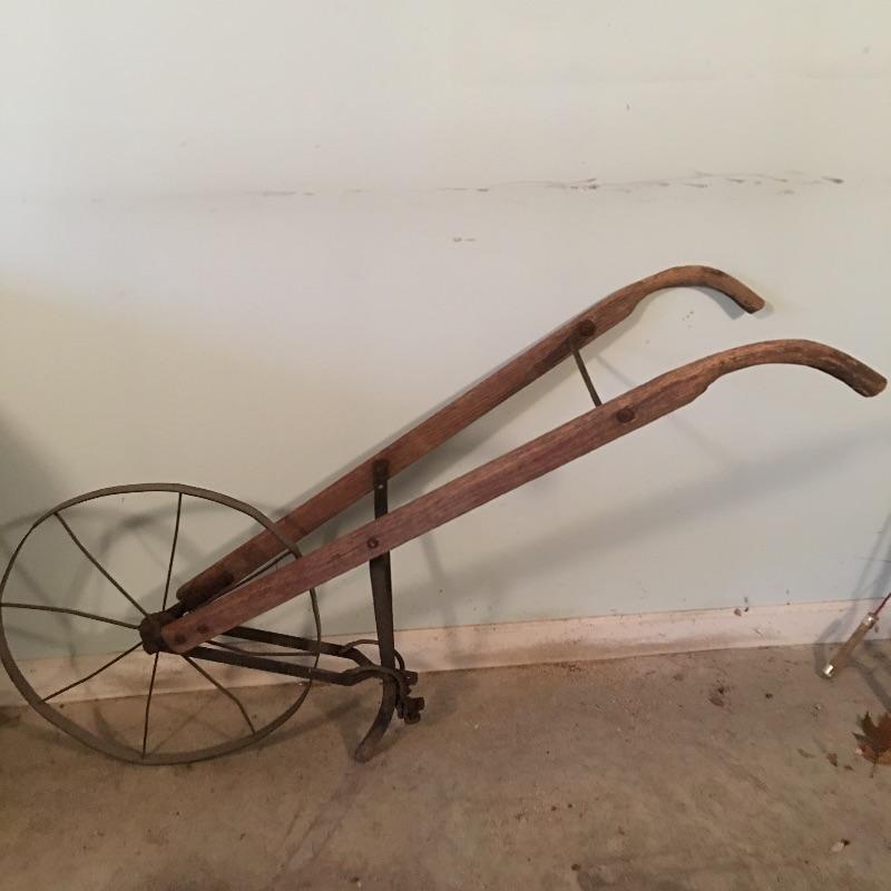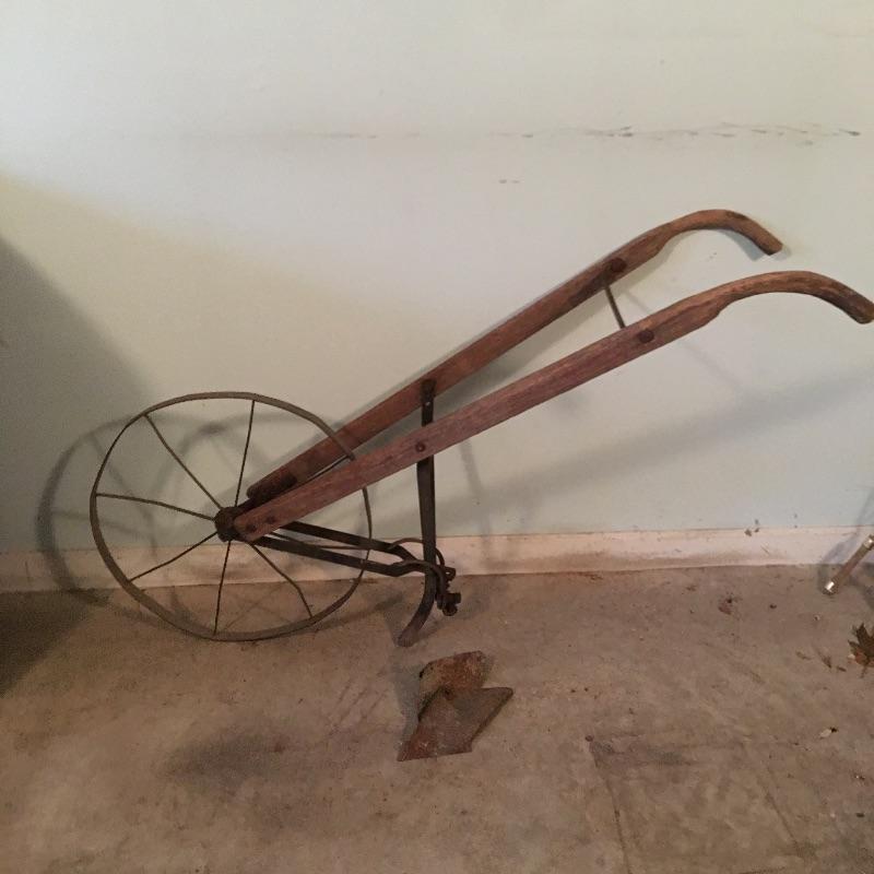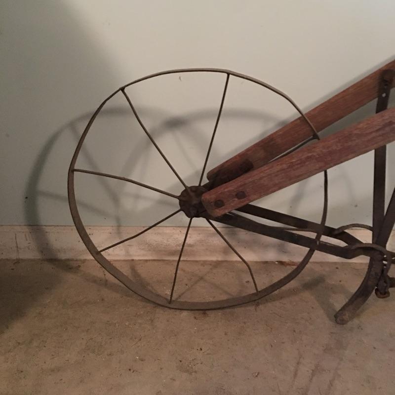 This vintage cultivator will look great in your garden as art. Cultivator has three blades that are not attached, so it is more for decoration. Cultivator measures 22” x 63”.