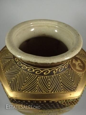 LOT 31B: LARGE JAPANESE SATSUMA VASE, HEXAGON BALUSTER STYLE, GOLD GILDED AND POLYCHROMED IN "SAMURAI" DECOR, CRACKLE GLAZE, MORIAGE DECORATION, HAND PAINTED, FISH HEAD MANUFACTURER MARK. MINOR PAINT LOSS. APPROX 12.25"H