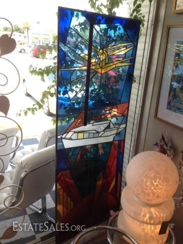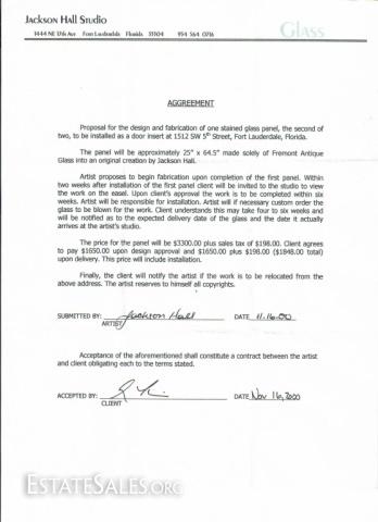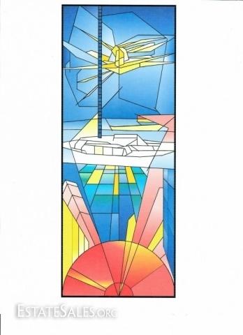 LOT 31C: JACKSON HALL ART GLASS STAINED GLASS PANEL, MADE OF FREMONT ANTIQUE GLASS, YACHT WITH SUN RAYS, CIRCA 2000, APPROX 64.5" X 24". WITH ORIGINAL CUSTOM ORDER CONTRACT DETAILING SALE PRICE OF $3300 AND ORIGINAL MAQUETTE.