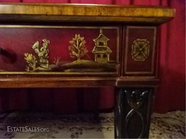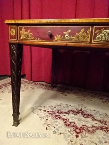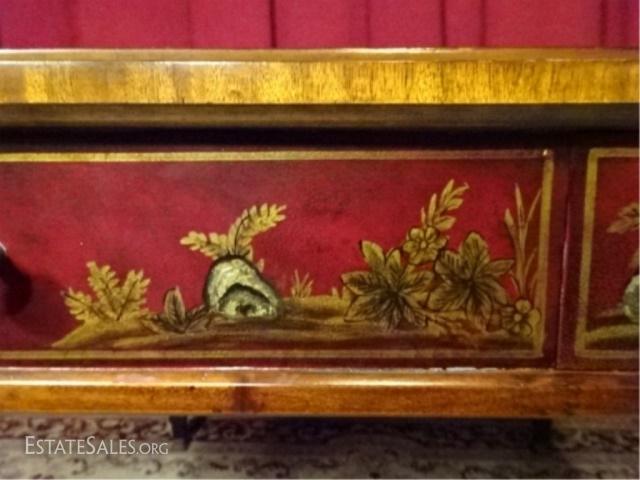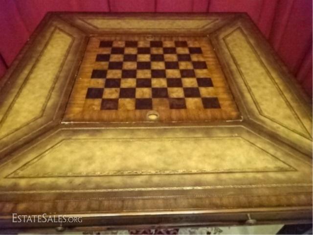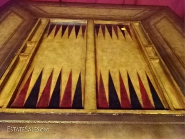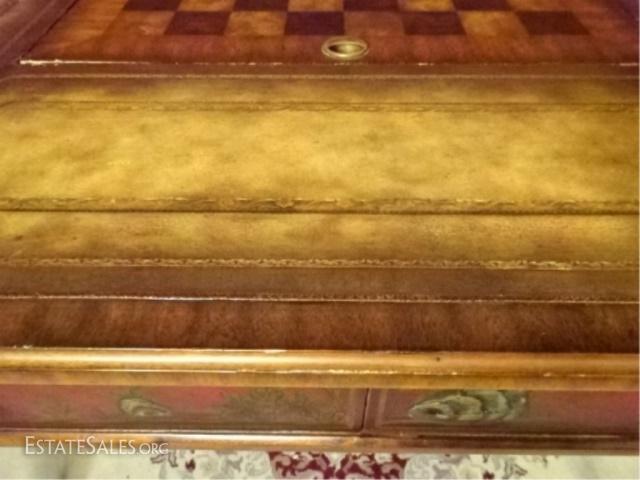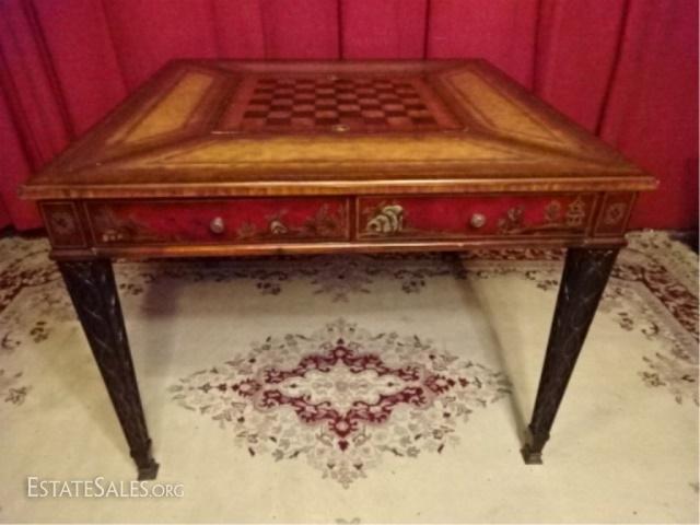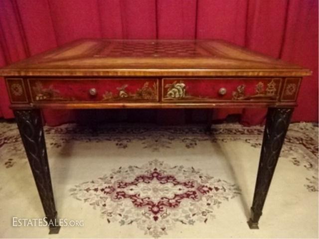 LOT 31D: MAITLAND SMITH MAHOGANY GAME TABLE. PAINTED DARK RED AND GOLD CHINOISERE FINISH. TABLE FEATURES LEATHER TOOLED INLAY TOP ON ALL SIDES AND A REMOVABLE CHECKERBOARD CENTER WITH A FELT REVERSE. EACH SIDE OF THE TABLE IS EQUIPPED WITH ONE DRAWER WITH A KNOB PULL AND A DRAWER FACADE WITH A KNOB PULL. TABLE IS SUPPORTED BY FOUR TAPERED LEGS WITH RIBBON DESIGNS. 40.0" W X 30.0" H X 40.0" D