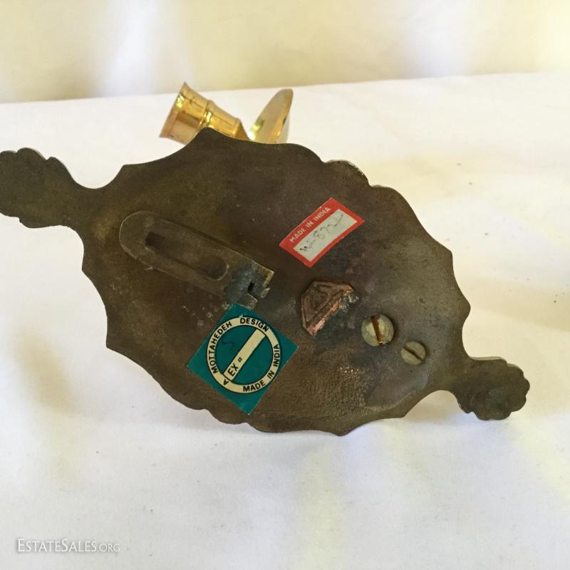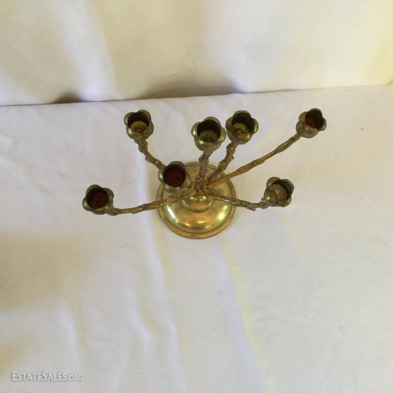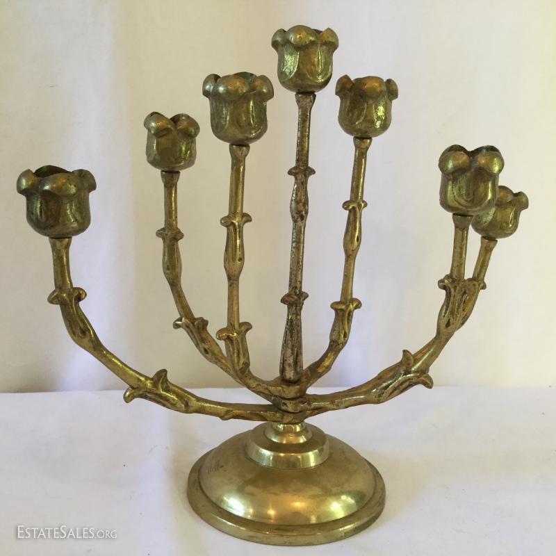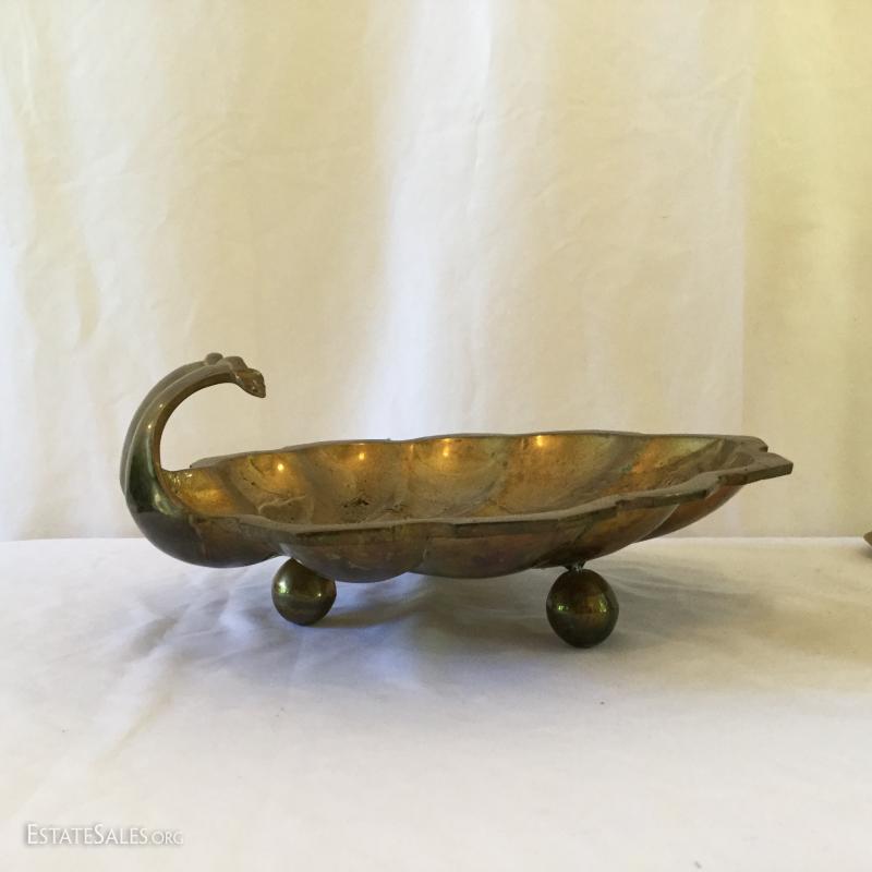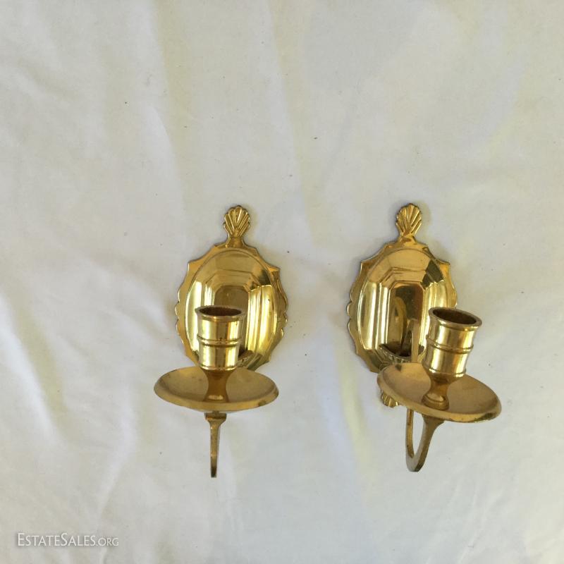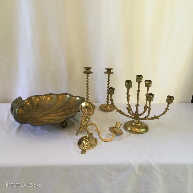 Large brass shell bowl. Very unique and makes great centerpiece. Lot also includes two matching brass candlesticks. Brass candelabra with adjustable arms, and two matching brass candle sconces,