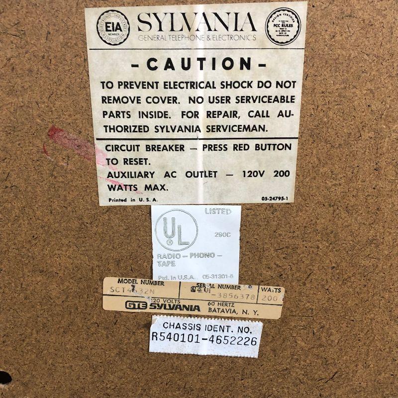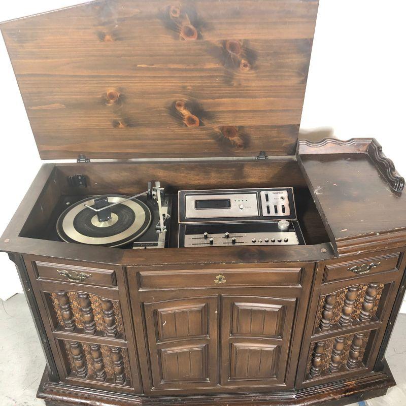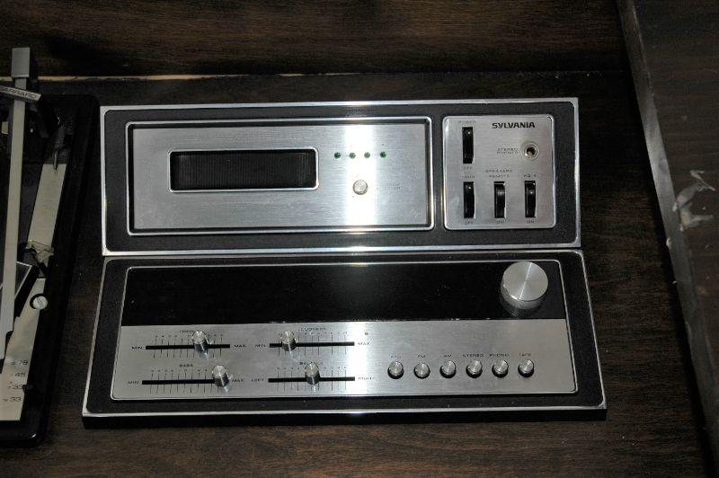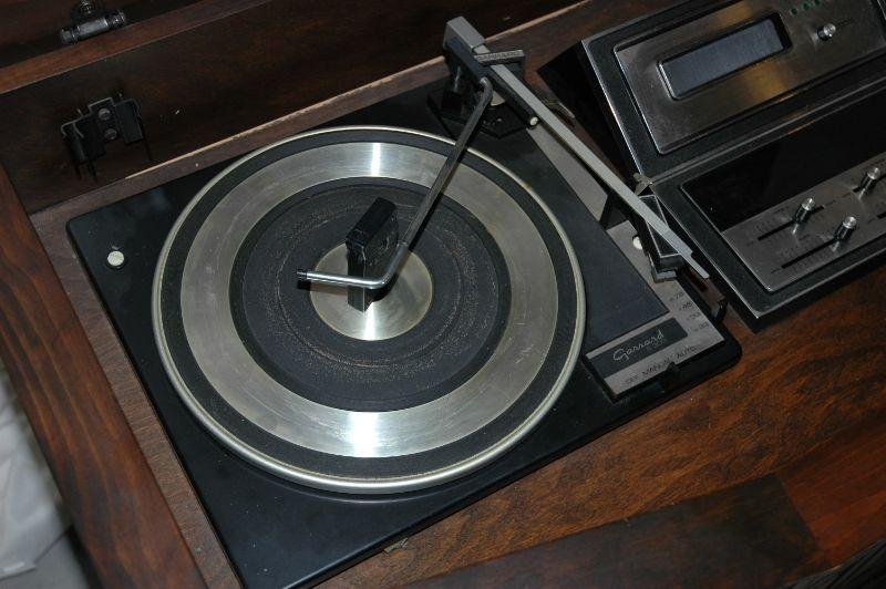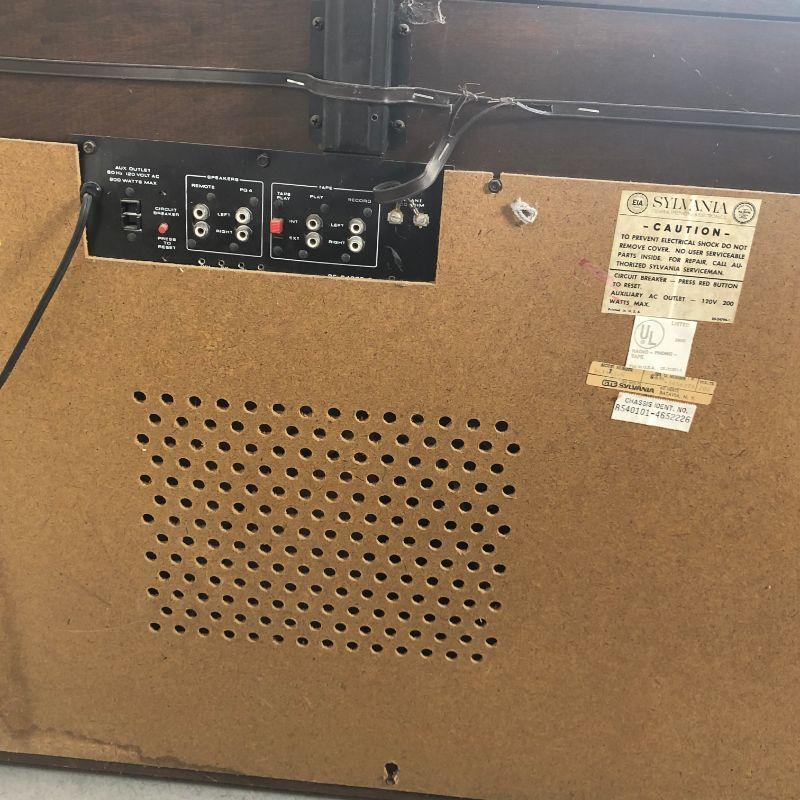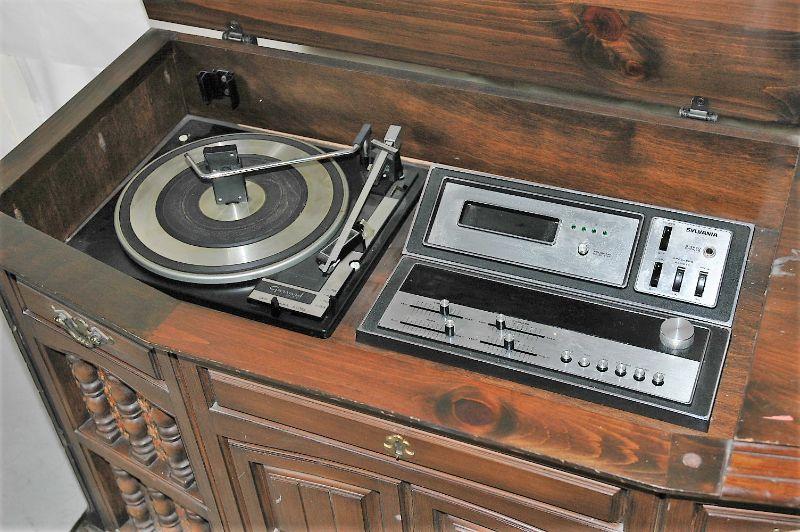 Sylvania 8 track tape player/radio/ and Garrard 6.300 record player ~ plays 33, 45 & 78 speeds, with 45 adaptor. Electronics work great, cabinet shows lots of scratches and wear. Wood top and base, plastic front facade. Tested, speakers have great sound. 43" wide x 17" deep x 28" high.
